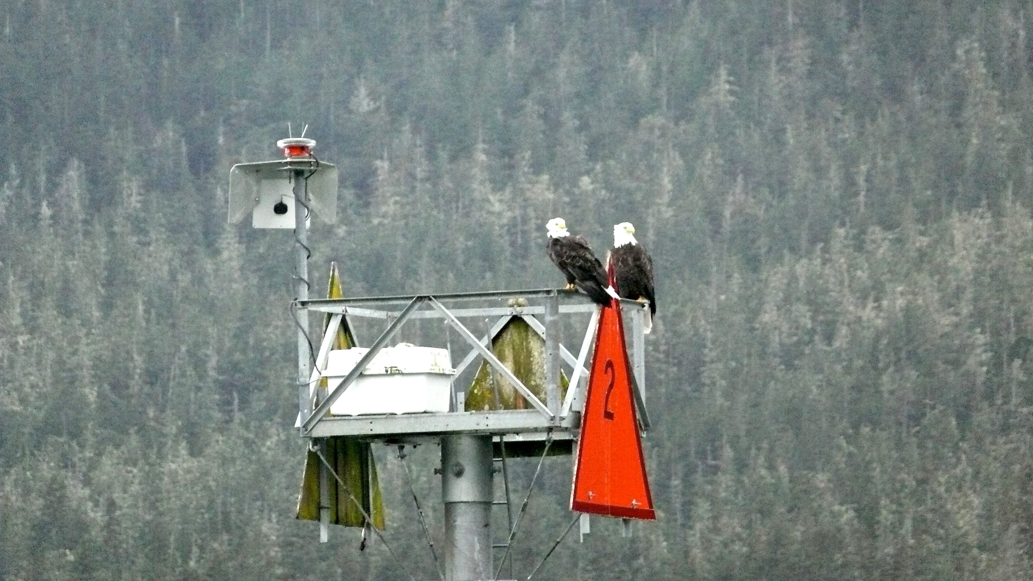 Aki should be as frustrated as me. The only dog she can smell is locked up in a fisherman’s truck. Otherwise, it’s all spawned out salmon the eagles and gulls that feed on them. She wisely ignores all. It’s the eagles that frustrate me. We have seen at least five this morning since walking onto the Sheep Creek delta. One flew right over my head as I focused at a dead silver salmon that had been wrapped in seaweed left by the retreating tide. The bird, a mottled brown immature bald eagle glided over us to snatch a chunk of salmon from the foot of a gull. Now it tears away at the carcass just a hundred feet away. I know that in these low light conditions the old camera I brought won’t capture any detail. I click a few frames anyway, walk to the channels edge and startled a harbor seal that had surfaced 20 feet away. A raft of Barrow Golden Eye ducks explode into flight as my old camera tries to focus on their escape. Two mature bald eagles, perched on a channel marker 200 feet away turn their heads as if to spare me more shame.