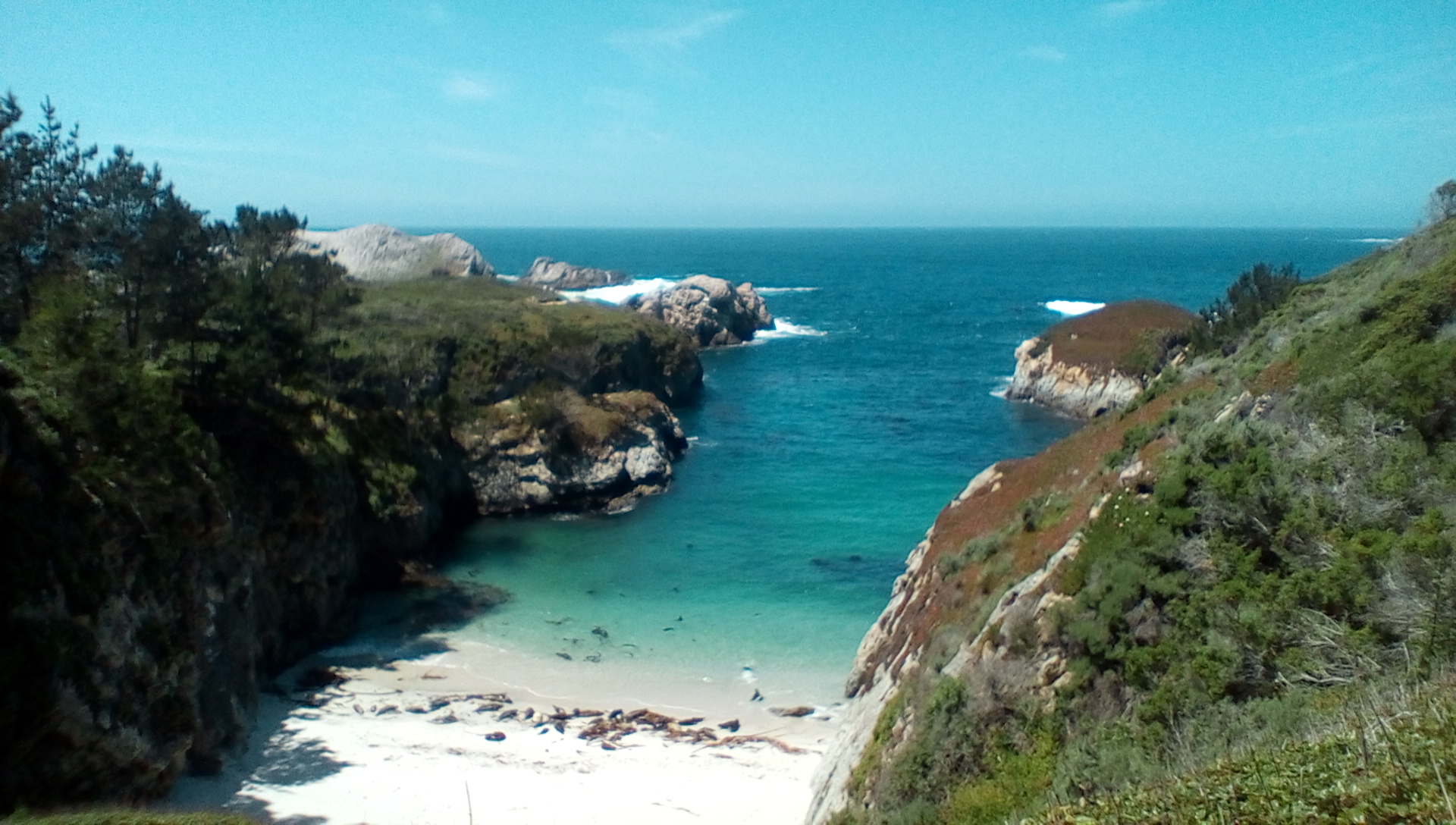 From the path to bird rock, we spot a score of harbor seals scattered on the China Cove beach. Some of the pups still wear the wrinkled skin of new borns. Those not sleeping on the beach play in the aquamarine water of the cove like kindergarteners at recess.