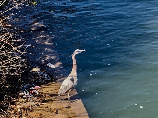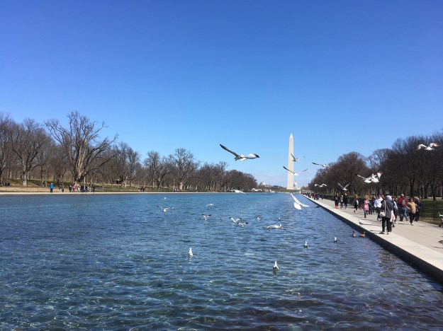 In a normal year the Tidal Basin entrance to the Martin Luther King memorial would be pink with cherry blossoms. But this year the the limbs of cherry trees reaching over the basin waters are still bare. The trees still have a stark beauty on this sunny afternoon. We find two great blue herons, apparently immune to the attentions of tourists, sunning themselves near the Jefferson Memorial.