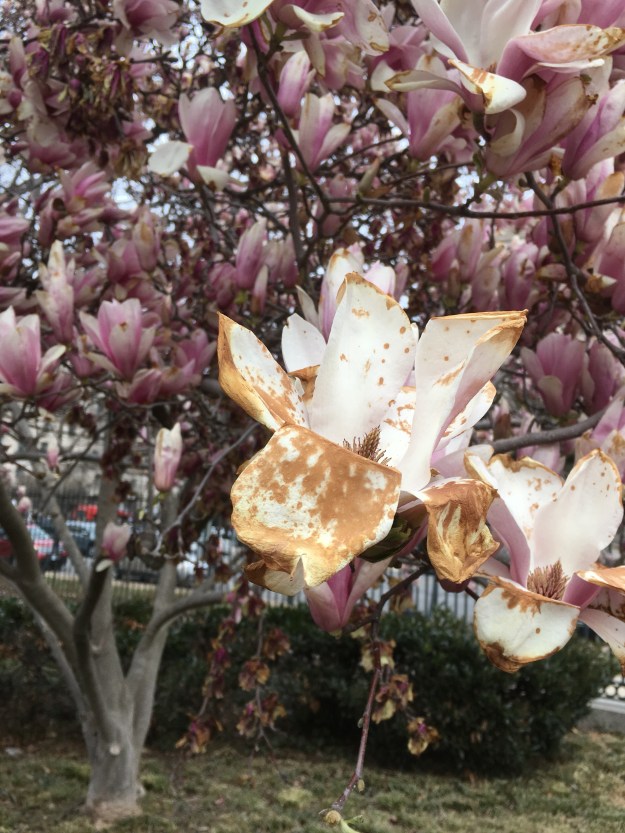 You have to admire the commitment of this magnolia tree to flower. Growing between a giant typewriter eraser and a confused bronze work by Miro, it set buds before last week’s snow storm. The resulting flowers have been browned by a series of freezing nights.