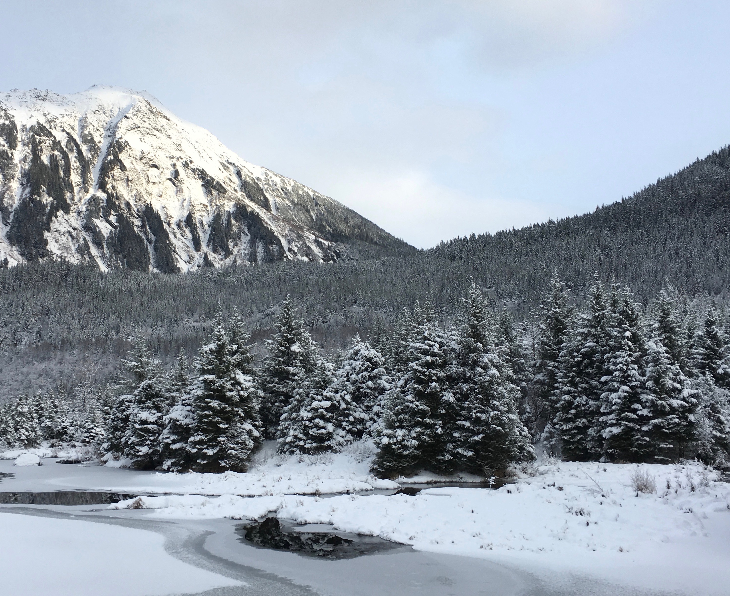 This is more like it little dog. By her actions, Aki must agree. I am crunching along the snow-covered edge of Mendenhall Lake, my boot sinking in three or four inches with each step. The dog charges ahead, her little paws only sinking in half as deep. Since we are near the glacier, the snow is too cold to form balls on Aki’s curly coat. But more often than not, patches of snow cling to her muzzle and cheeks when she looks back at me.