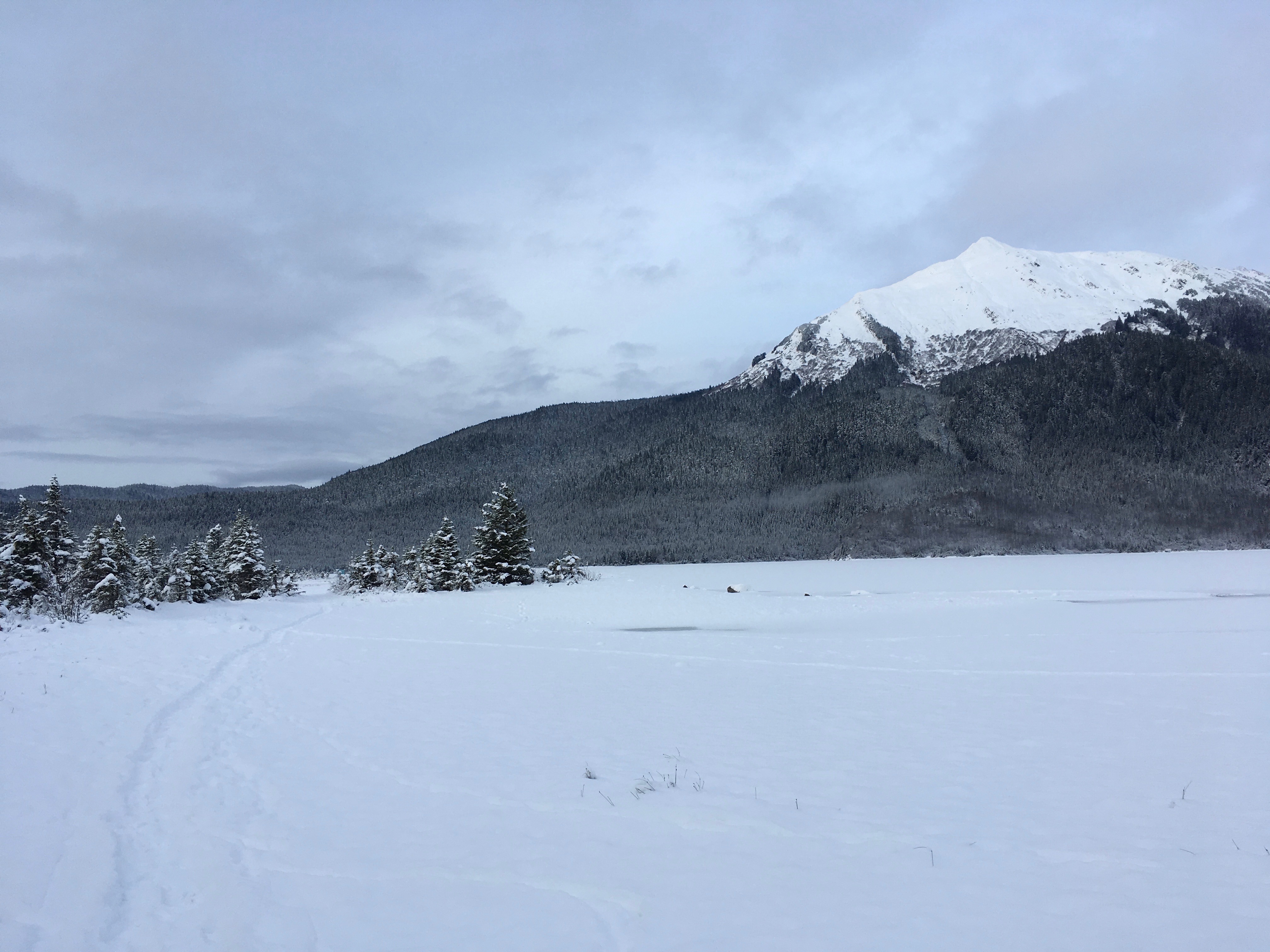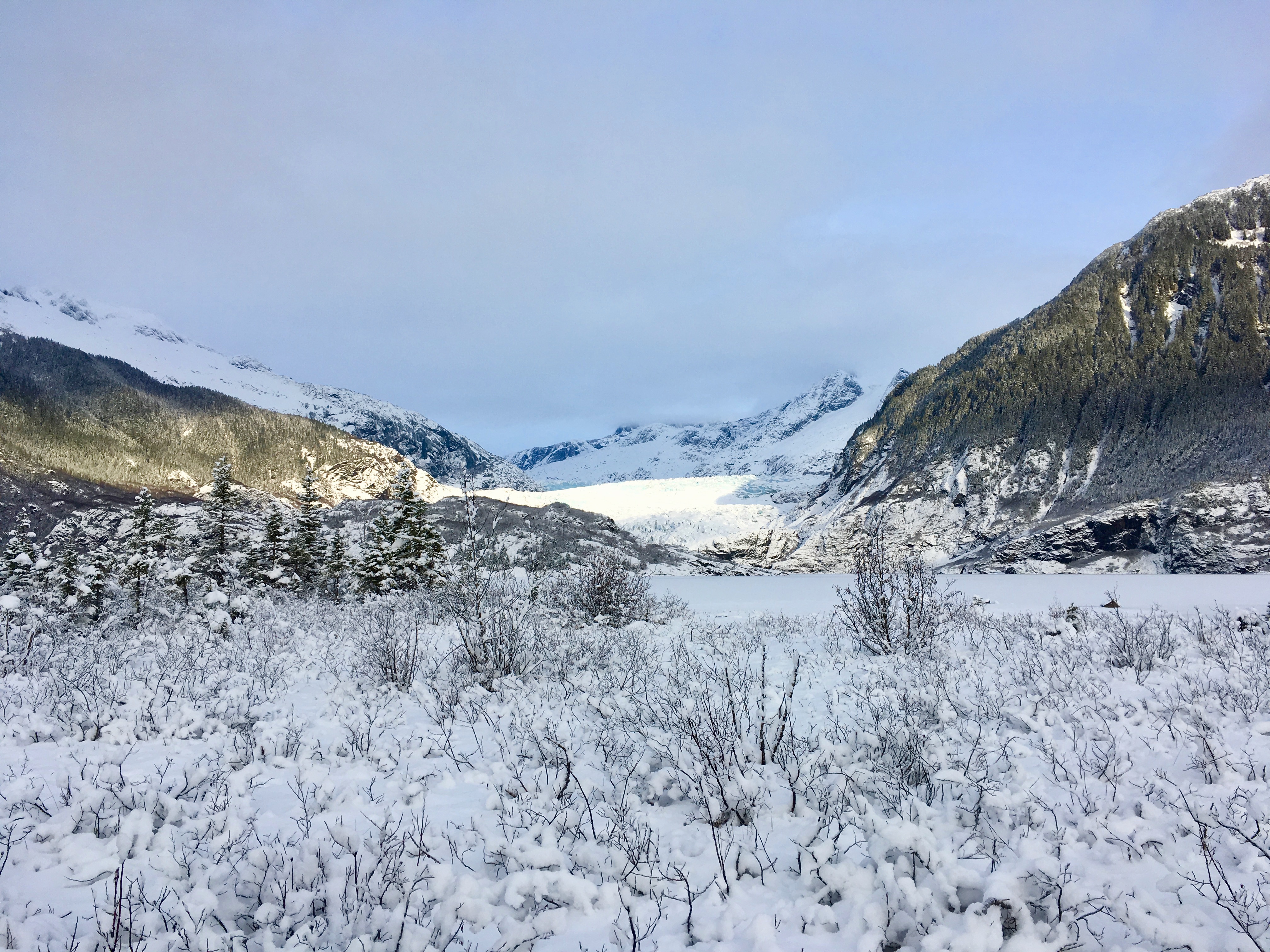 To our right the glacier snakes beneath the Mendenhall Towers. She is snow white except for sections of exposed aquamarine-colored ice. I wish I had brought skis. But then I may have been tempted to slide onto the still-too-thin lake ice.