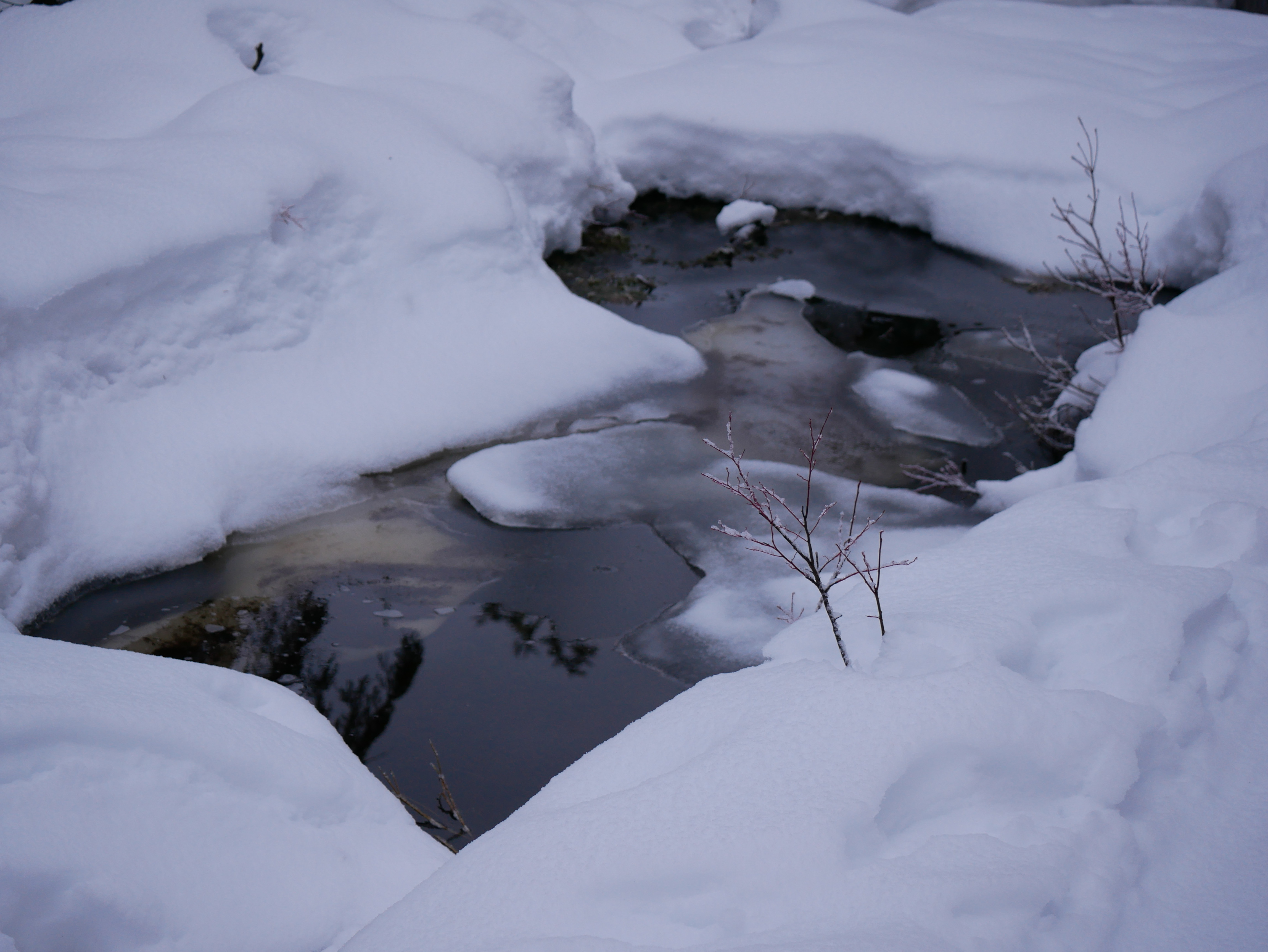Scattered snowflakes are falling on this mountain meadow. An hour ago the sun shone here. The deer that left tracks on the trail might have stood in the sun. Did he stretch his neck in happiness the sun warmed his hide?Aki, who has known only snow on this walk, ignores the question.