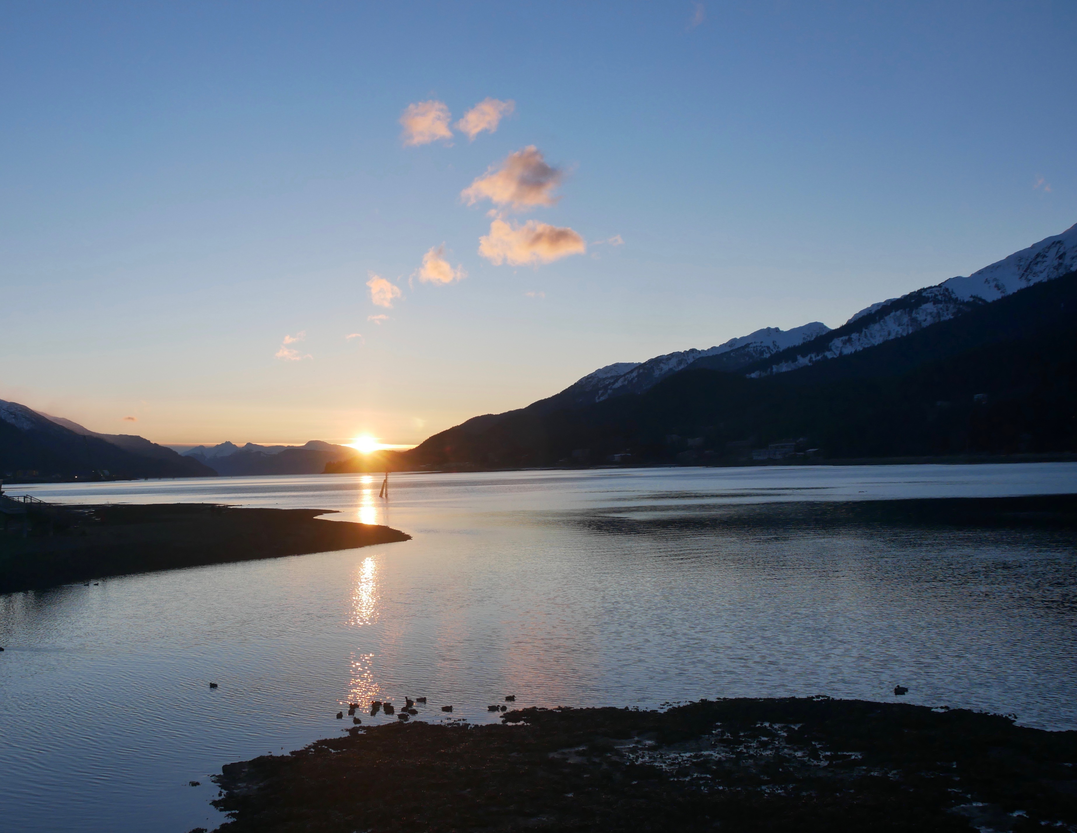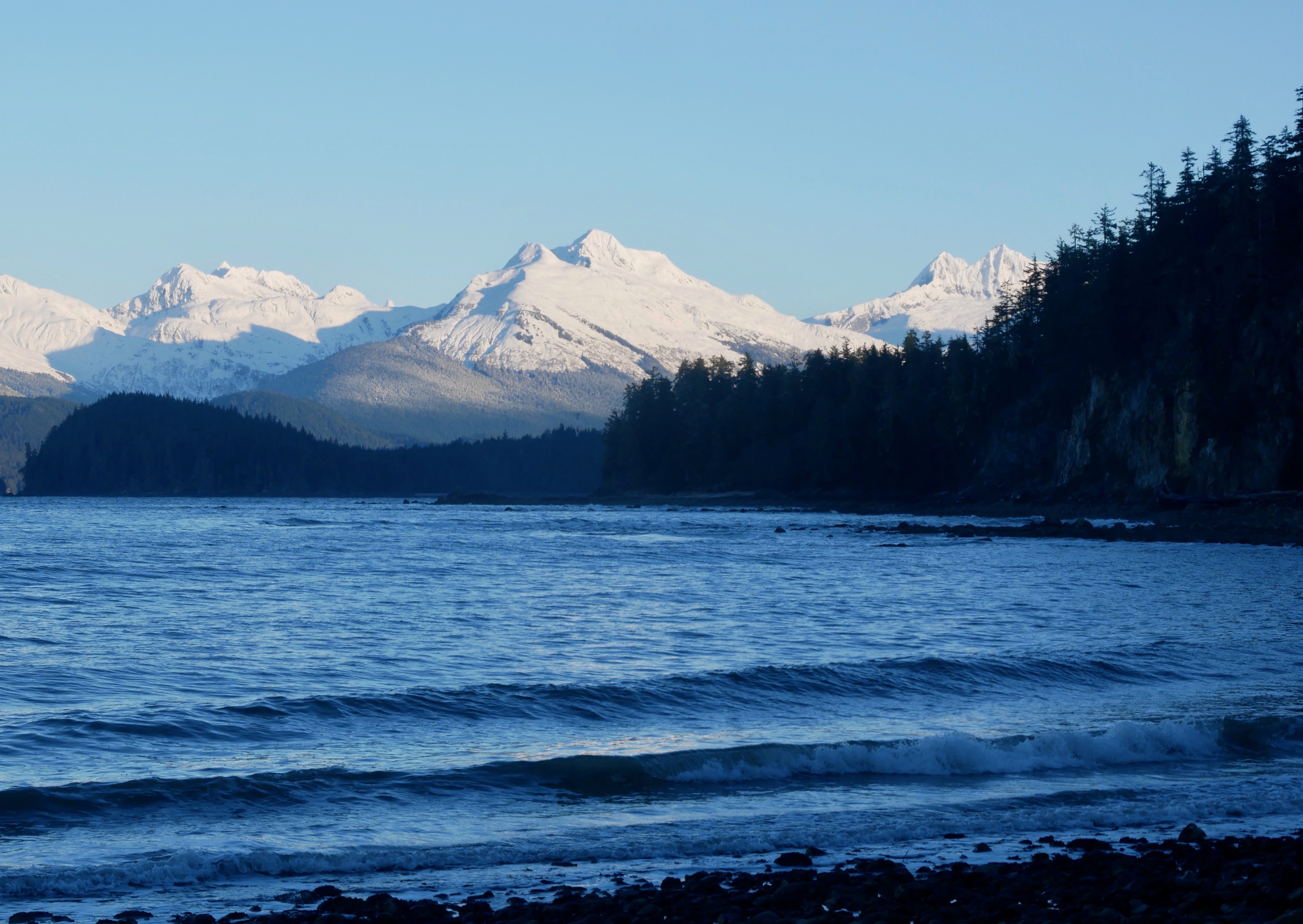 We are too early to see the sun light up the beach. But it does illuminate the mountains above the icefield. It also warms some offshore rocks and the gulls resting on them. Two golden eye ducks, lit by the same streak of sunlight, splash down near the rocks. It is so cold that I expect them to paddle over to the gulls’ rocks. But they are content to bob up and down in the surf. I, hands cold from handling the camera, body chilled in spite of multiple layers of clothing, feel very much the winter outsider.