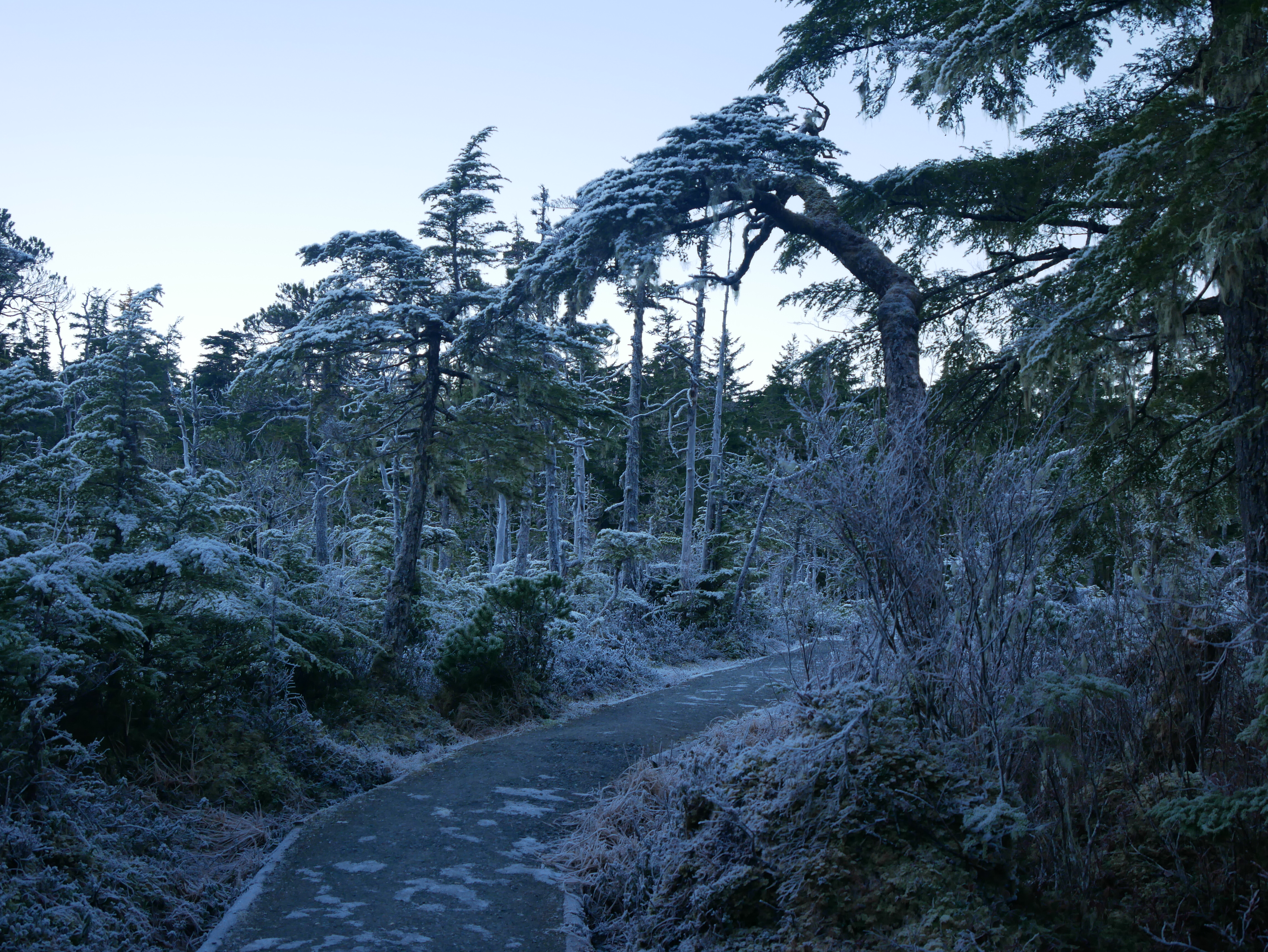 In a dusk-like gloam we drive out to North Douglas Island where it is calm and 15 degrees F. Last night’s wind knocked the frost from the trees in Downtown Juneau. But frost feathers that still cling to the roadside brush near the trailhead.
