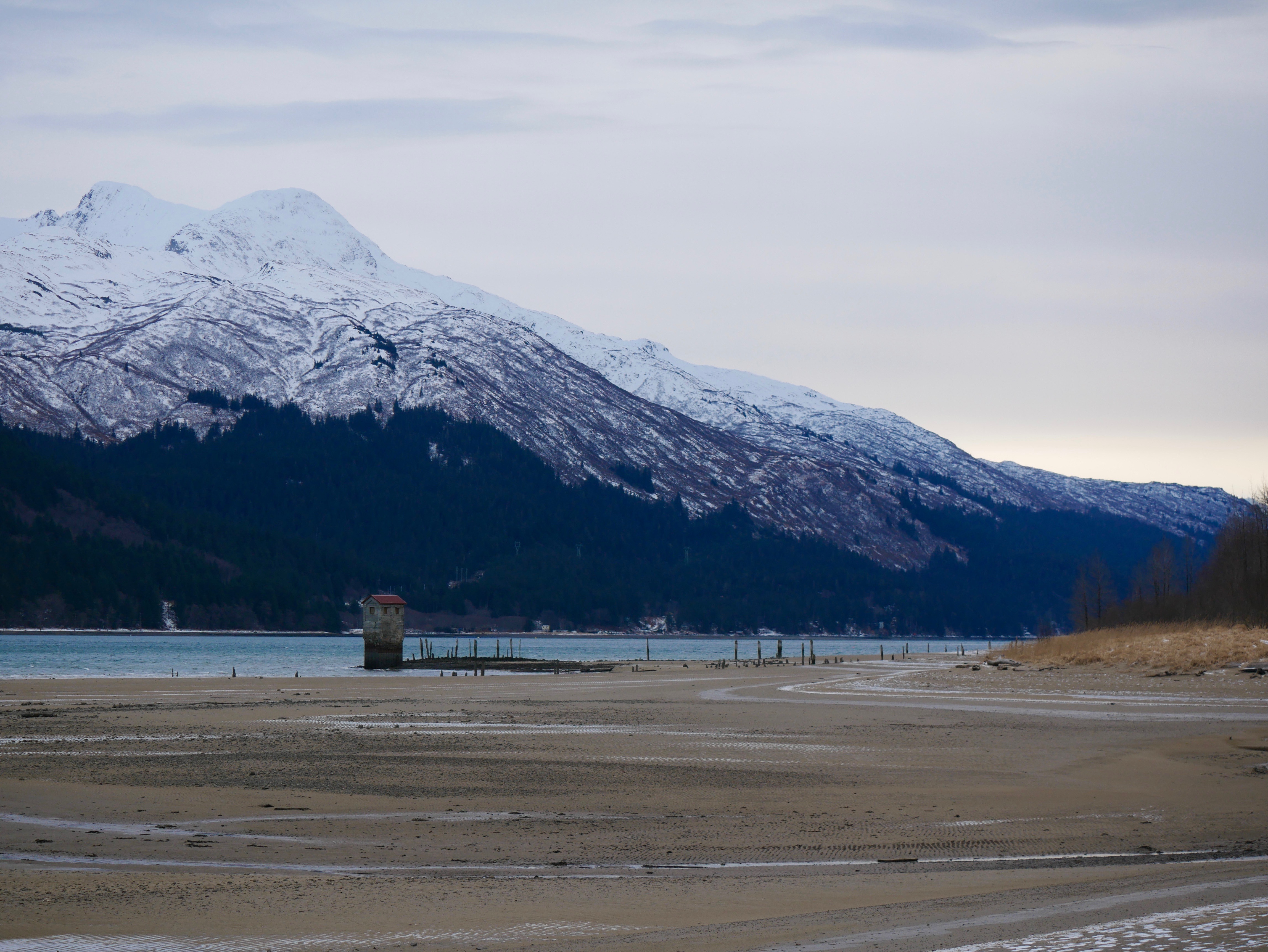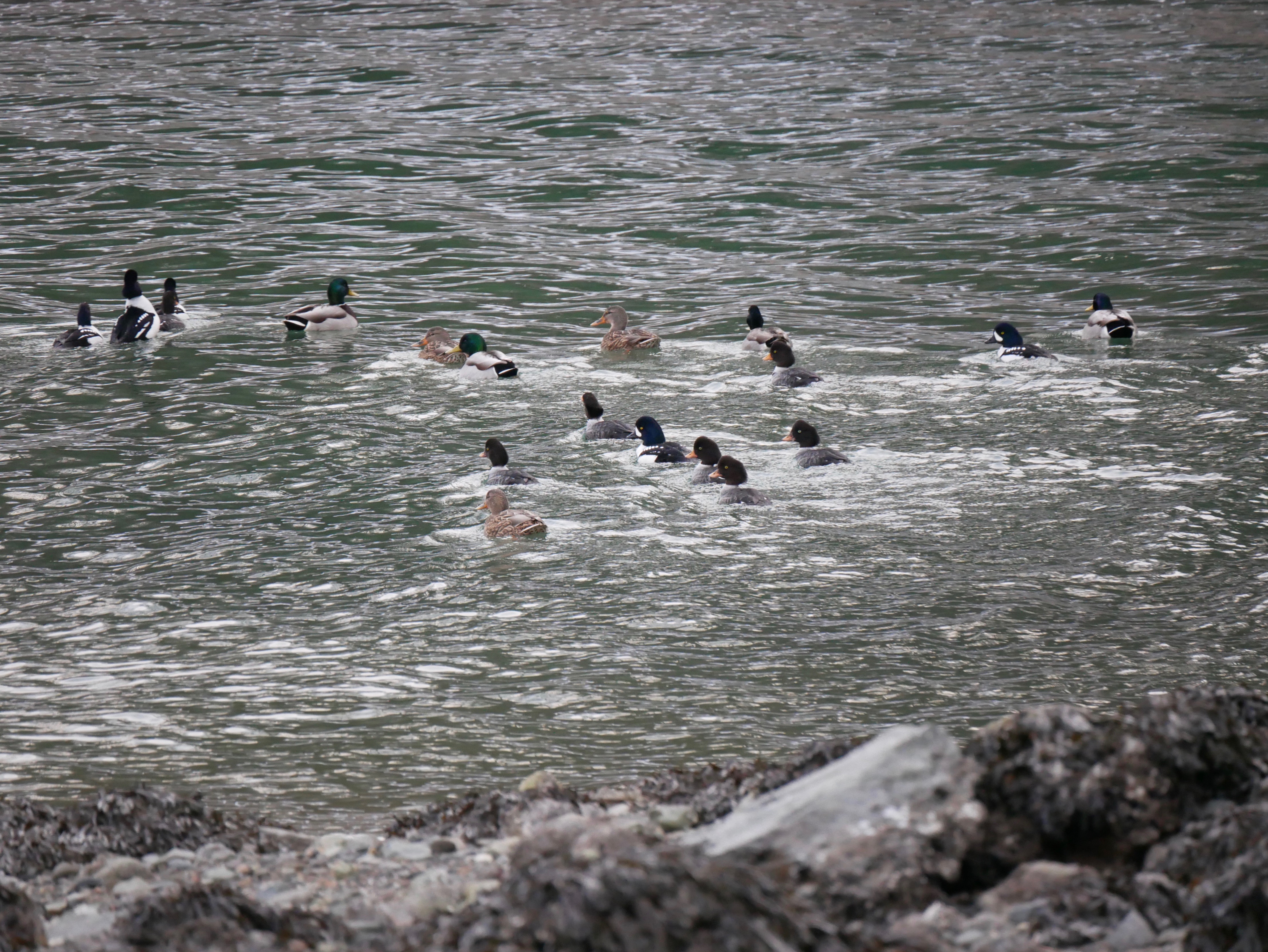 We walk on a path parallel to the beach until reaching the little bay created when the Treadwell Mine tunnels collapsed. There, close up against the rocky shore, a mixed raft of mallards and golden eye ducks find shelter from the wind.