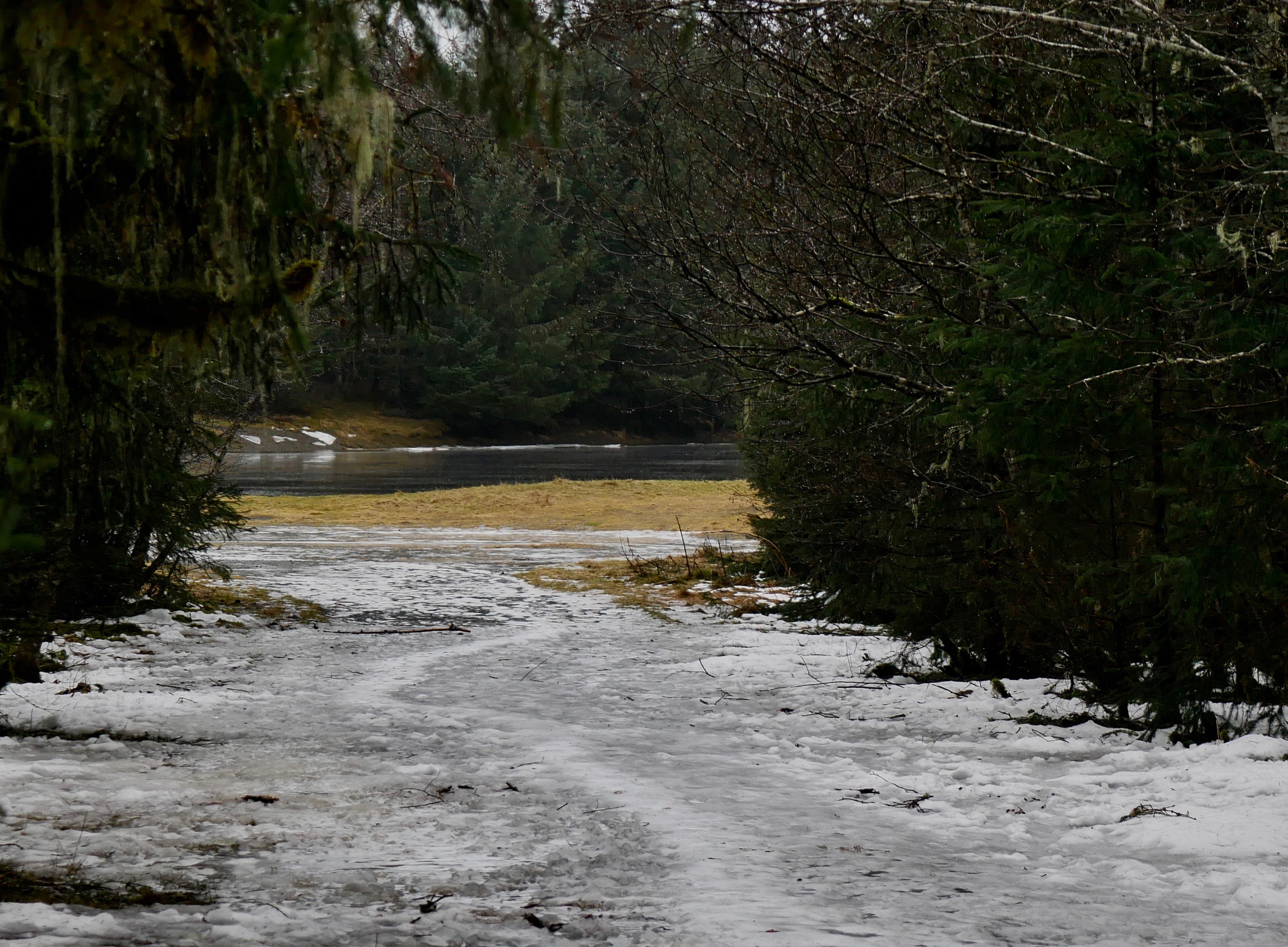 On one of January’s last days it’s 37 degrees above zero. Persistent rainfall has eliminated snow from the forest floor except where it has been packed into ice by foot traffic. You see, this week Winter left Alaska to holiday below the 49th parallel. Subzero temperatures made worst by strong winds have people in the Lower 48 are penned down in their homes while we watch our ski trails melt in the rain.