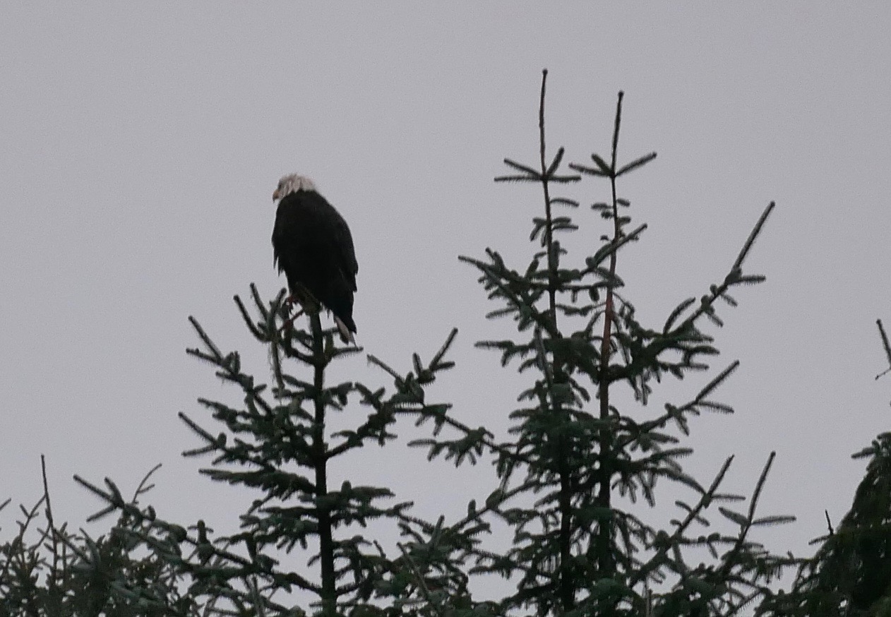 Aki and I head out to the Fish Creek Delta looking for distractions from the weather. A mature bald eagle, feathers soaked by rain, has positioned itself above to pond. Last week the pond was capped by a solid layer of ice. The fractured flows that remain float up and down with the tides.