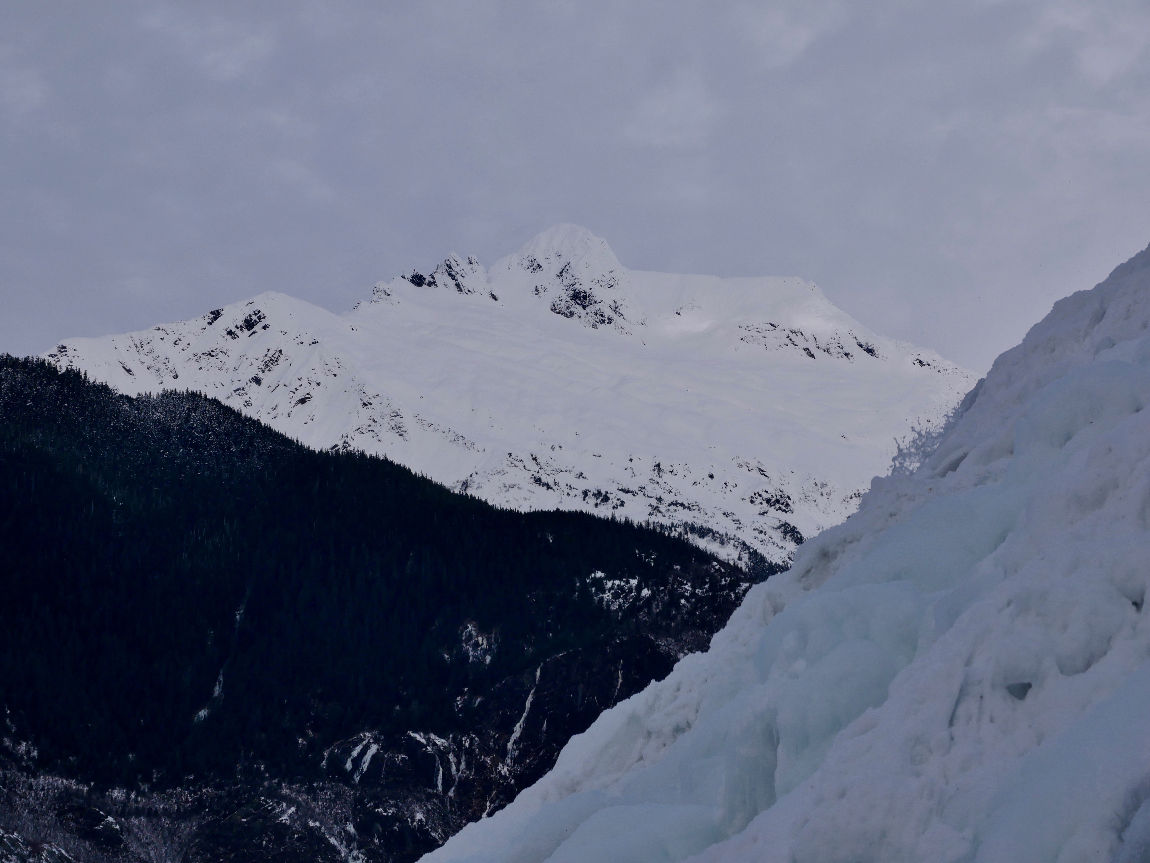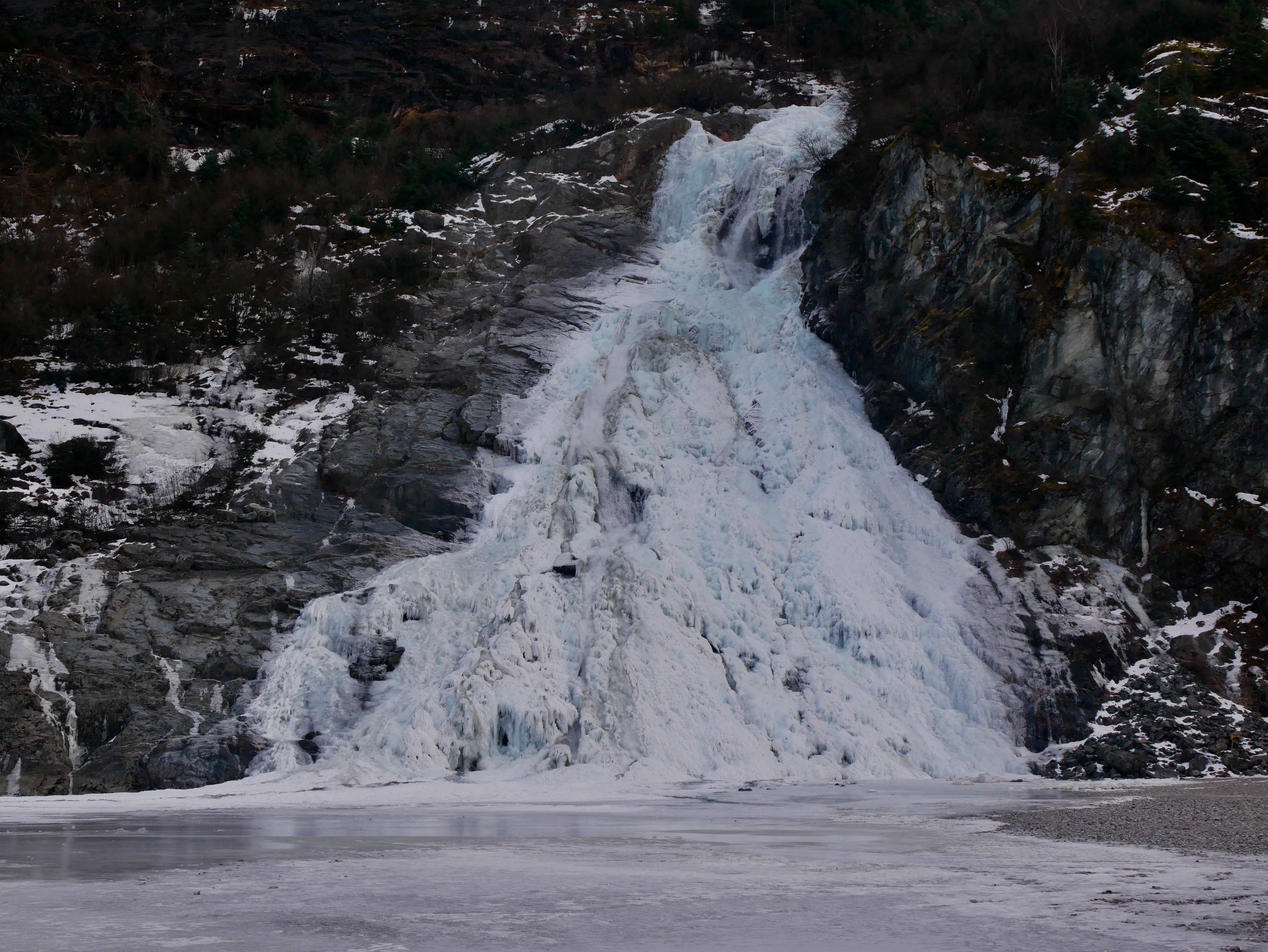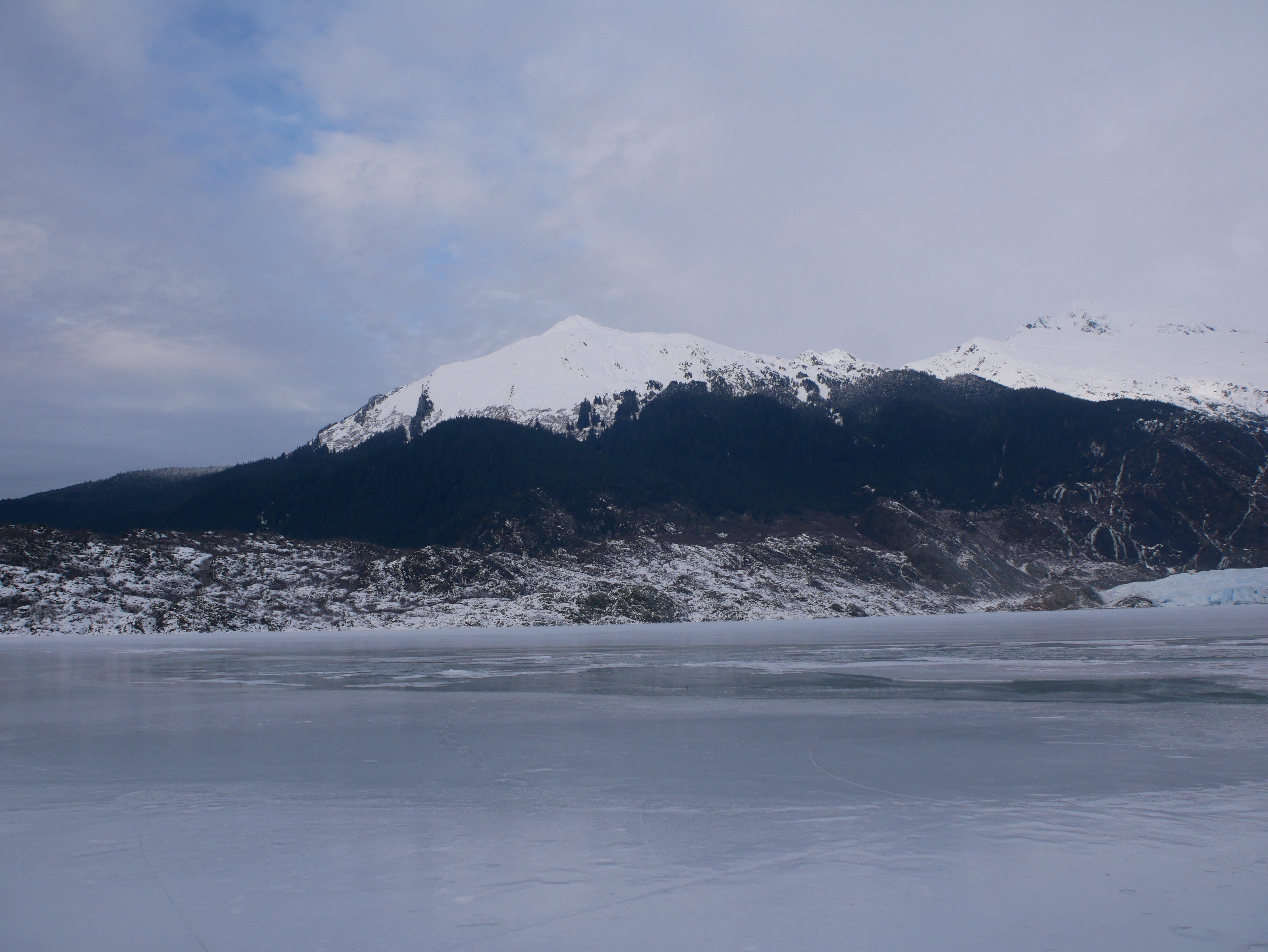 Three college-aged folk just stepped onto the lake ice. They shuffle their feet to test for cracks. When reassured by silence, they start the 1.2-mile walk the face of Mendenhall Glacier. I am tempted to follow them. Our recent stint of cold weather set up the ice nicely for walking. Then there’s the patch of dark blue ice that might be the opening to a crevasse. But we still swing away from lake and take the trail to Nugget Falls.
