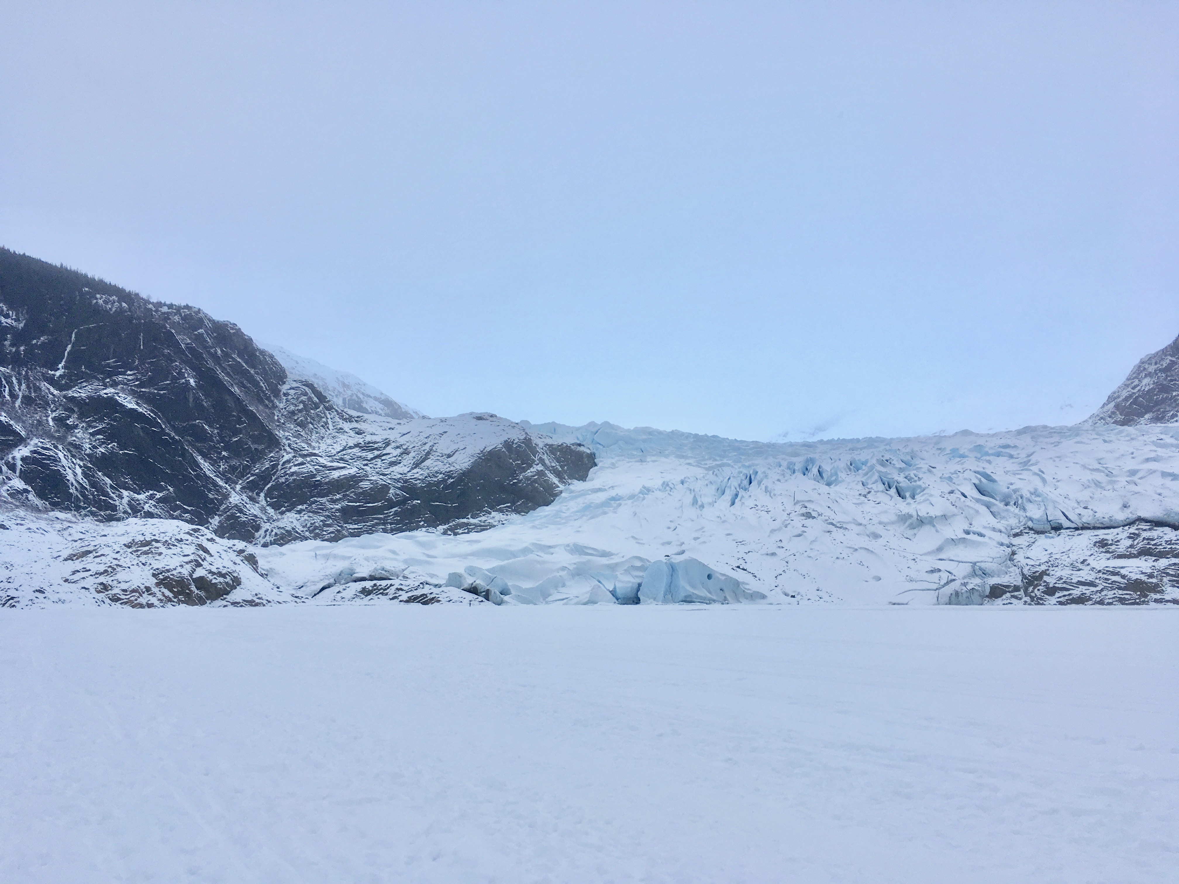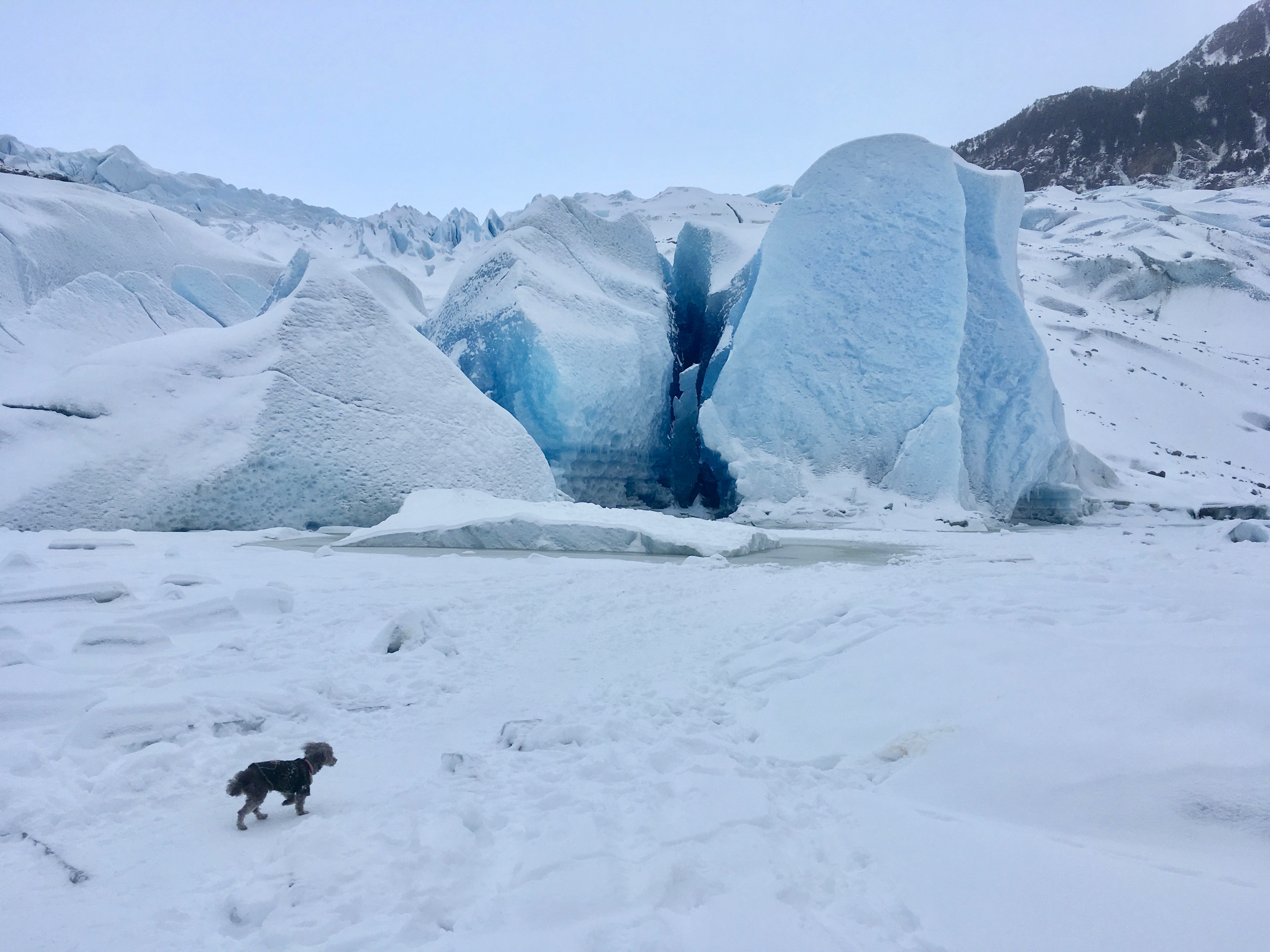 Lured by promises of a new ice cave, Aki and her humans headed out to the toe of Mendenhall Glacier. It’s been snowing all day, making it easier to ski the 1.2 miles across Mendenhall Lake to the glacier. Those of us on skis used a soft track set by previous skiers. The little dog found a superhighway pounded flat by walking pilgrims.