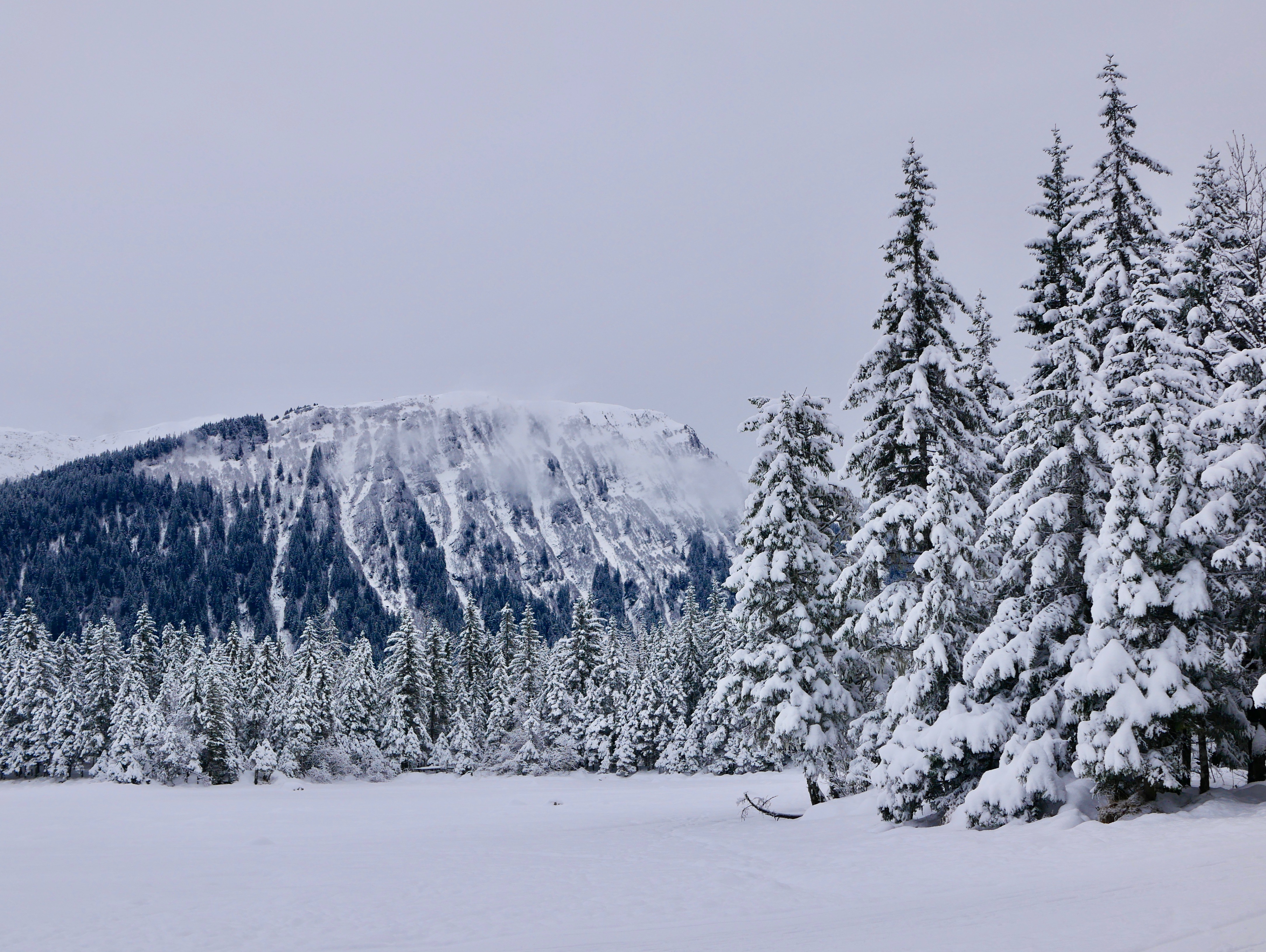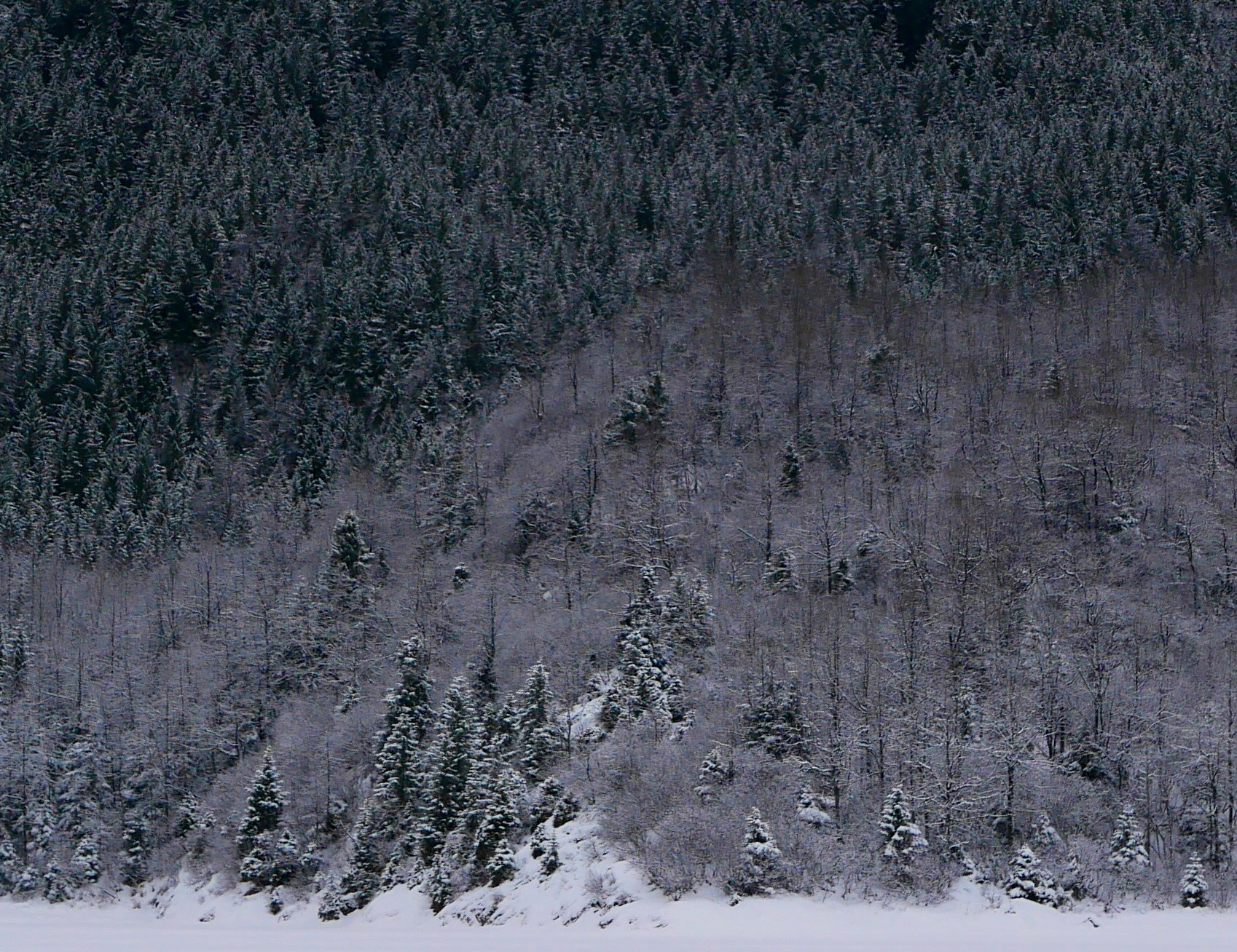 A flat light dominates the lake and the mountains that surround it. I miss the sunshine and blue skies that we enjoyed during our last visit. But the new snow that clings to spruce trees and bare-branched alders provides its own bright beauty.