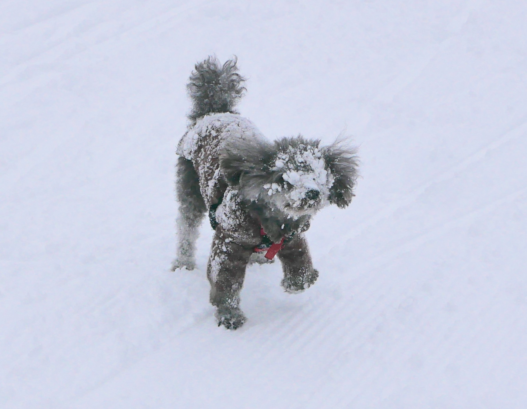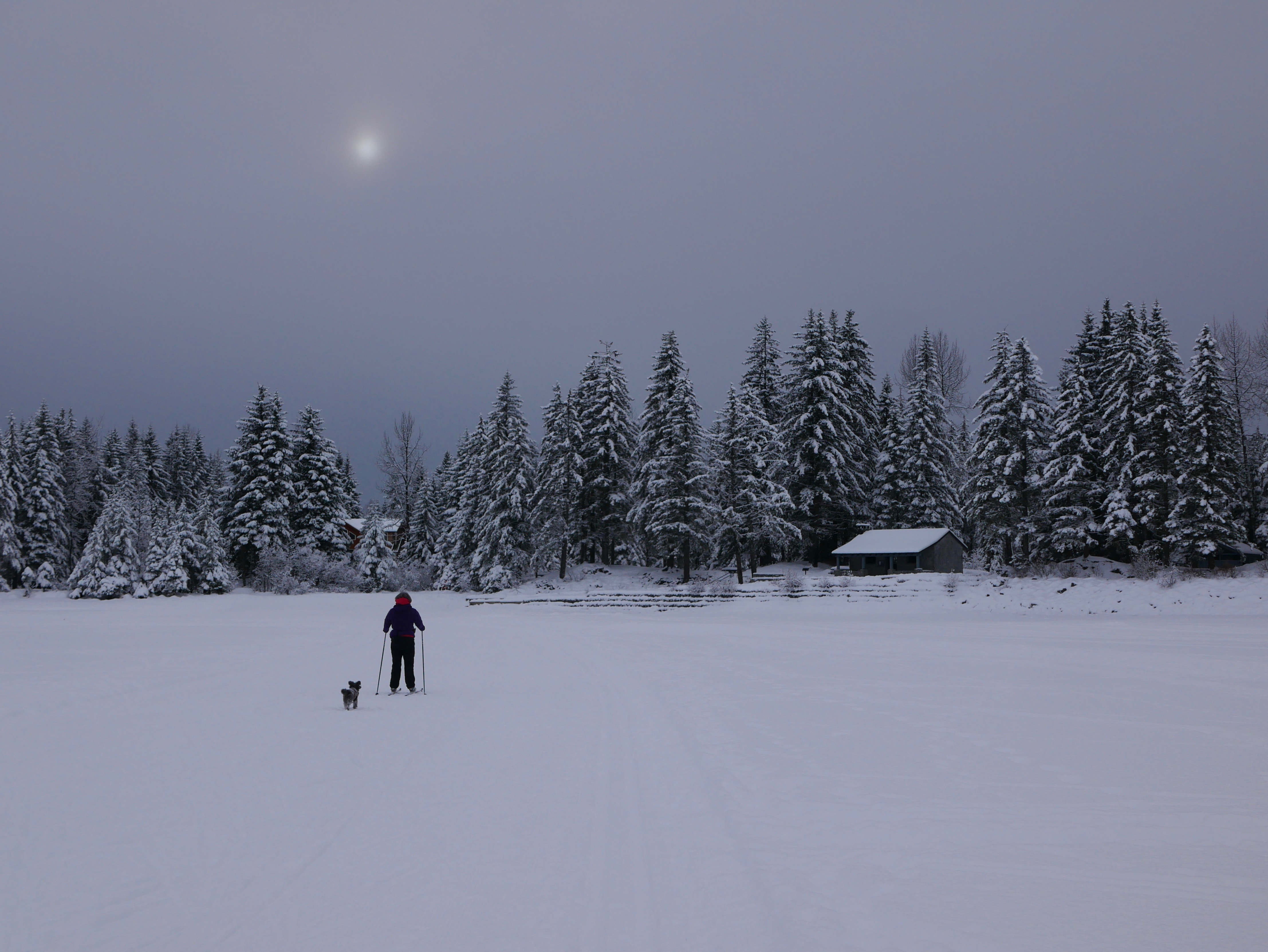 Because the skiing is still good here, the little dog and I have returned to Mendenhall Lake. Last night a half-a-foot of snow fell. But thanks to the ski club groomers, we have a well-packed trail. Otherwise Aki’d be wallowing in soft snow.