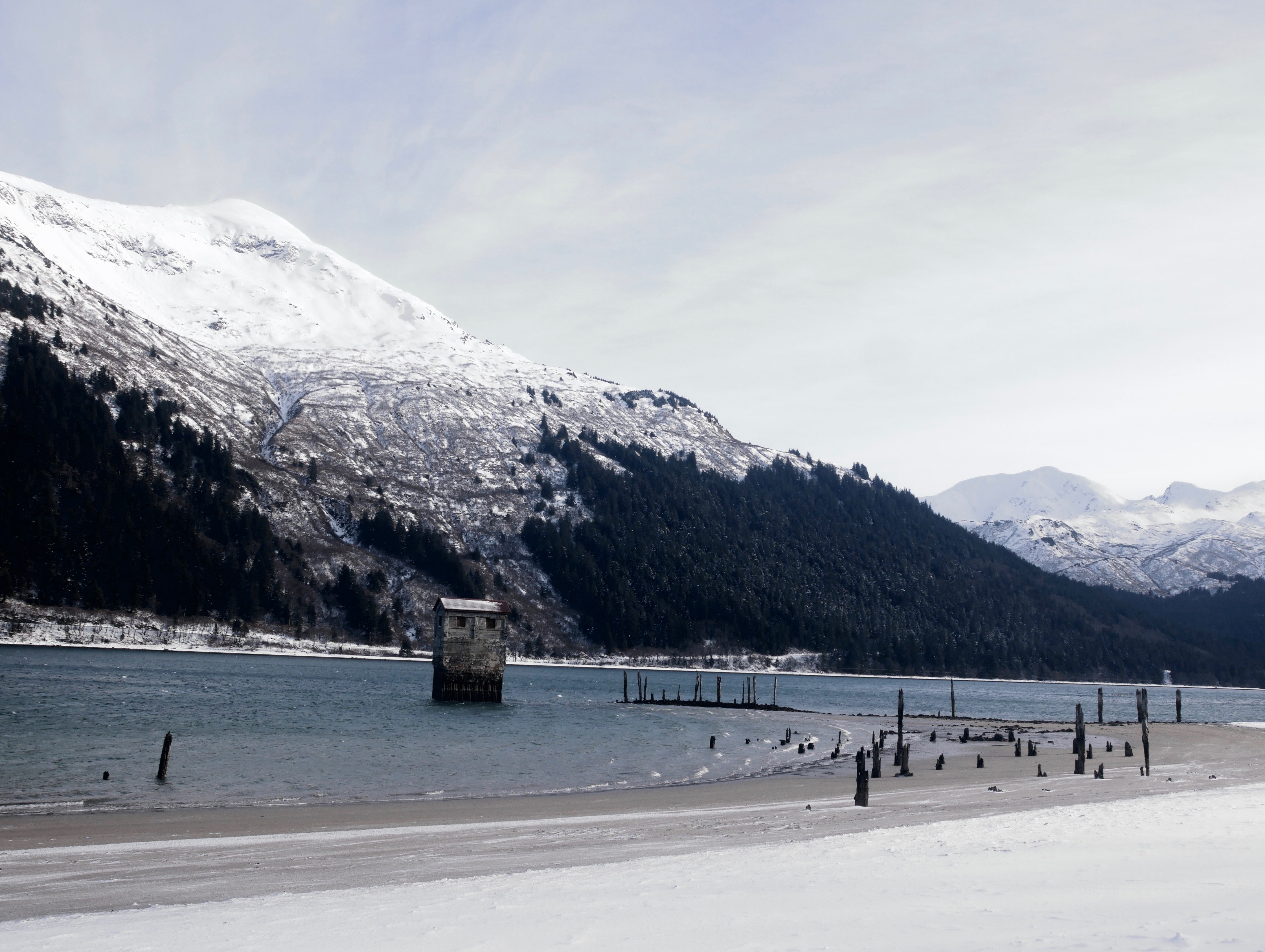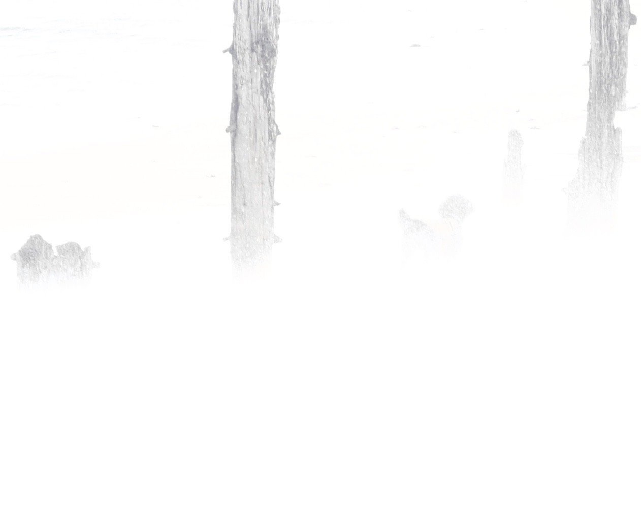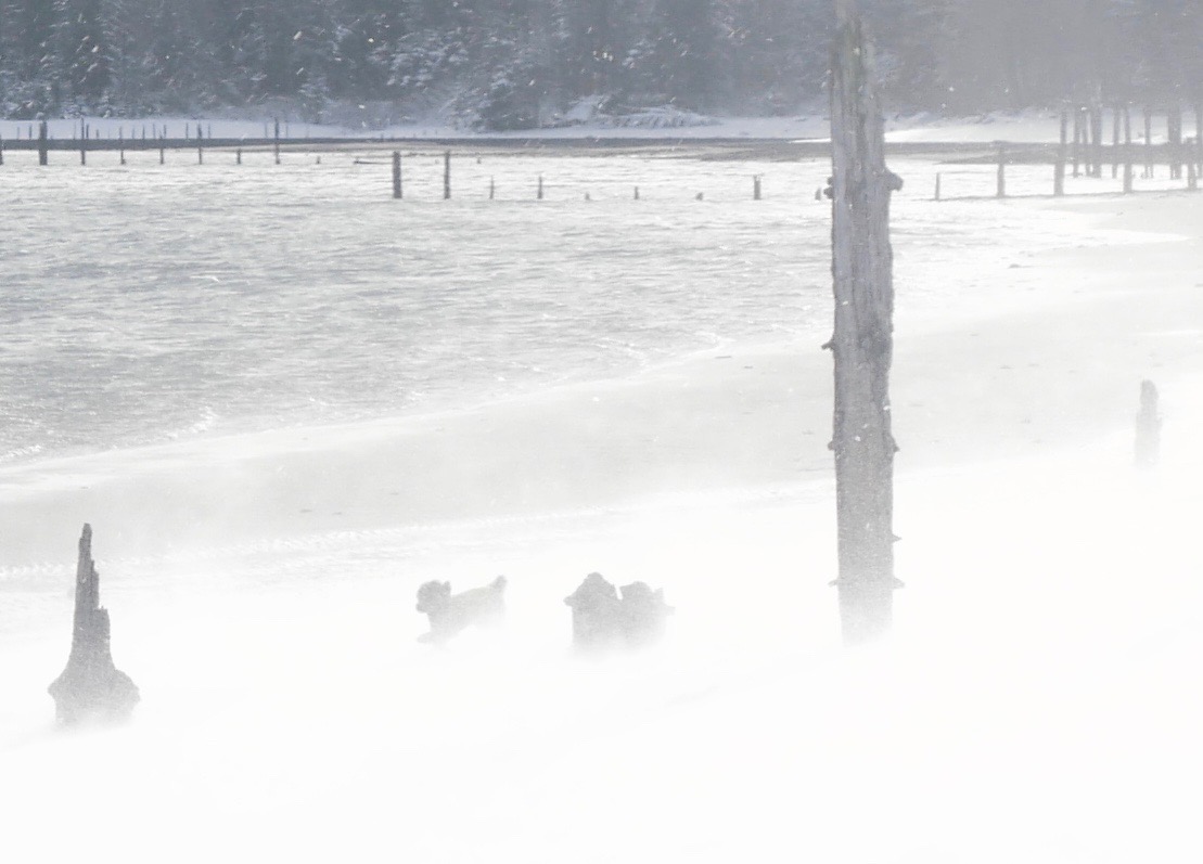The poodle-mix charged down the beach as if in a race with the streams of windblown snow that skidded over the sand. She disappeared for a moment in a whiteout. Seconds later I spotted her sheltering behind a weathered piling. When the wind dropped she charged back to me and then took a trail off the beach. That’s the smart move little dog, I said as I followed her into the sheltering woods.
