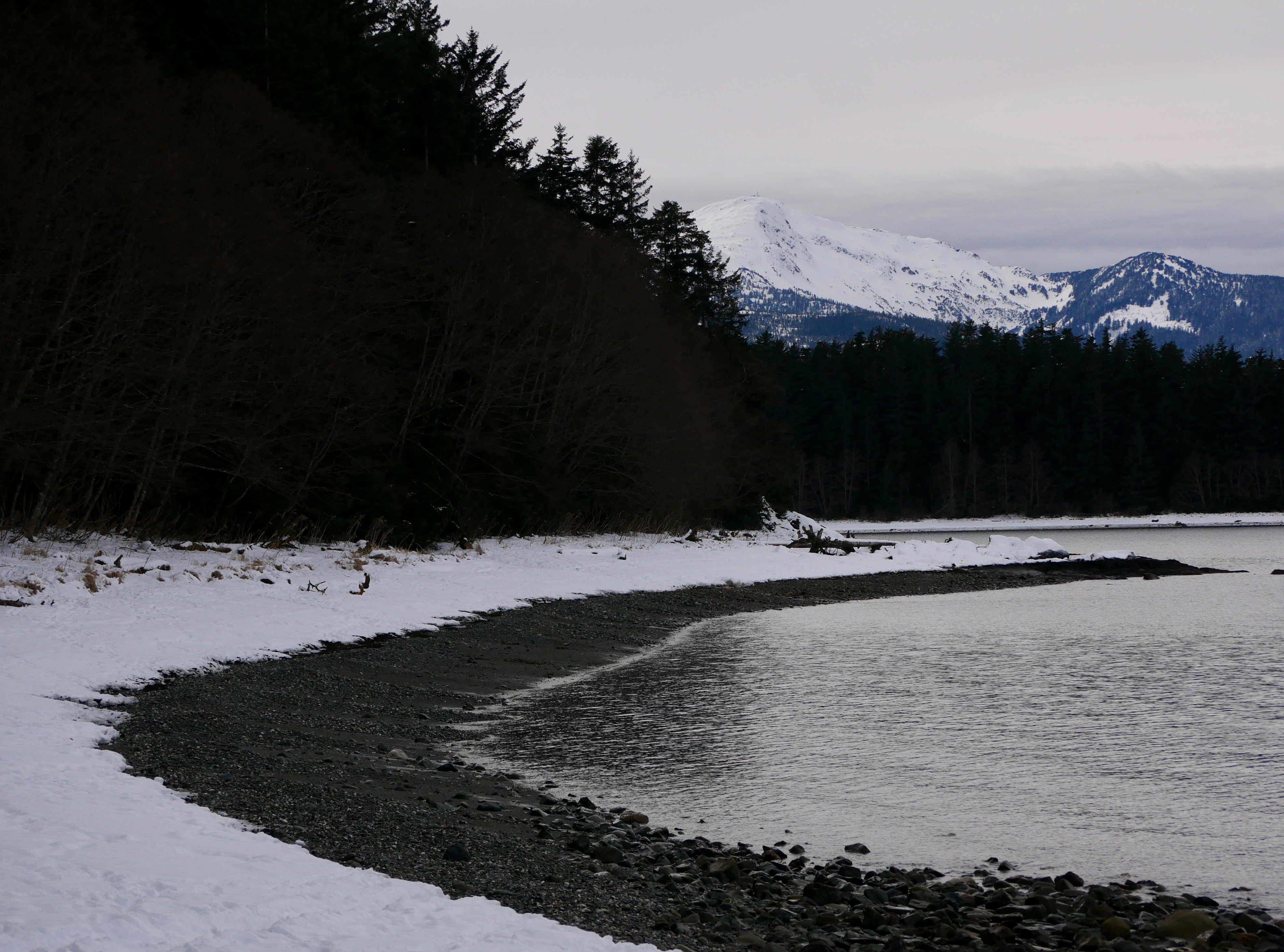 Aki and I are enjoying the Rain Forest Trail. She got to play with a German Sheppard who was nosing around the parking lot when we arrived at the trailhead. Energized, she runs over the packed snow of the trail. I try to keep pace, ignoring the beauty of the forest.