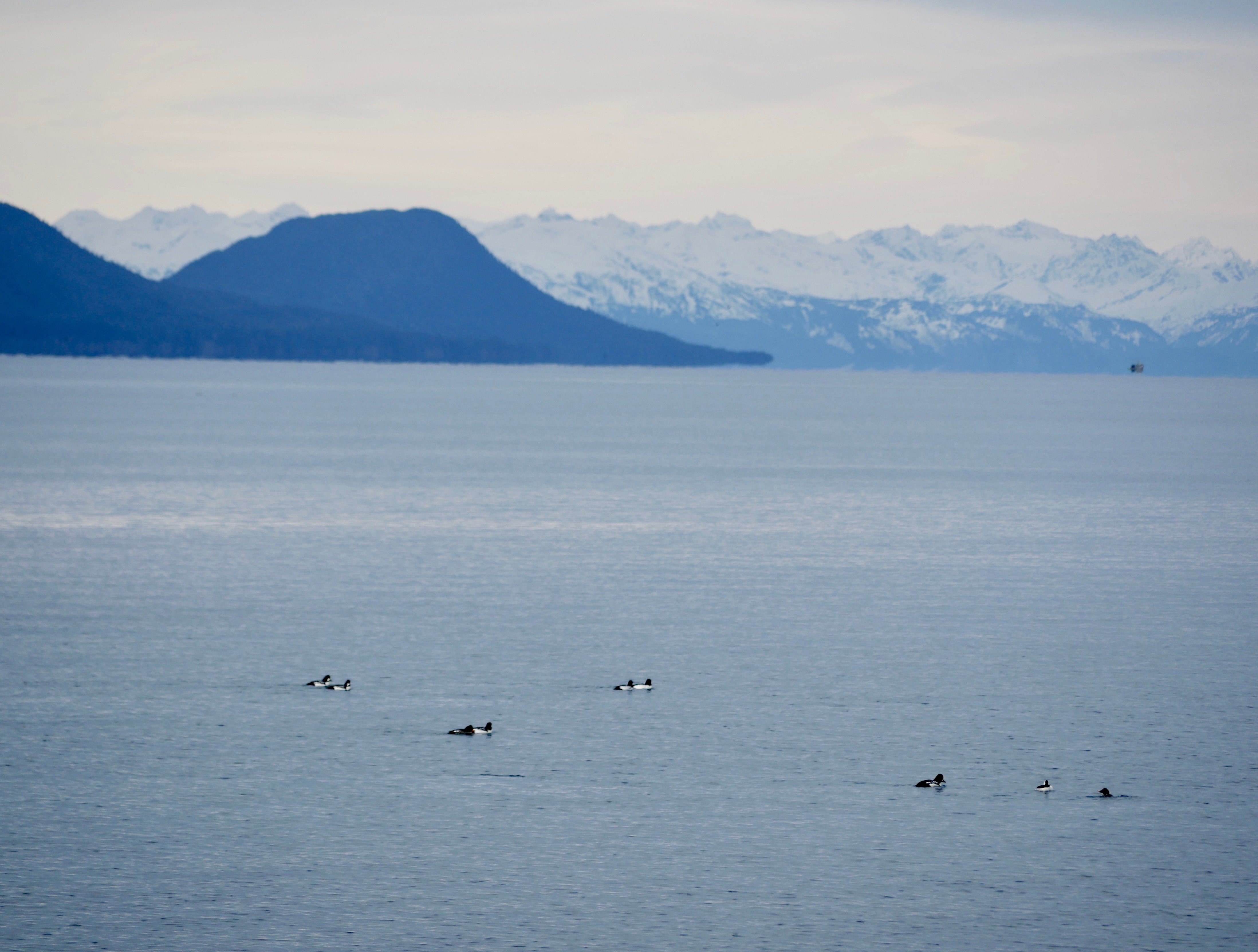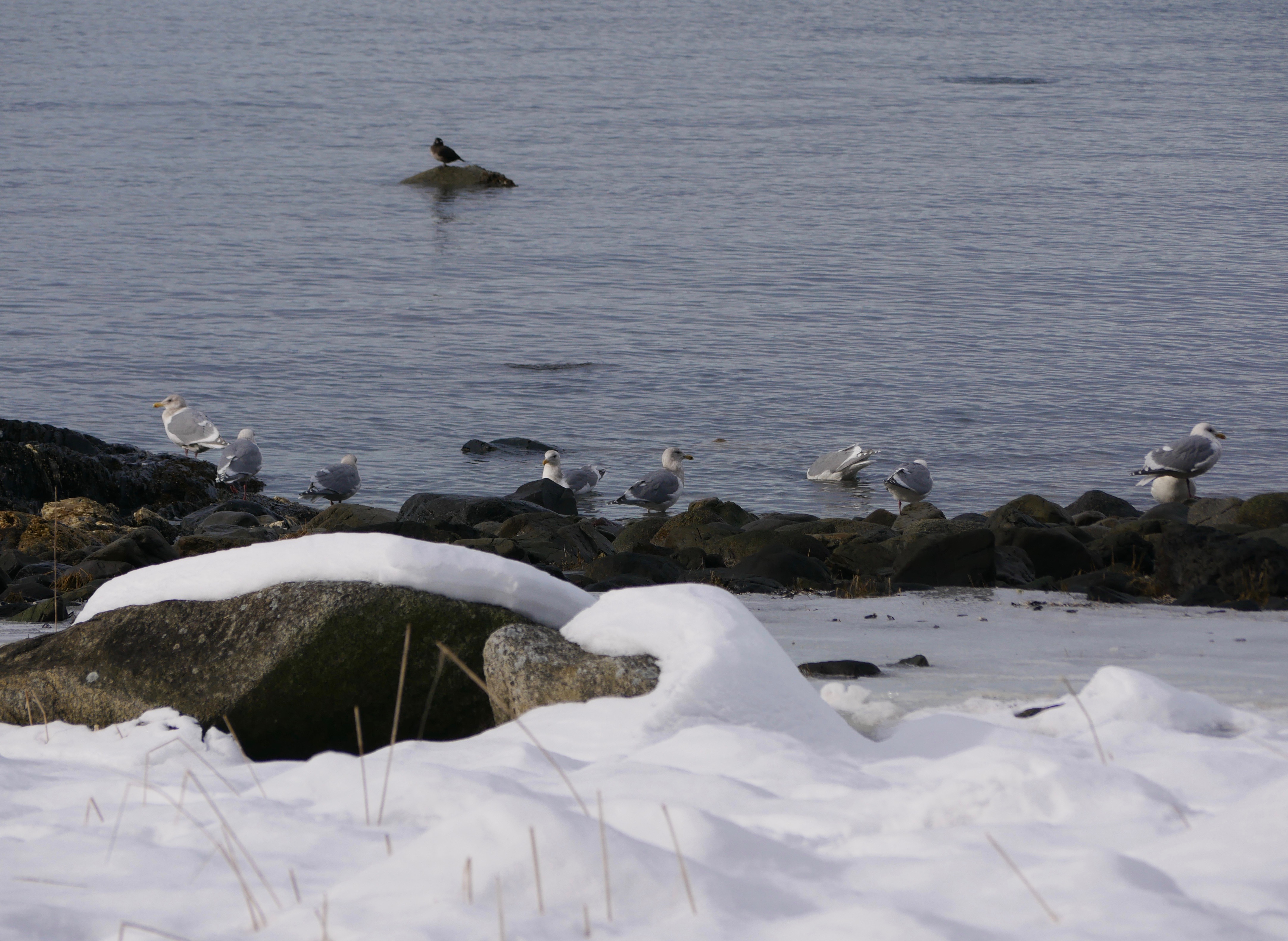 Following the impatient poodle-mix onto the beach, I learn that we are the first visitors of the day. Gulls lounge on beach rocks just cleared of snow by the tide. Golden eye and mallard ducks slip into the water but stay close to the shore. Eight more golden eye ducks drop onto the water to join the others. The ducks are too busy earning a living to acknowledge our presence.