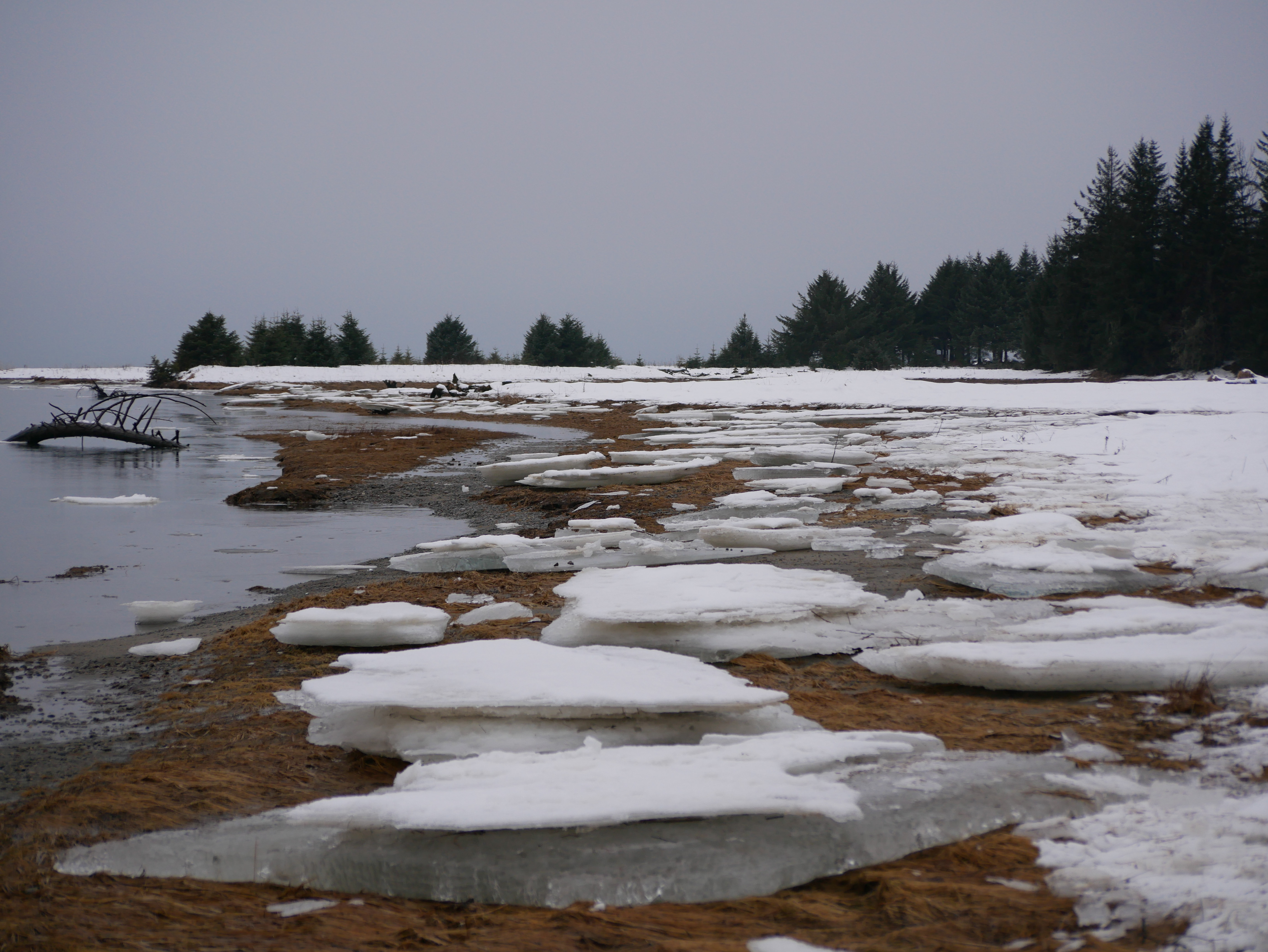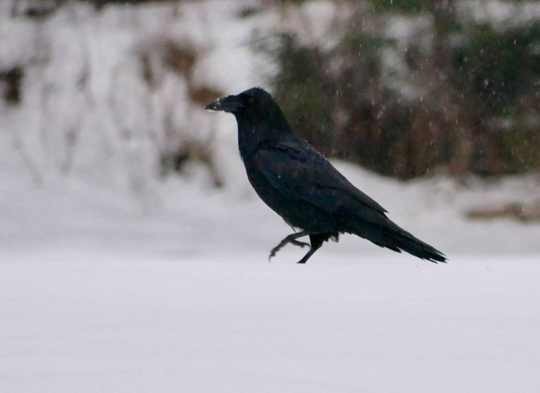 A harbor seal swims past in the river current. It stares at the little dog and then disappears under the water. Then a raven flies over our heads and lands on a snow bank. It takes what I can only describe as a snow bath: digging out chunks of snow with its beak and tossing them onto its back, then rolling over and over on the snow. It then tumbles down the snow bank like a child rolling down a grassy slope.