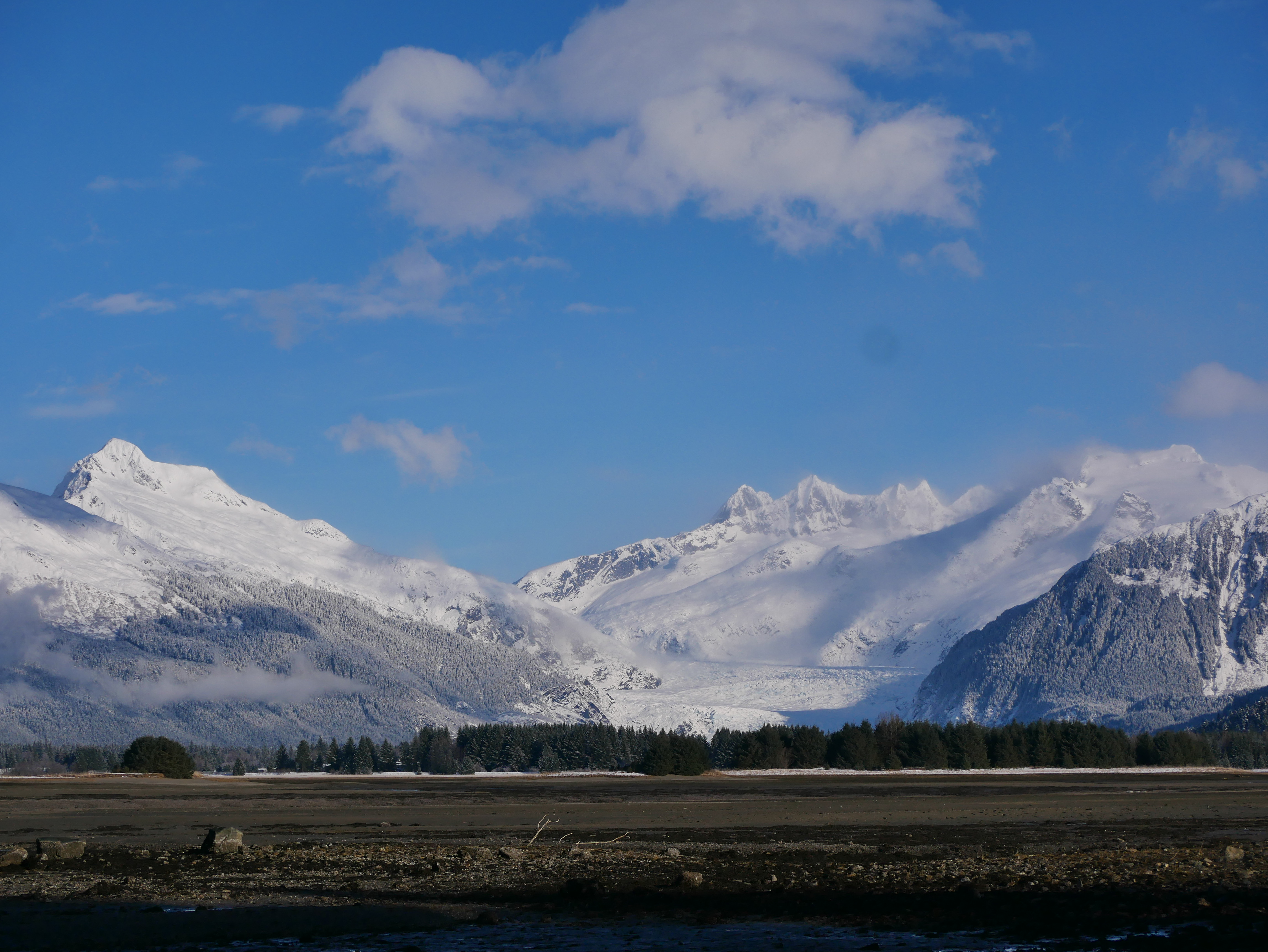 At first the place is silent. No eagle cries as we round the pond and walk out onto the spit that separates Fish Creek from Fritz Cove. No mallard cackles. Then we hear a bald eagle complaint. On the grassy bank of the creek, the noisy eagle is spreading its wings to dry them. It has the white head and tail of a mature bird but the mottled wings of a young one. It looks wet and disheveled.