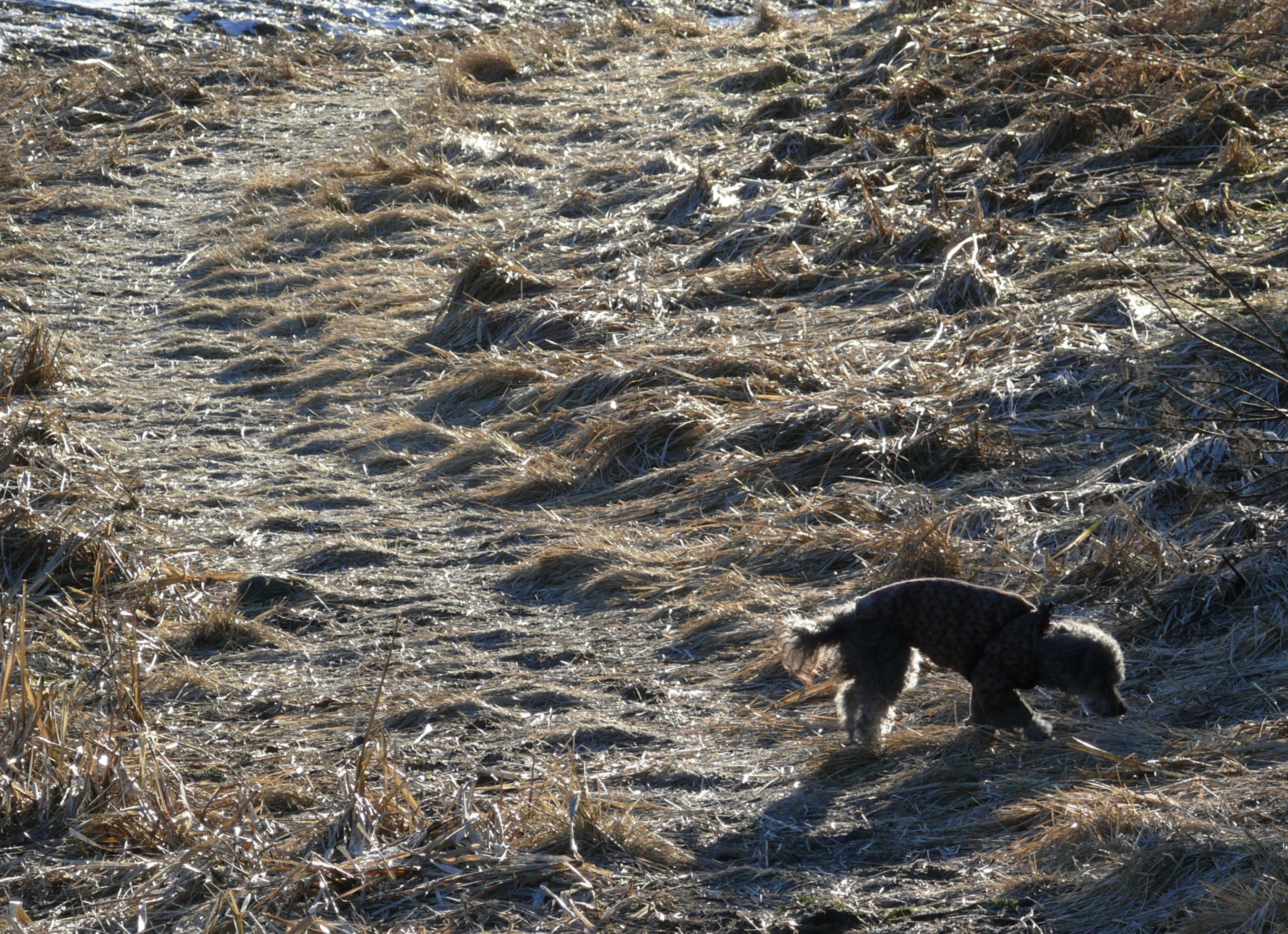 The snowstorm ended an hour before. But it was still storm gray out. Aki didn’t seem to mind. She waited at the front door for me to secure my boots. She leaped from the car as soon after I stopped the car at the trailhead. We had to climb an two-meter high snow berm to reach the trail. That didn’t slow her. But a half-mile down the trail I discovered that I was alone. Backtracking, I found the little poodle-mix chest deep in new snow. Golf-ball sized snow clumps covered all four of her legs.