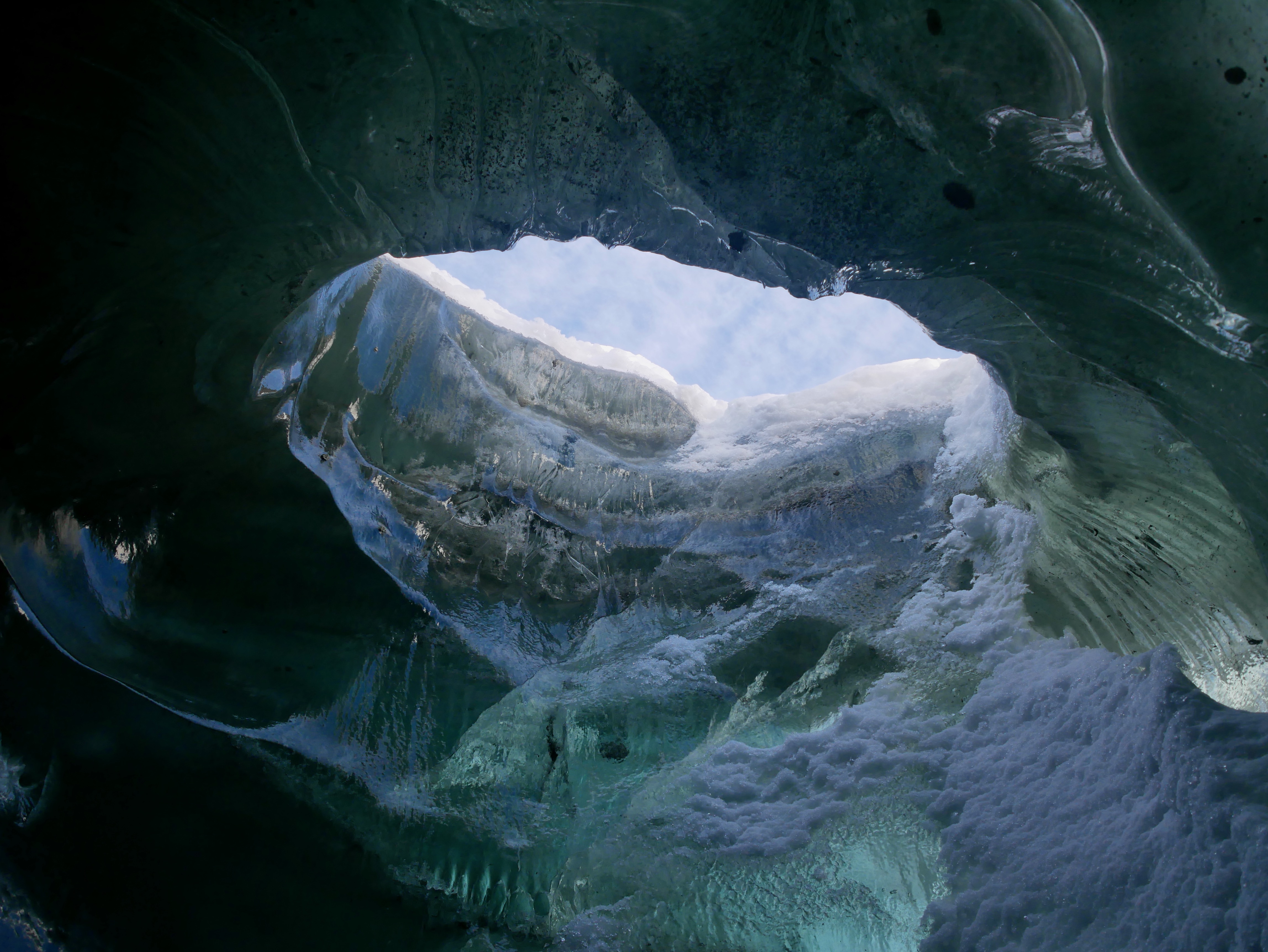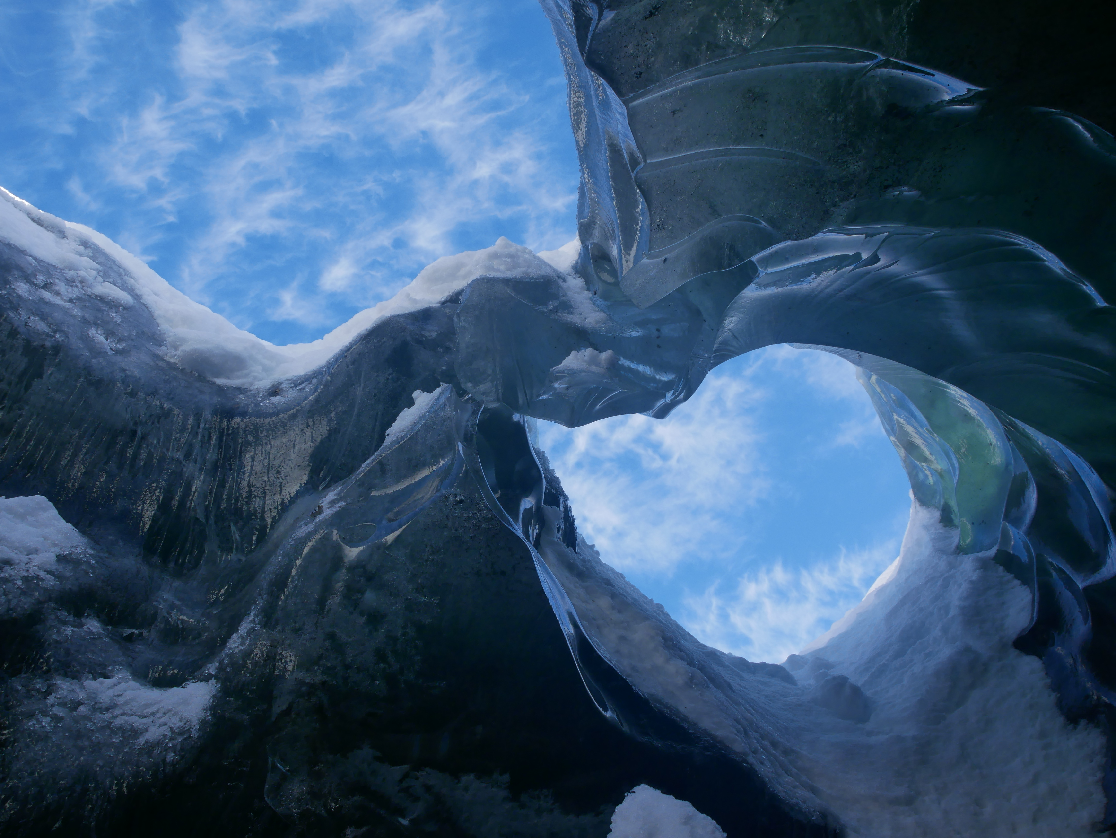 Drawn by a patch of bright, white light striking the floor on the opposite side of the cave, I cross a still-frozen stream and enter a vertical tube of scalloped ice. Above a series of ice lens offer circular views of blue sky and clouds. I can’t think of another view like it.