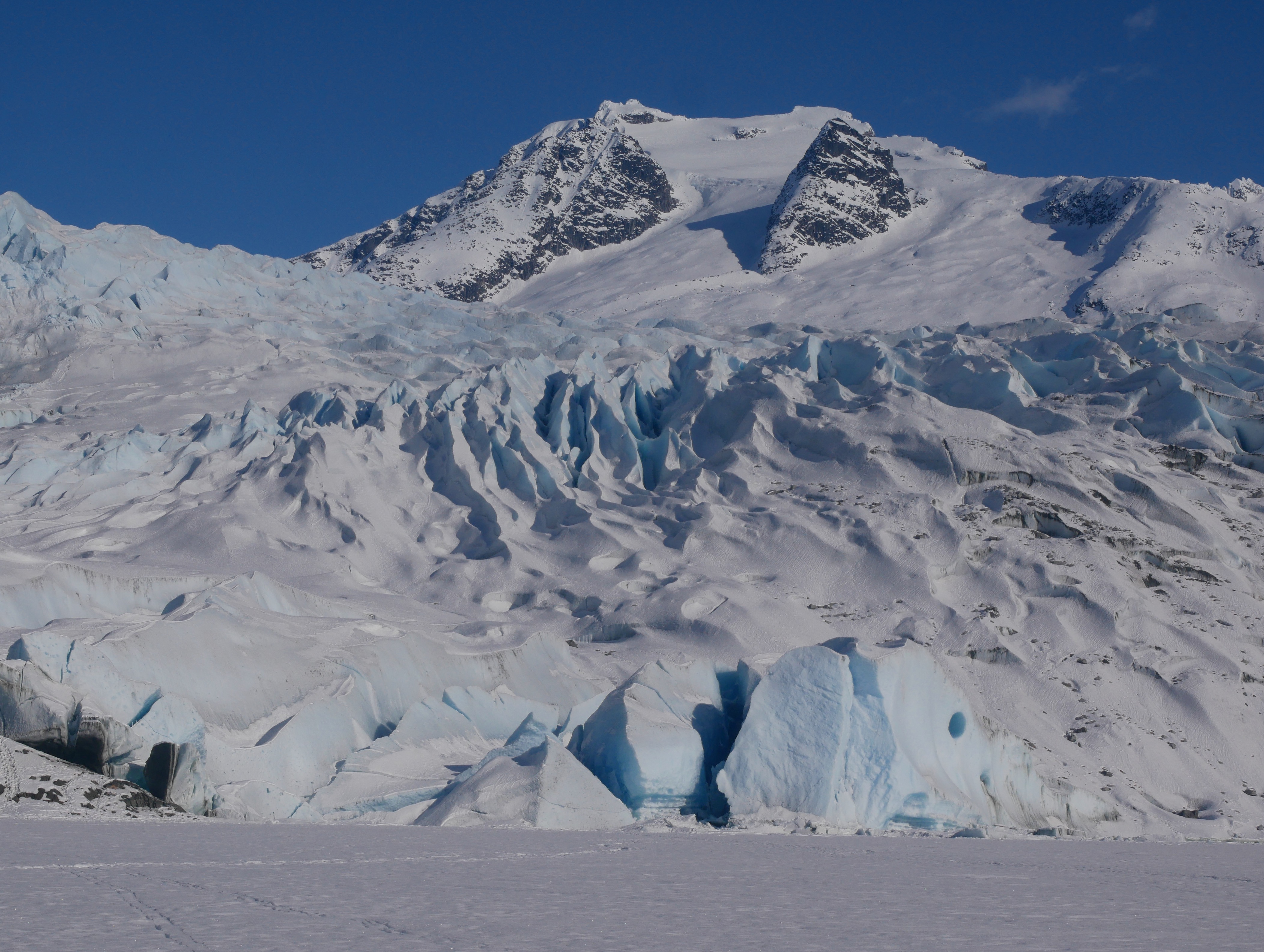 Aki is leading some out-of-town guests and me across Mendenhall Lake to the glacial ice cave. Mount McGinnis and the Mendenhall Towers form a jagged skyline against the indigo sky. It’s easy walking. Previous ice cave pilgrims have pounded our path smooth.