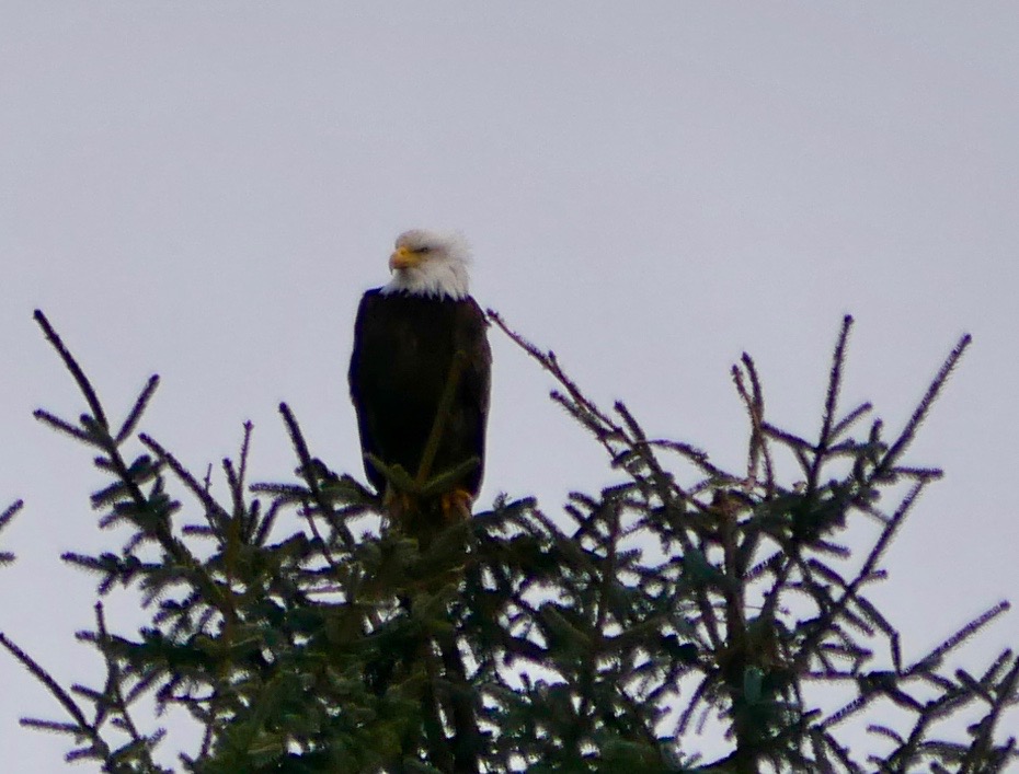 On this grey day at Fish Creek, yellow is the dominant color. Last week, when sun hammered down on the snow-covered meadow, white fought with blue for chromatic first place. Tides and rain have washed away the snow. Grey clouds hide the indigo sky. The straw-yellow of last fall’s grass can draw the eye.