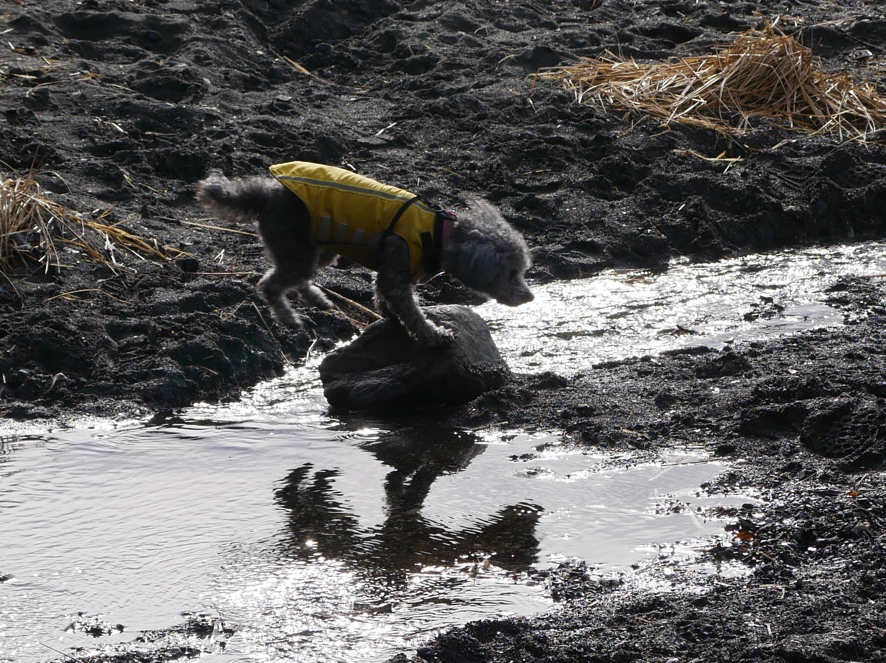 Suddenly, Aki has a shadow. It’s the last thing I expected on this grey morning. We are approaching the old Auk Village site on a beach exposed by the retreating tide, trying to get a walk in before it rains. The shafts of sunlight piercing the marine layer are a surprise.