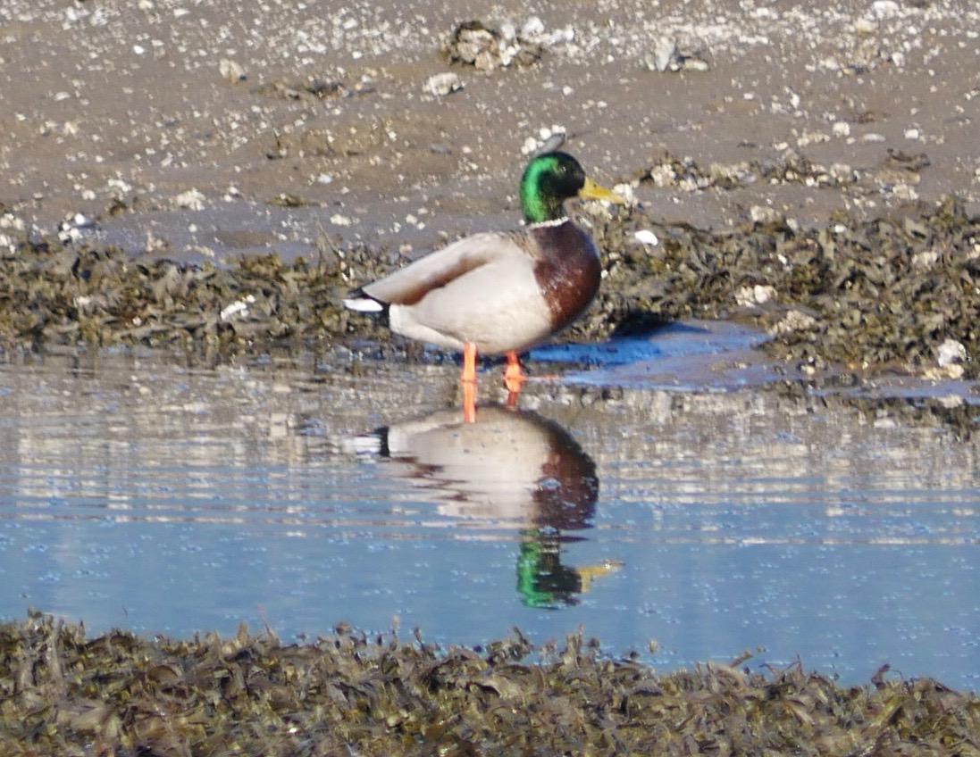 Thanks to the near presence of the Juneau Icefield, sunny days are often windy days. Not this morning. The resident mallard drakes can admire their reflection in the tidal ponds scattered around the Sheep Creek delta. Aki can walk without wind flattening her fur. I can enjoy the reflections.