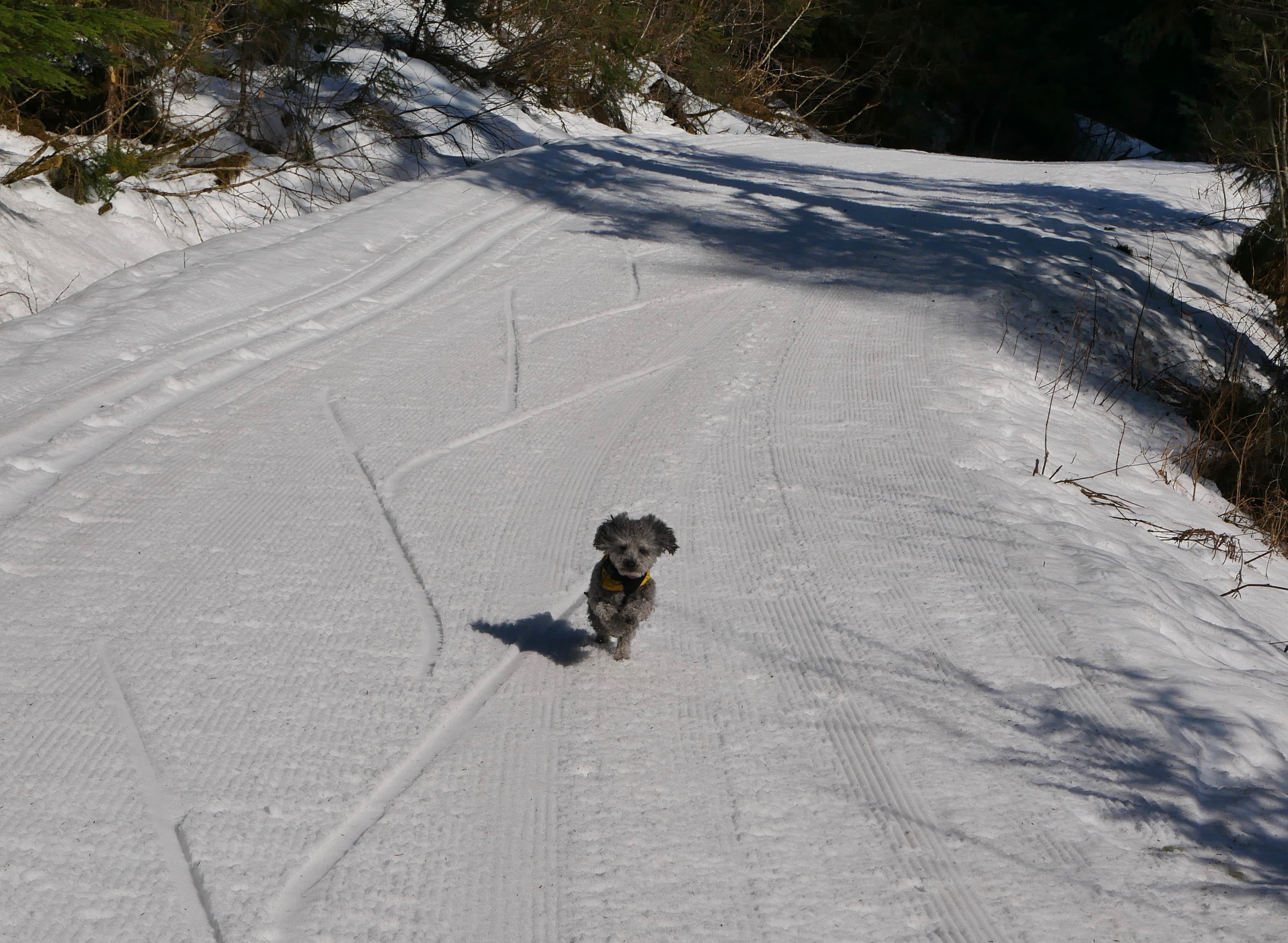 We just completed the 6-kilometer Montana Creek Trail. This time we didn’t have to dodge deep ruts made by a fool on his or her four wheel all terrain vehicle. The groomer did a great job leveling out the snow. But he wiped out the classic track in the process. I wouldn’t have minded skiing without a track. But the snow was icy-slick except where it had been softened by the strong spring sunshine.