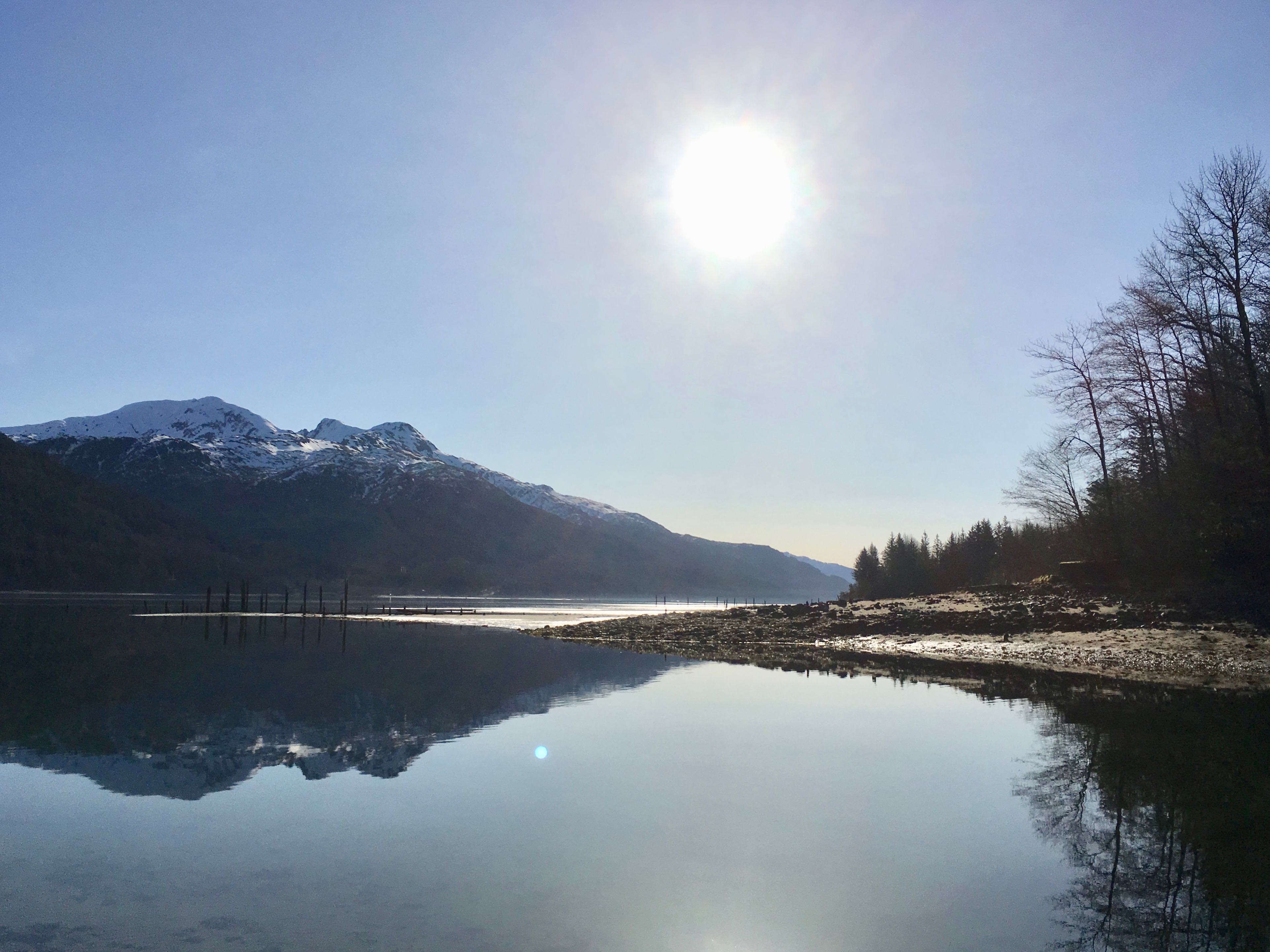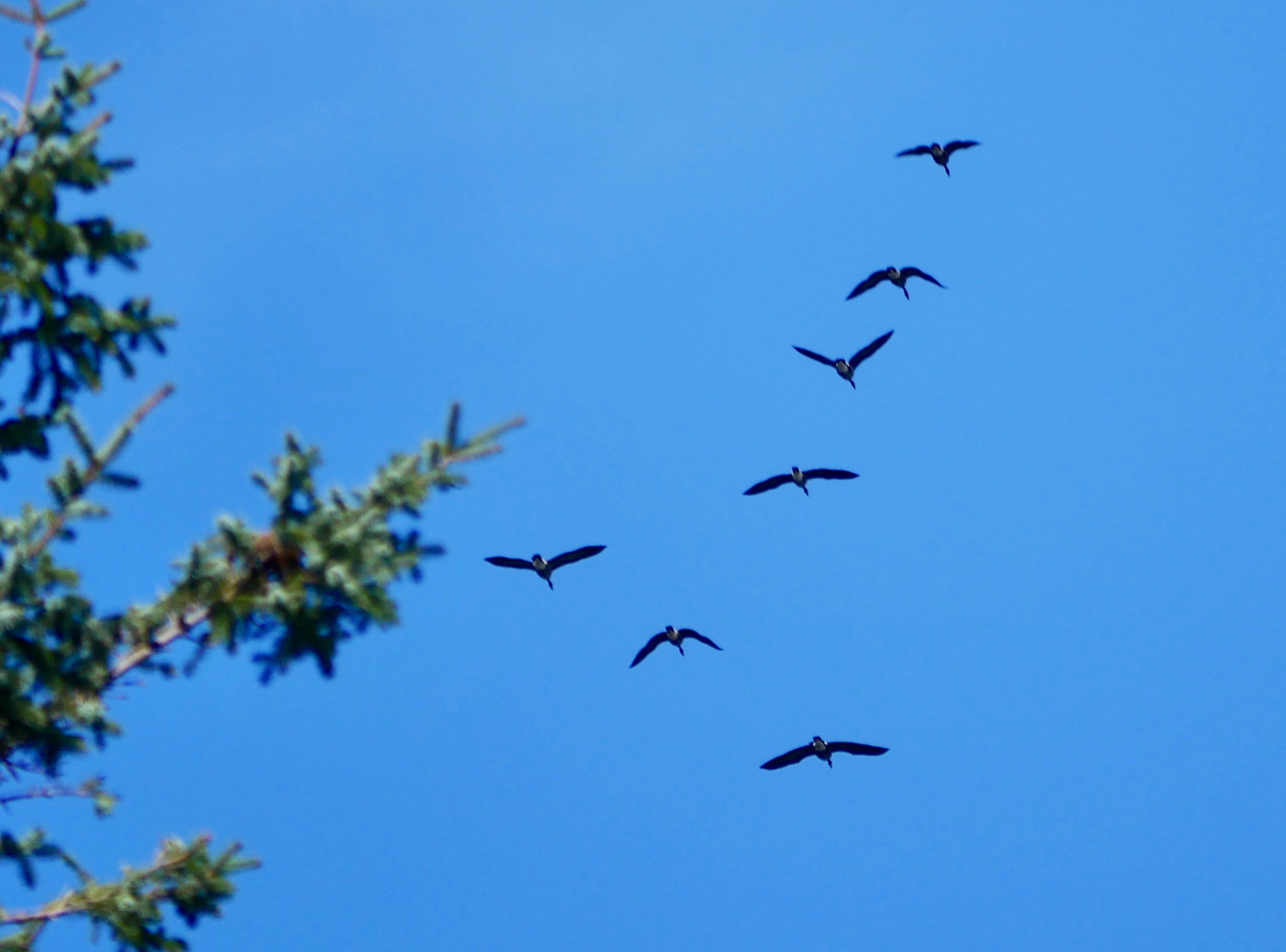 Other birds made low flights over the little dog and I today. Early morning sun lit up the white patches on Canada geese as their “V” shaped formation moved toward the Mendenhall wetlands. Minutes later we watched the underside of a great blue heron as it flew close to my head, looking more dinosaur than bird.