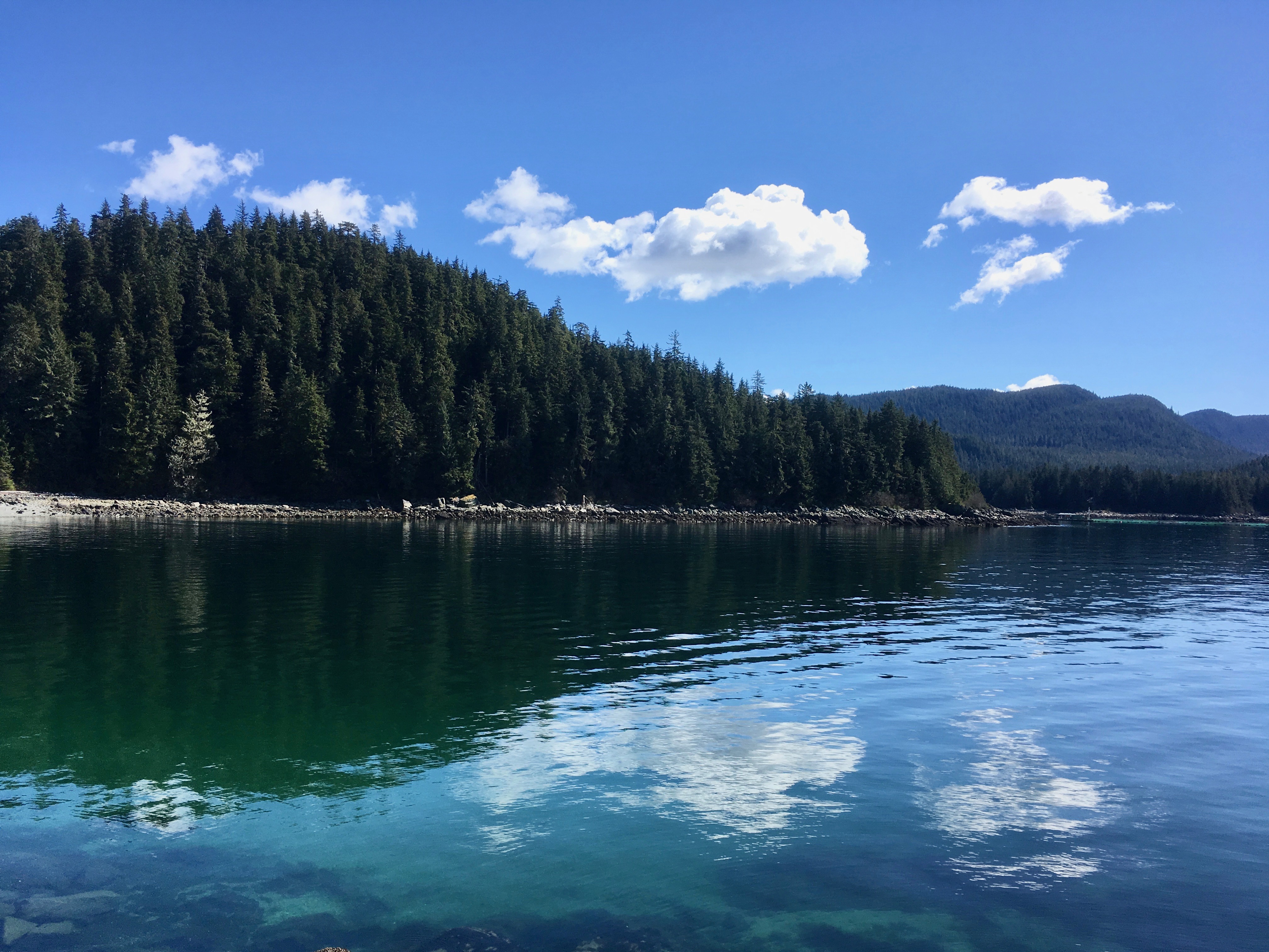 Aki and I sit, back to back on a lichen-covered rock. Her eyelids droop as her body warms in the strong sunshine. I keep my eyes open and scan Favorite Channel for whale spouts or the dog-like head of a sea lion. Only the reflections of clouds show in the flat-calm surface of the channel.