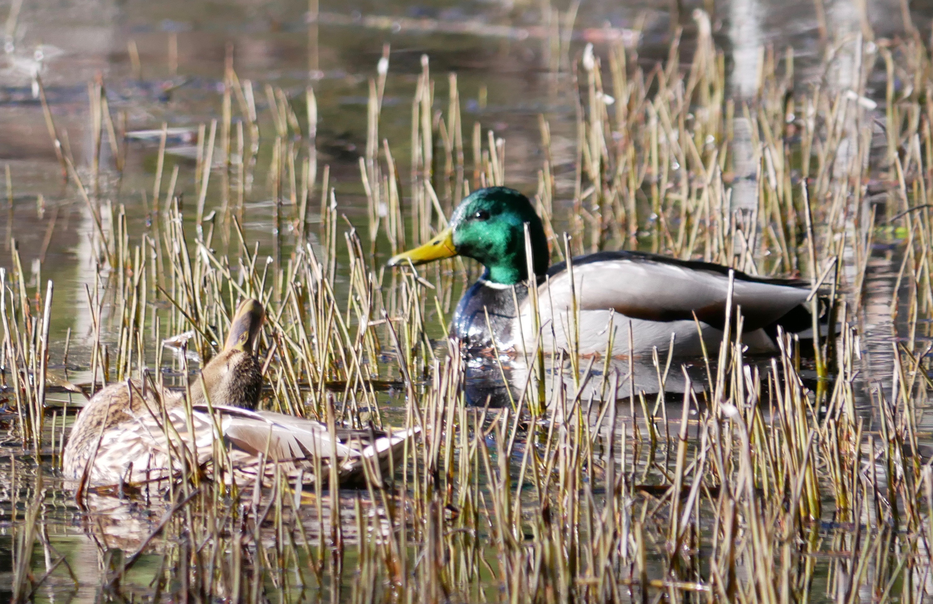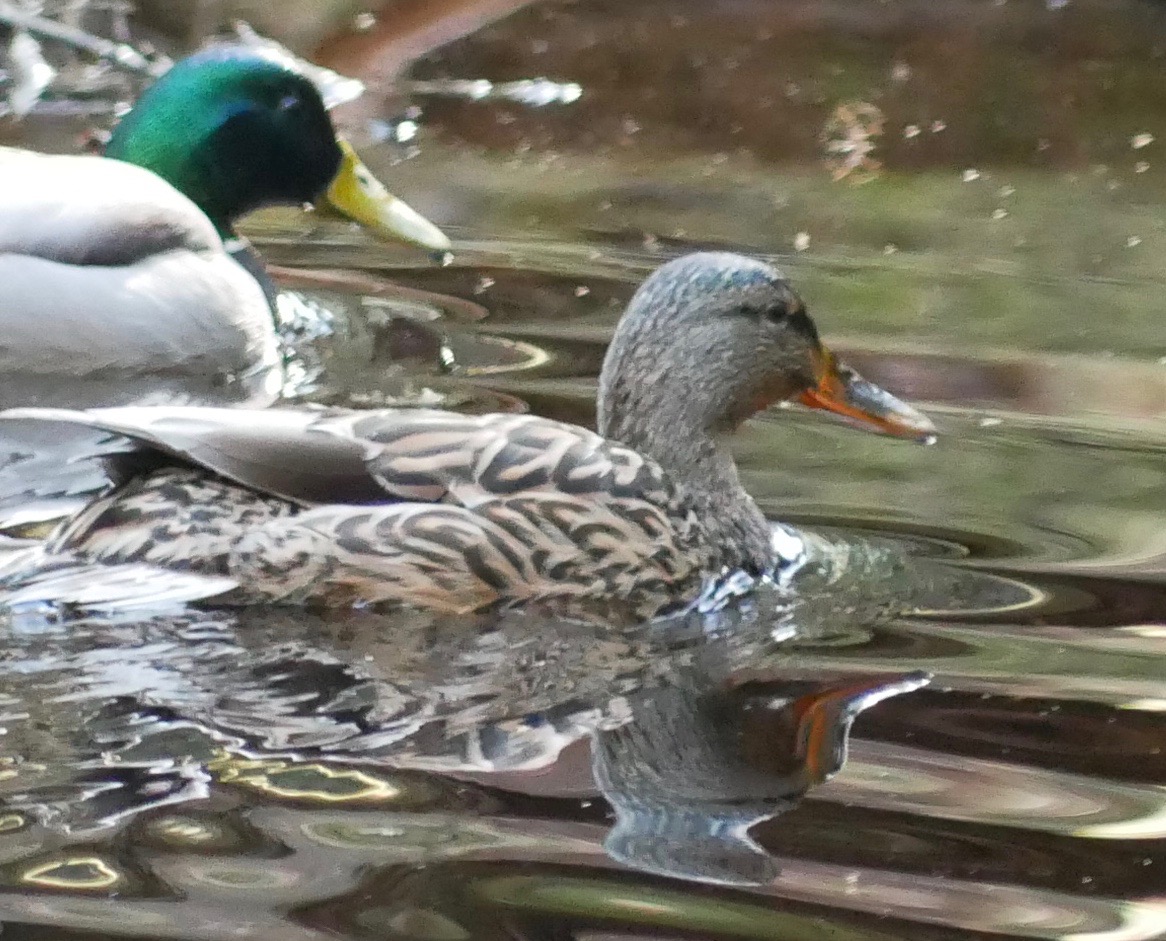 I expect the mallards to take flight but they hold their ground. While the male watches us, the hen stretches and preens her feathers. Maybe they will nest on the pond after the ice melts and opens up the remote parts of the little water body. The jackhammer sound of a sapsucker draws us away from the mallards. The little woodpecker is as hard to spot as the mallards were not.