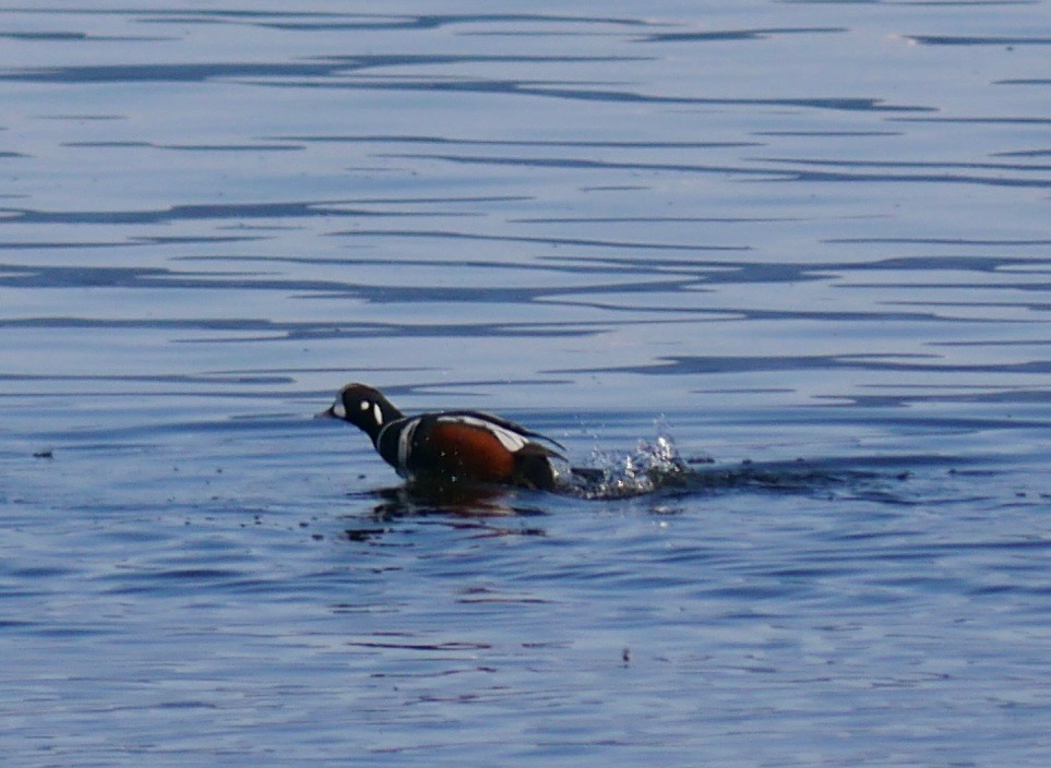 We work our way out to the beach and are surprised again by ducks. This time it’s harlequins. The little clowns jockey for position on the water, like they are settling in for another summer. I thought that they’d be on the outer coast by now.