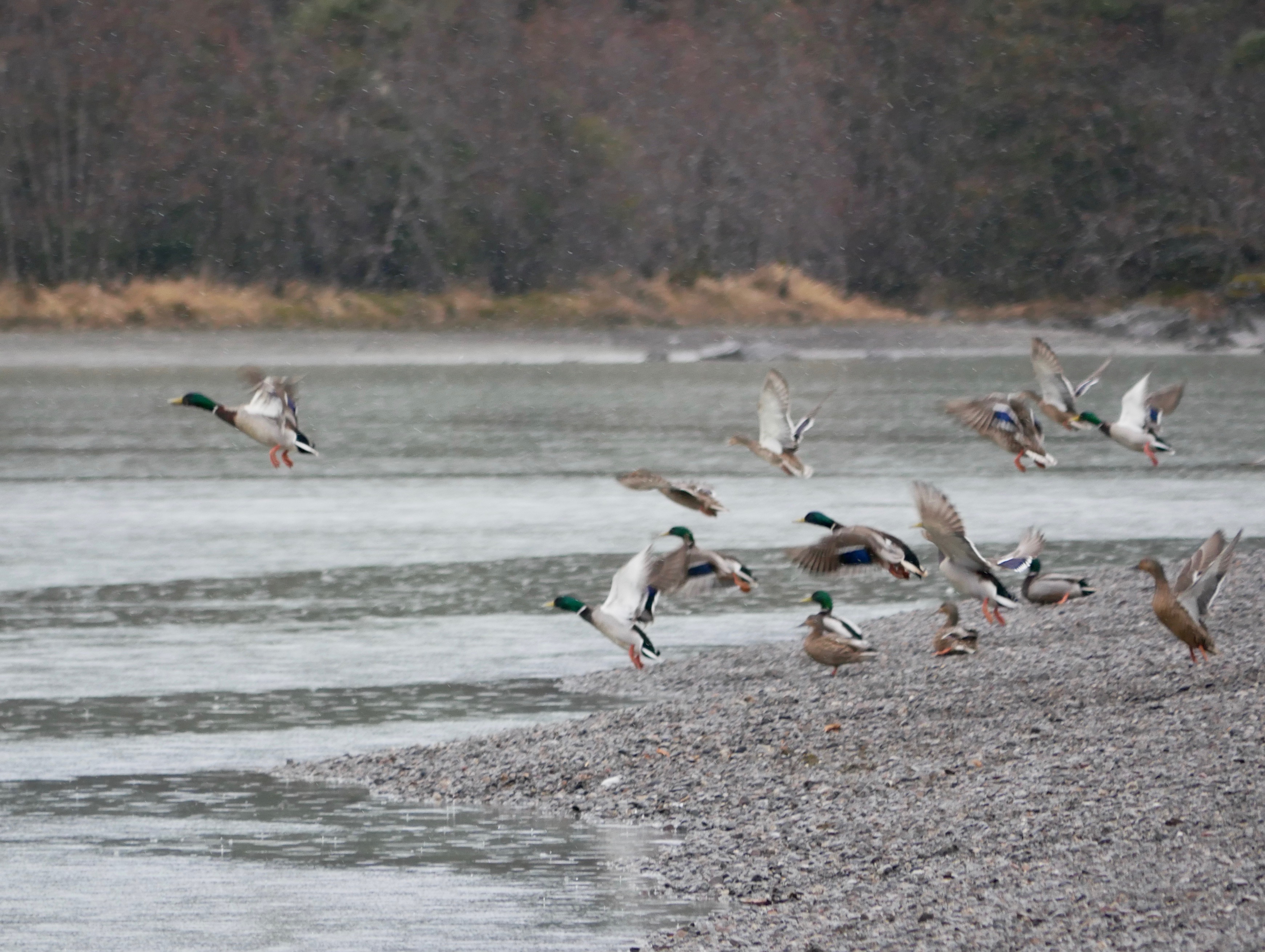 Thanks to the recent stint of dry weather, a tributary normally too deep for us to cross has been reduced to a trickle. I take advantage and lead the little dog up a side slough to a section of the river we can rarely reach. Today it’s a hang out for mallards and merganser ducks. As we approach they fly off the beach in twos or threes and land a short ways off in the river. Soon the whole raft follows them.