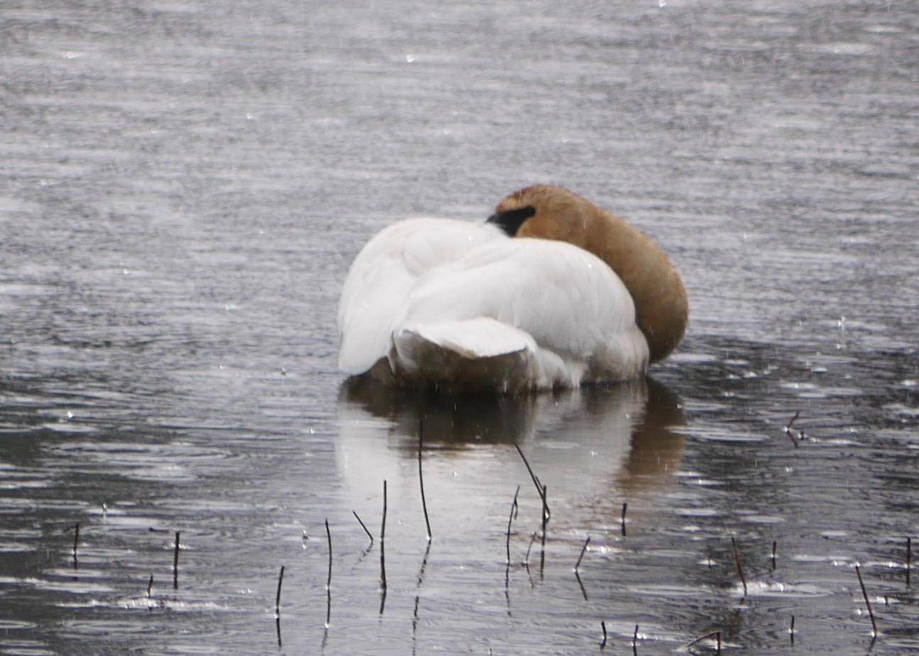 One of the swans wakes up when my foot slips on some gravel. It looks at the little dog and me, then resumes its nap. I assume that they have just finished a leg of their northward migration. Now they must rest and feed before resuming their flight to the summer breeding grounds.
