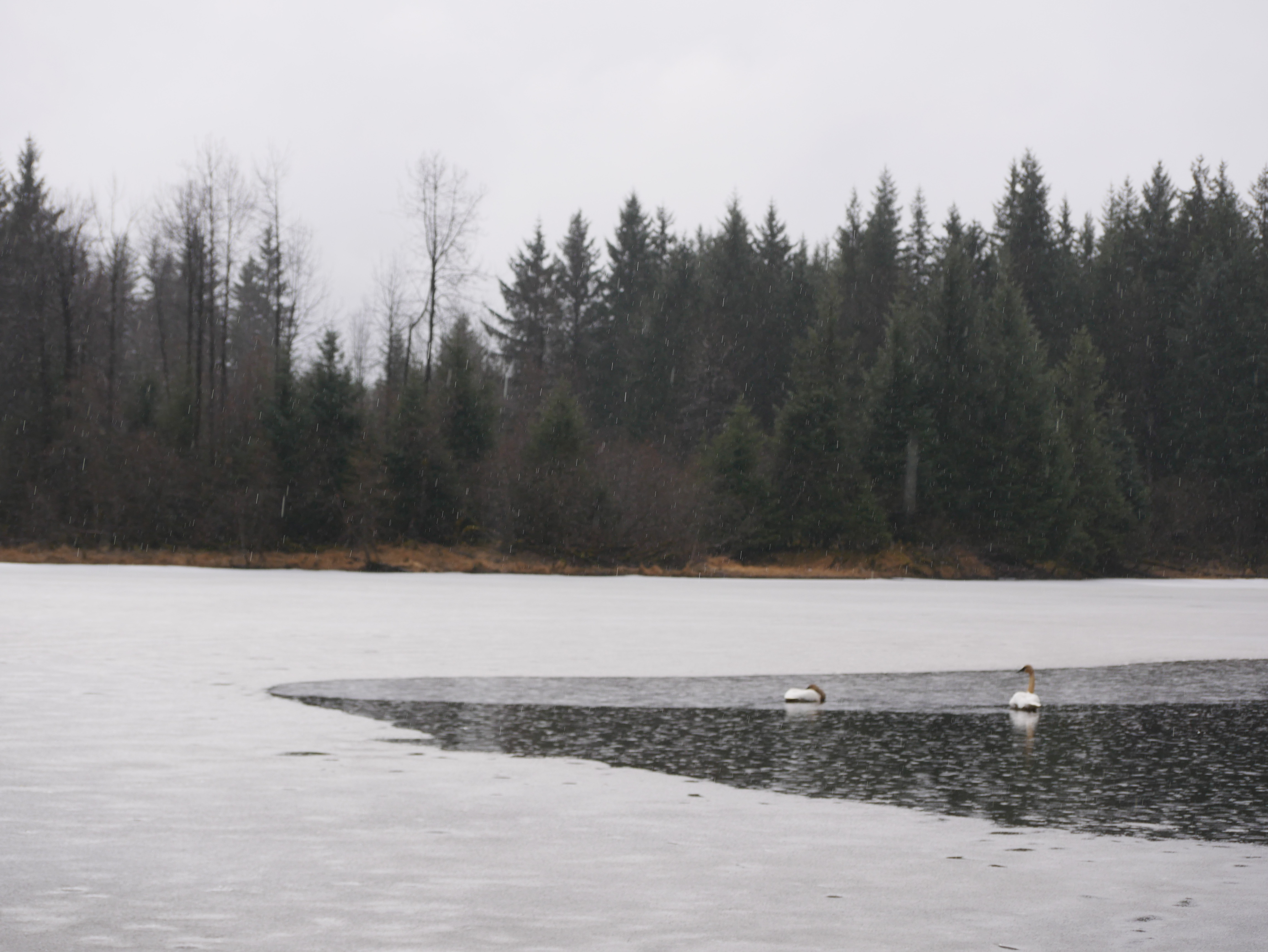 After circling a large beaver den, we cut back through the woods to Moose Lake. While Aki rolls and rubs her face in a soft patch of trail snow I hear a bird with a powerful voice call “ko-hoh.” We move on, after an unsuccessful attempt to locate the caller,and reach the lake. Ice still covers most it. Two trumpeter swans float in a small patch of open water, their long necks stained brown by the muskeg water in which they recently fed. Now they sleep with their black beaks tucked into their back feathers.