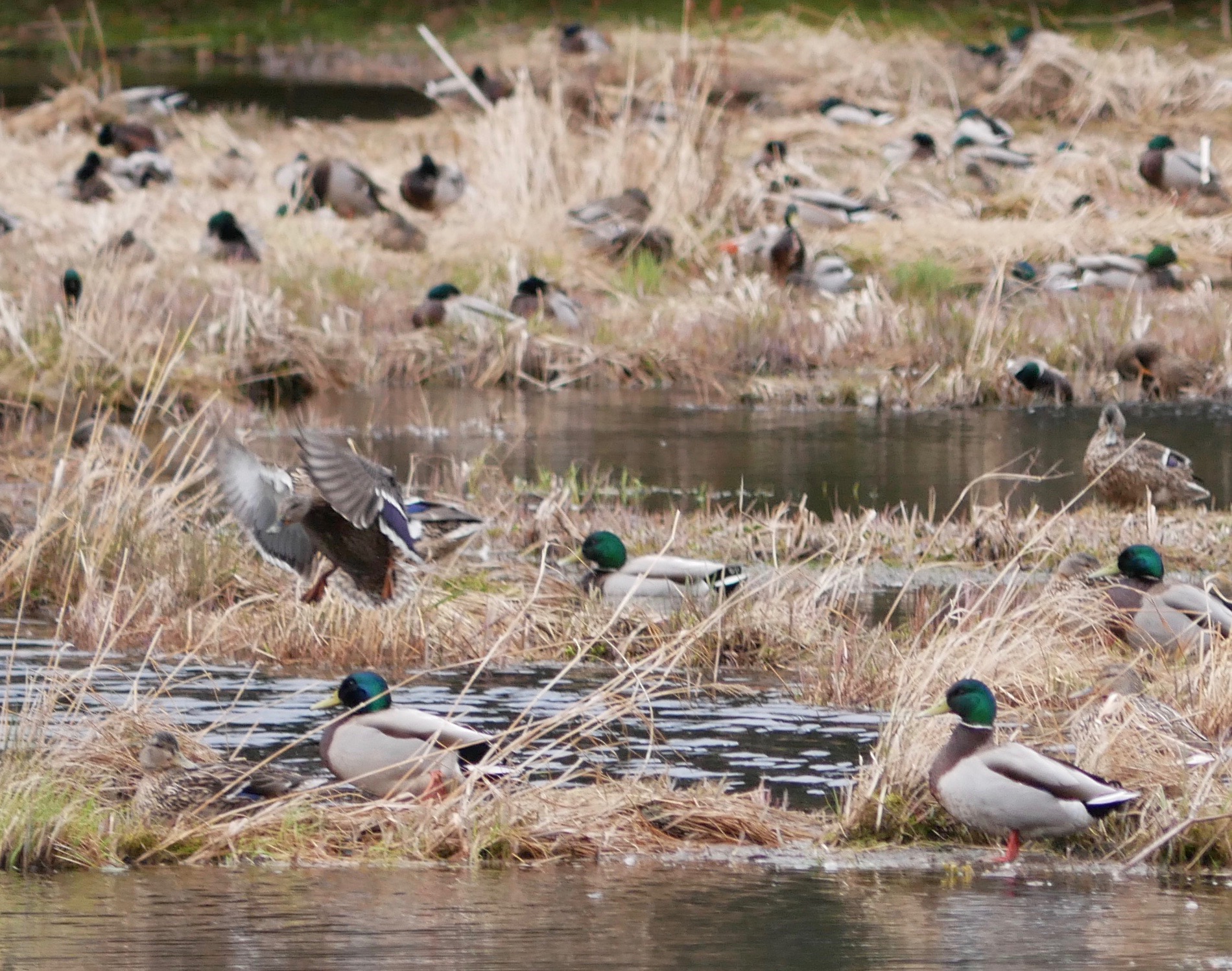 Aki ignores the noisy birds. One of her other humans has brought along a Frisbee for the little dog to chase. While she is busy with her toy, I sneak off the trail to look at ducks gathered on a swampy meadow. At least one hundred mallards crowd on a series of tiny lakes. A northern pintail and several American widgeons wander among the mallards. Every minute two or three more ducks join the crowd.