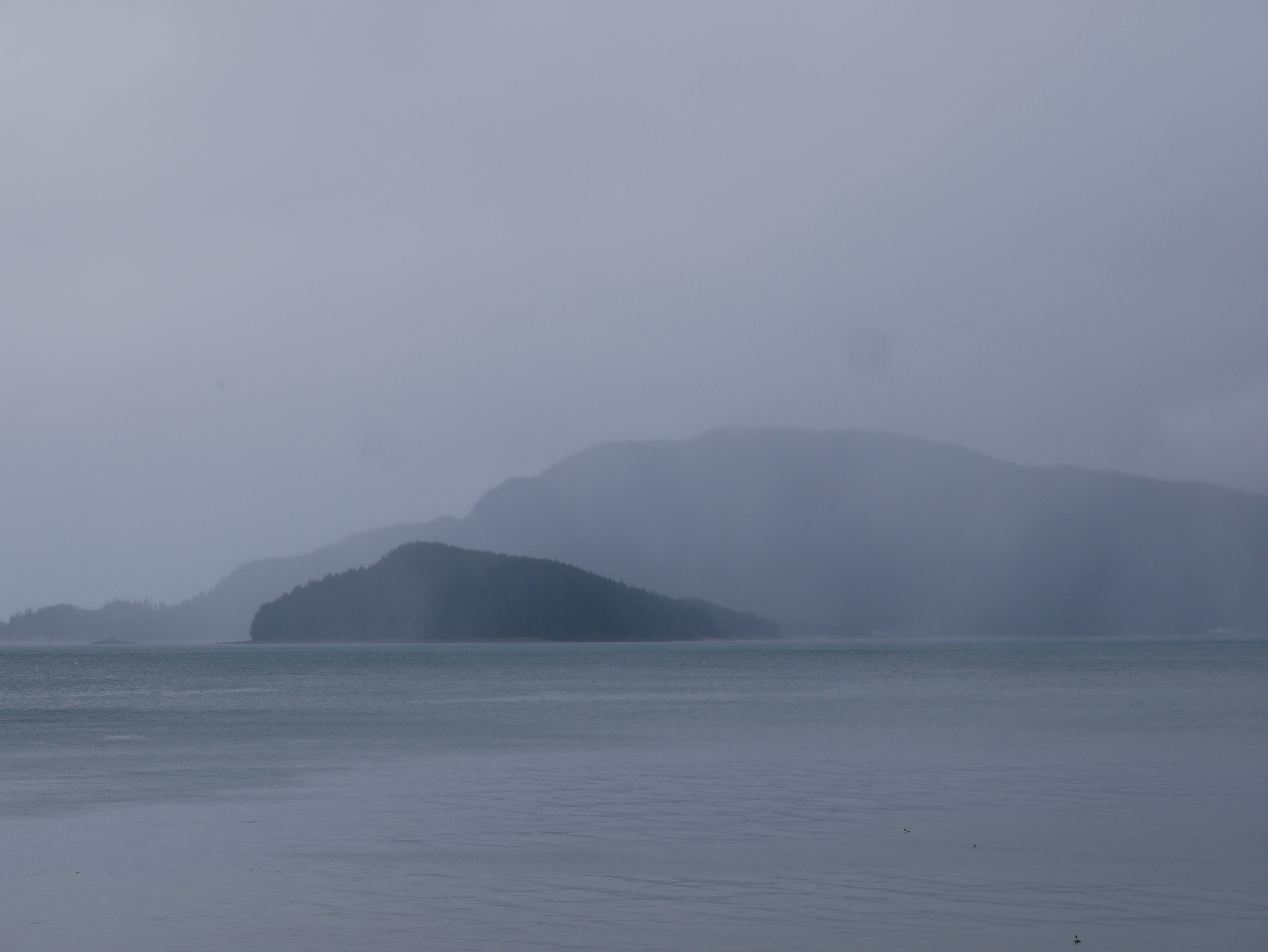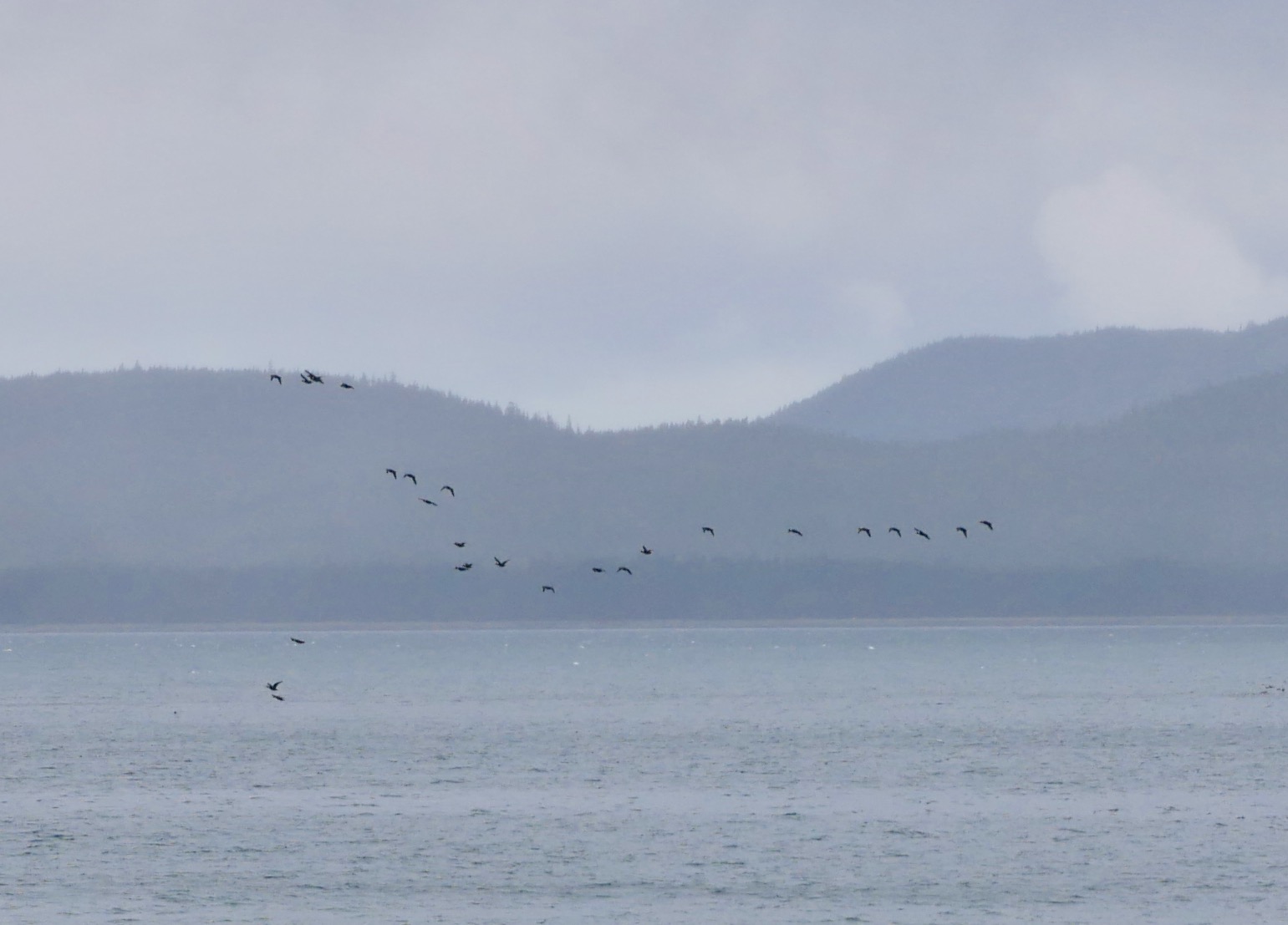 The little dog and I round the empty point, trying to ignore two eagles bickering above us in a shoreline spruce tree. A line of waterfowl, maybe scoters, fly up and down Lynn Canal. They change relative position constantly. In each photo I take of them, their bodies look like notes in a musical measure.