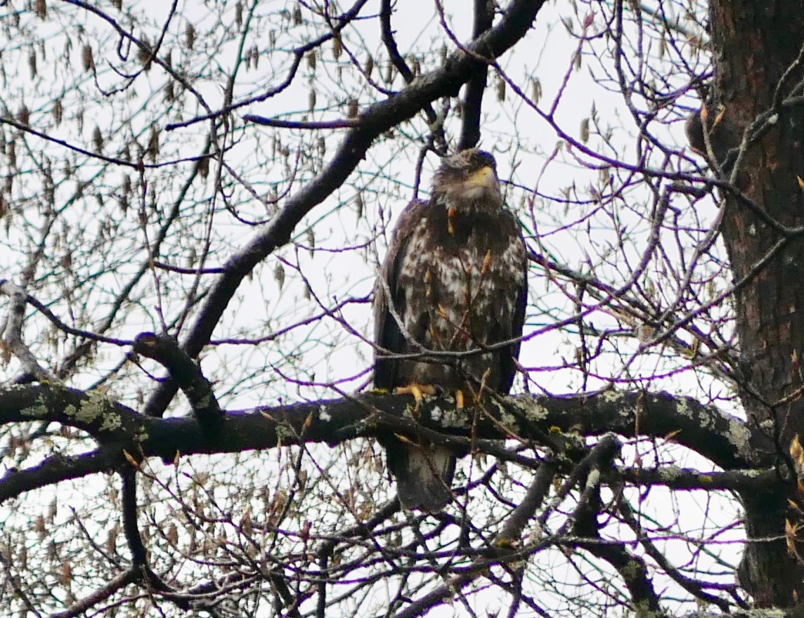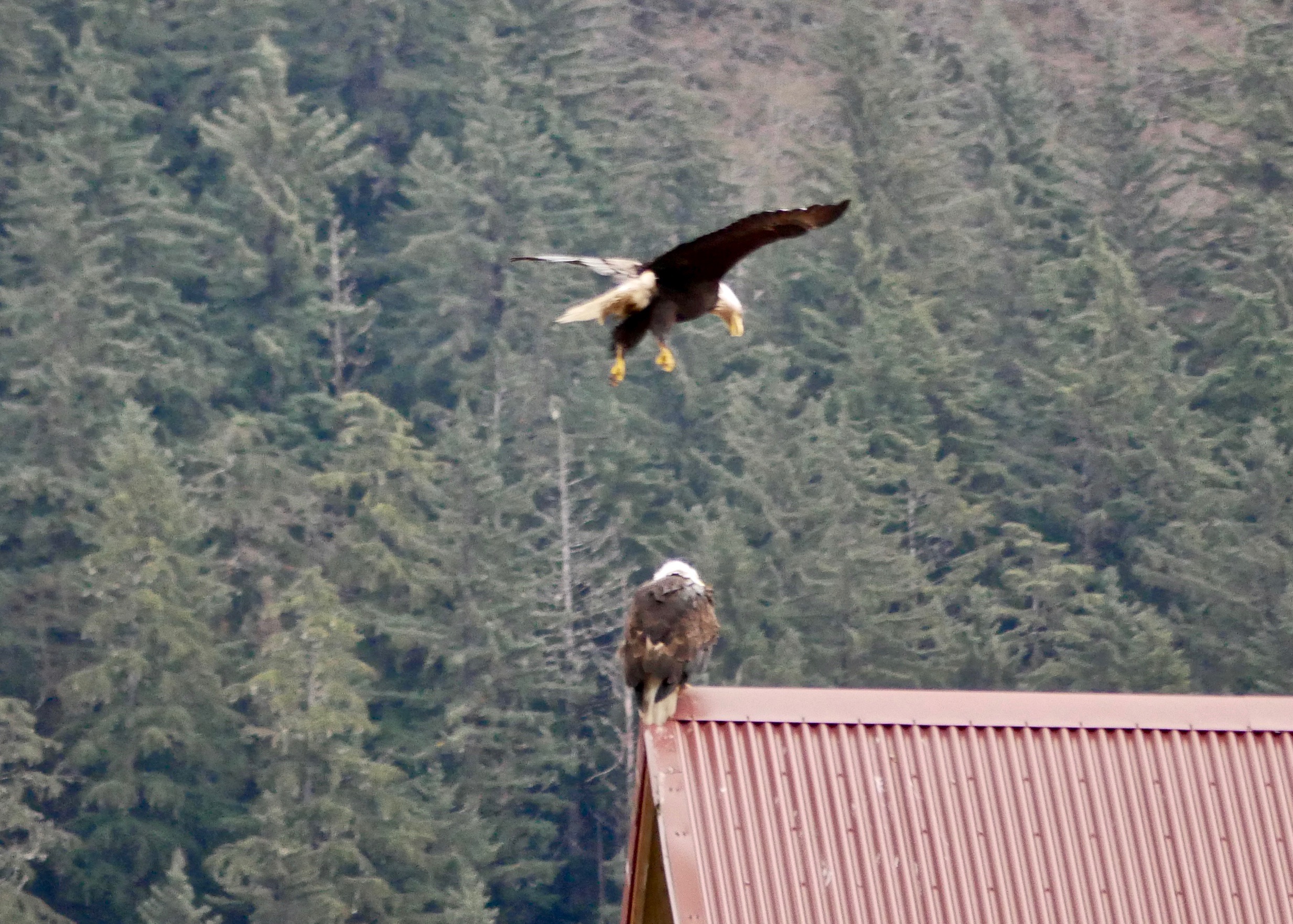 The eagles on the tower have the white head and tail feathers of mature birds. Fifty meters away, an eagle with the mottled brown and whites of an immature predator roosts far back in a tangle of alder branches. It watches one of the mature eagles, maybe a parent, fly out and over Gastineau Channel, circle and then dive toward the water. When the hunter returns with empty talons, its mate gives it a scolding that can be heard all the way from Downtown Juneau to the cabins at Lucky Me. I turn to see what effect the scolding has had on the immature bird and find that it has flown away.