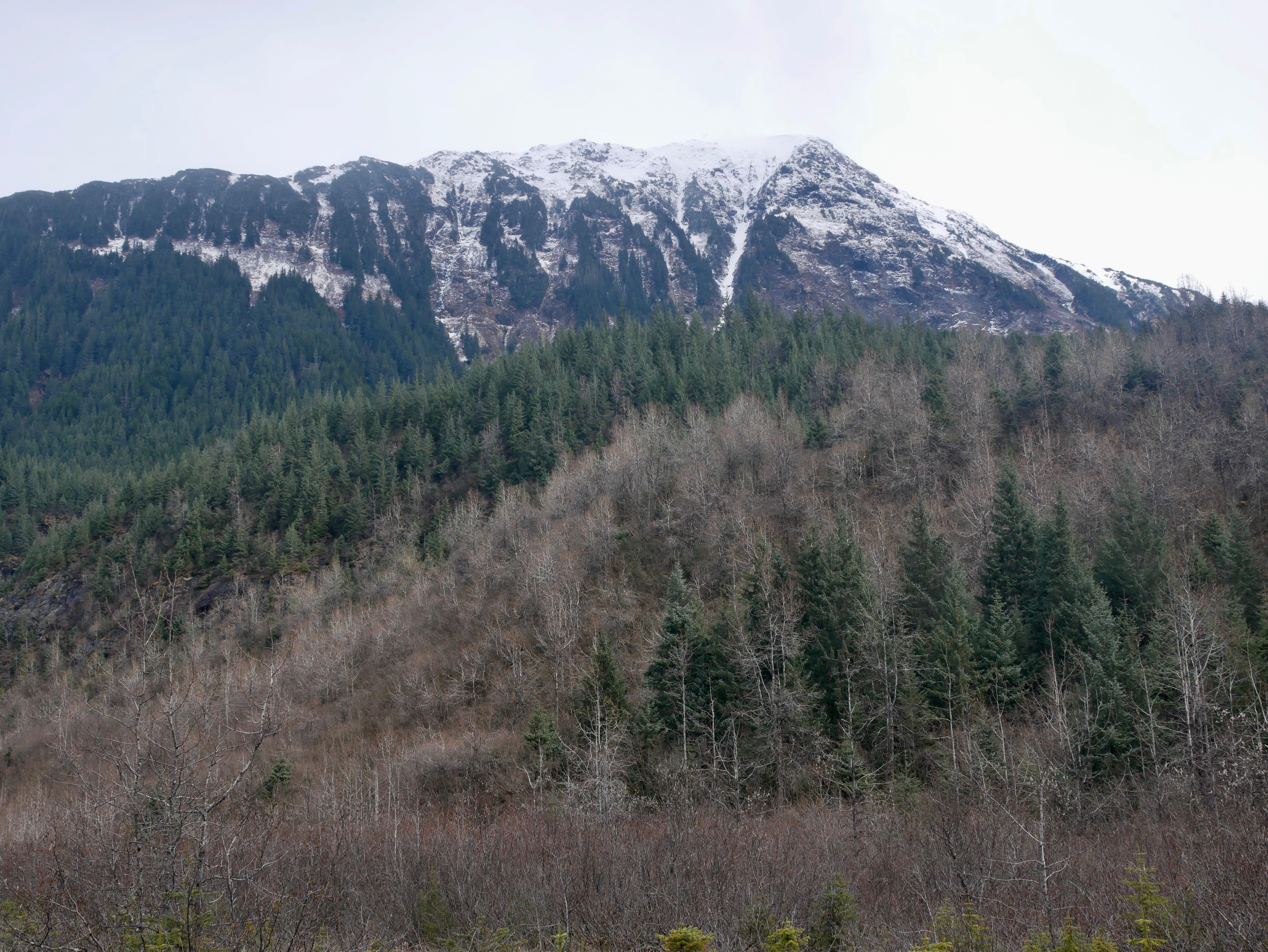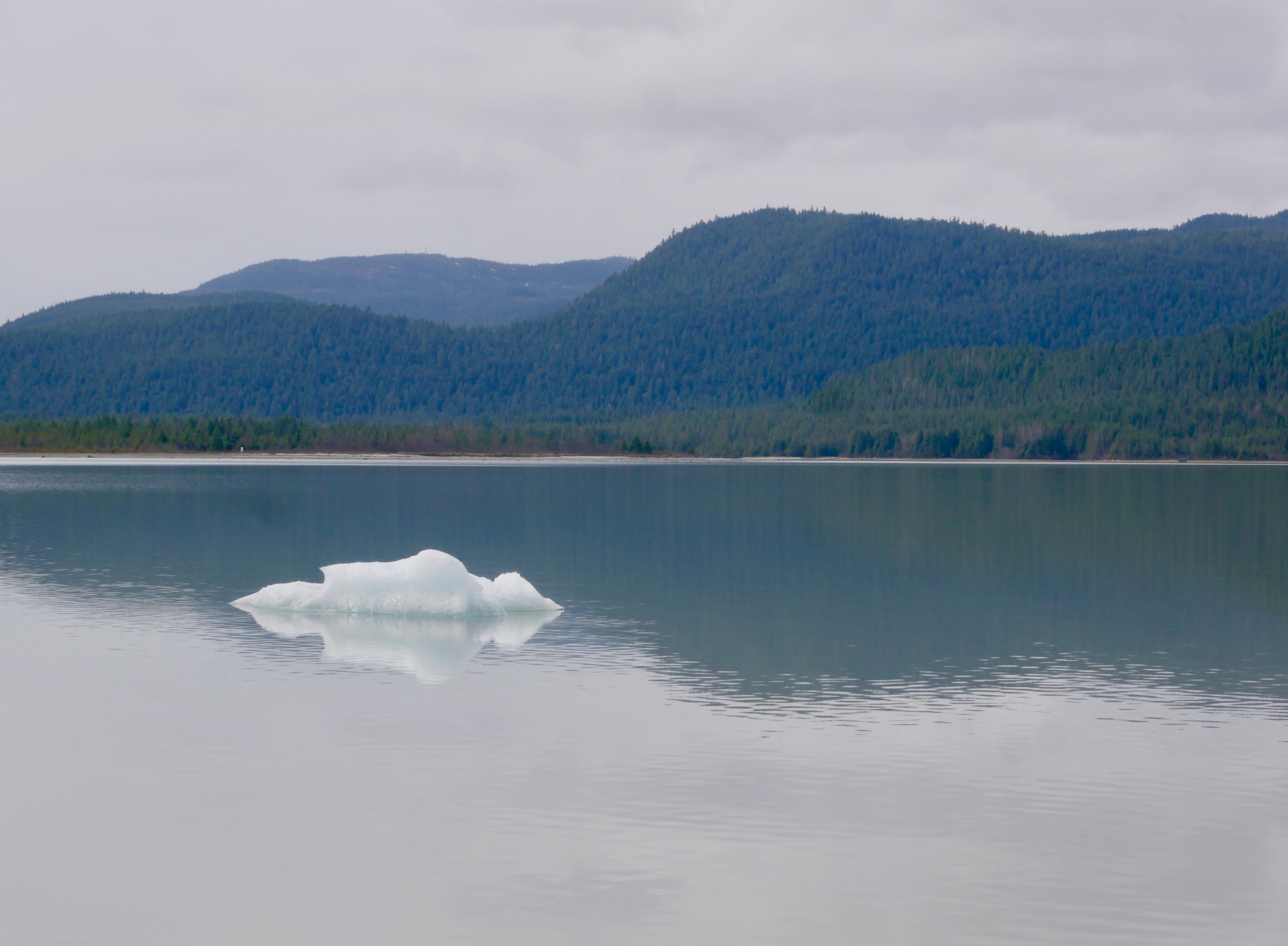 The ice river meanders out of a layer of low clouds that hides the Mendenhall Towers but not Mt. McGinnis or Mt. Stroller White. Alder trees on the mountains’ slopes, bare except for their swollen, white buds, could be a convention of ghosts. One bald eagle circles a forest meadow on the far side of the lake. Otherwise the sky below the clouds is empty of obvious life.