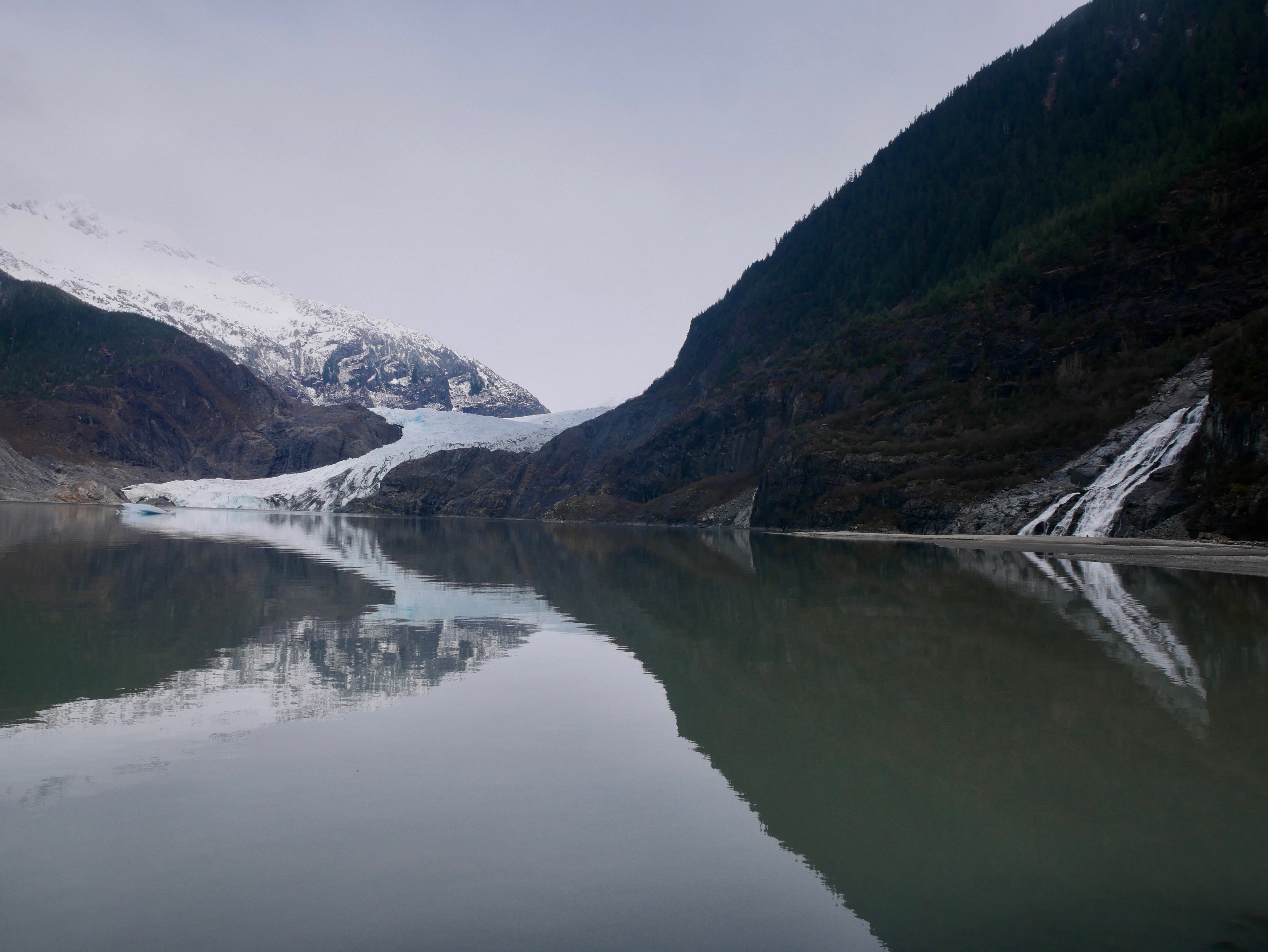 At the beginning of the hike a constant breeze made the lake surface look like dun colored corduroy. It dies out by the time we reach the falls, allowing the lake to form a mirror for the mountains, falls and glacier.