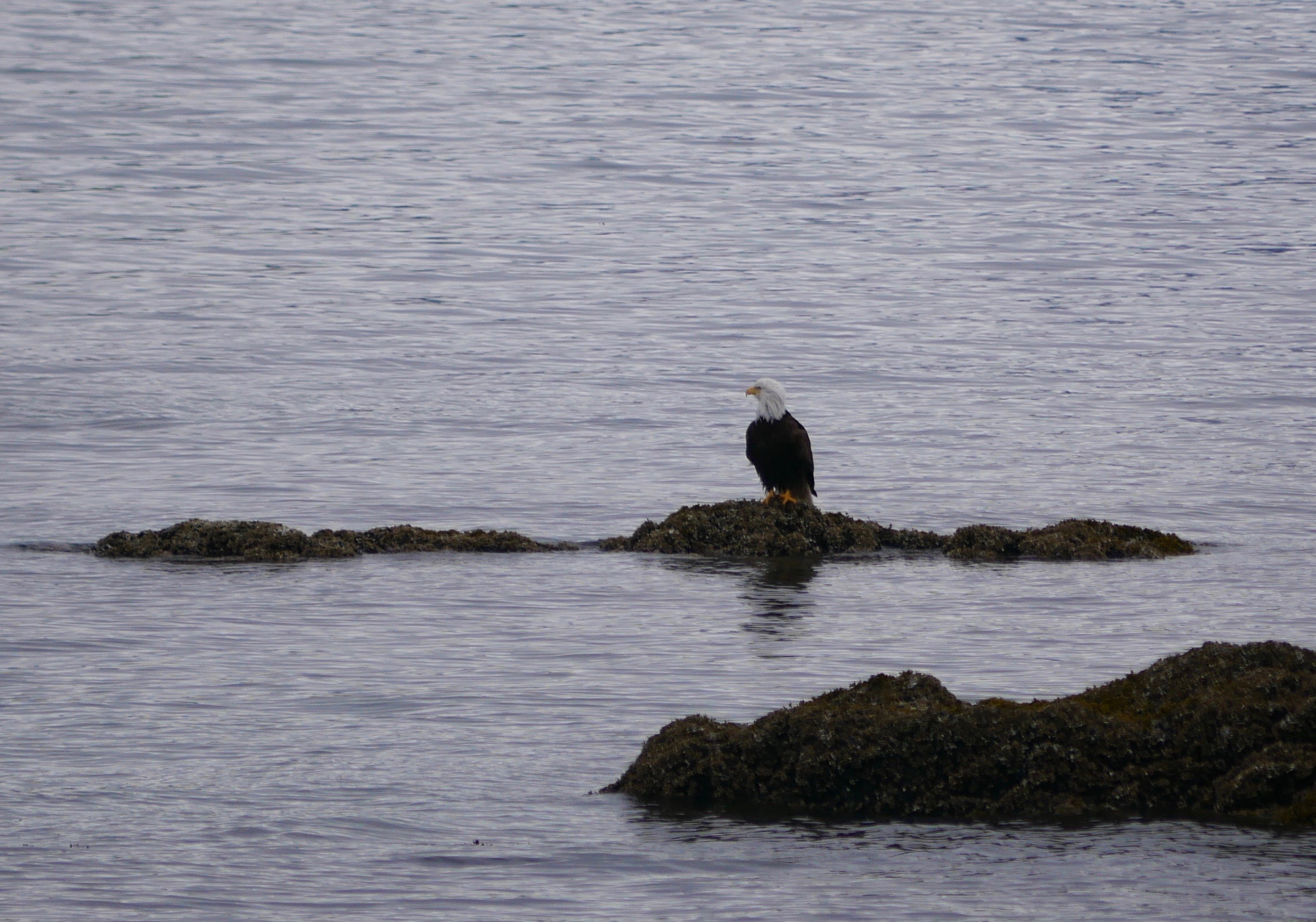 When Aki followed me onto the beach, we spotted a greater yellowlegs sandpiper in the shallows. An adult bald eagle seemed to be contemplating life from its perch on an offshore rock. On other rocks harlequin ducks slept or stretched.