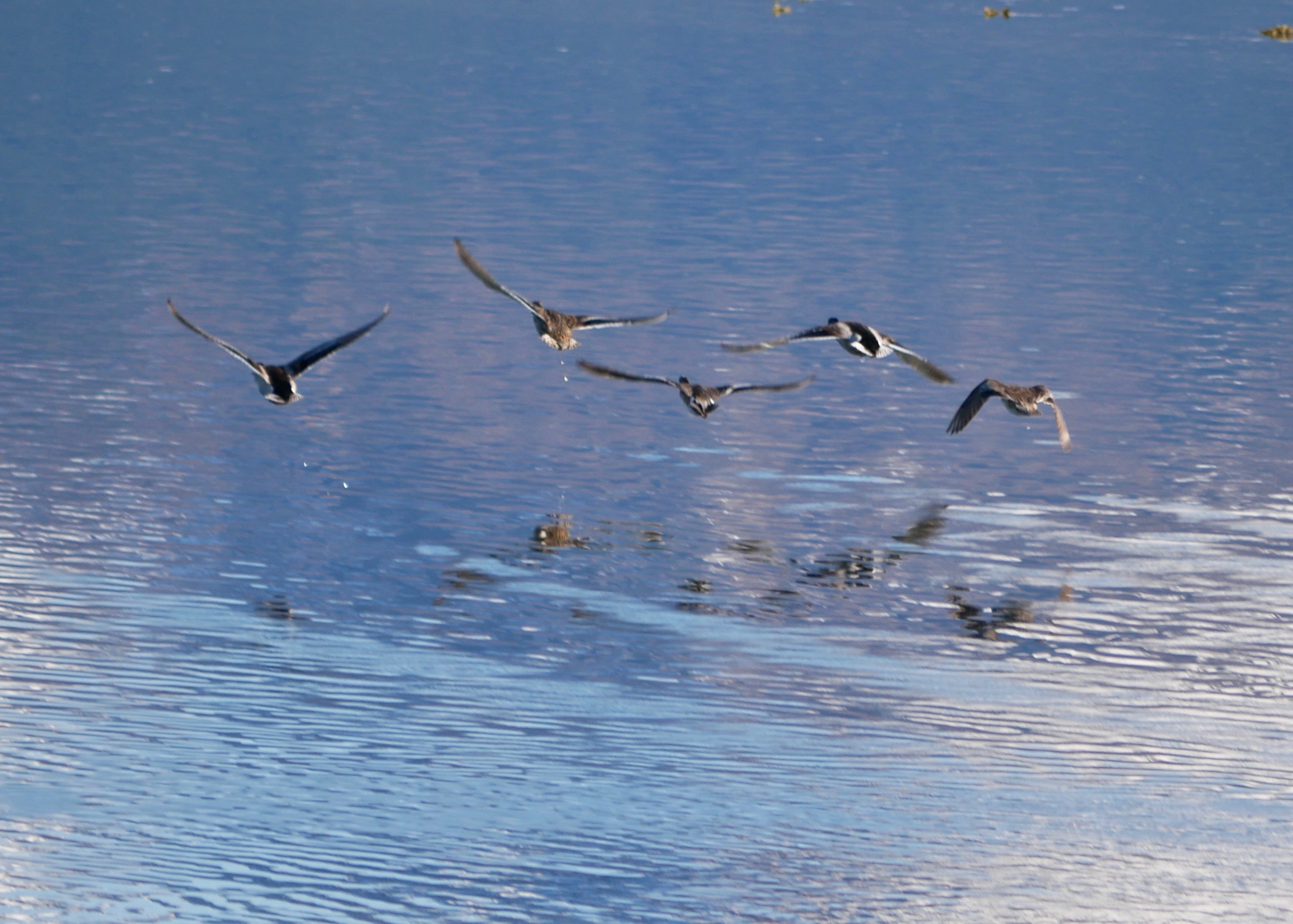 Trying on Ms. Dillard’s skin for size, I lead Aki along the creek, watching mallards in twos and threes fly over our heads and those of roosting eagles to the same meadow where I watched to swallow. Would she guess that the flooding tide forced the ducks into the air?