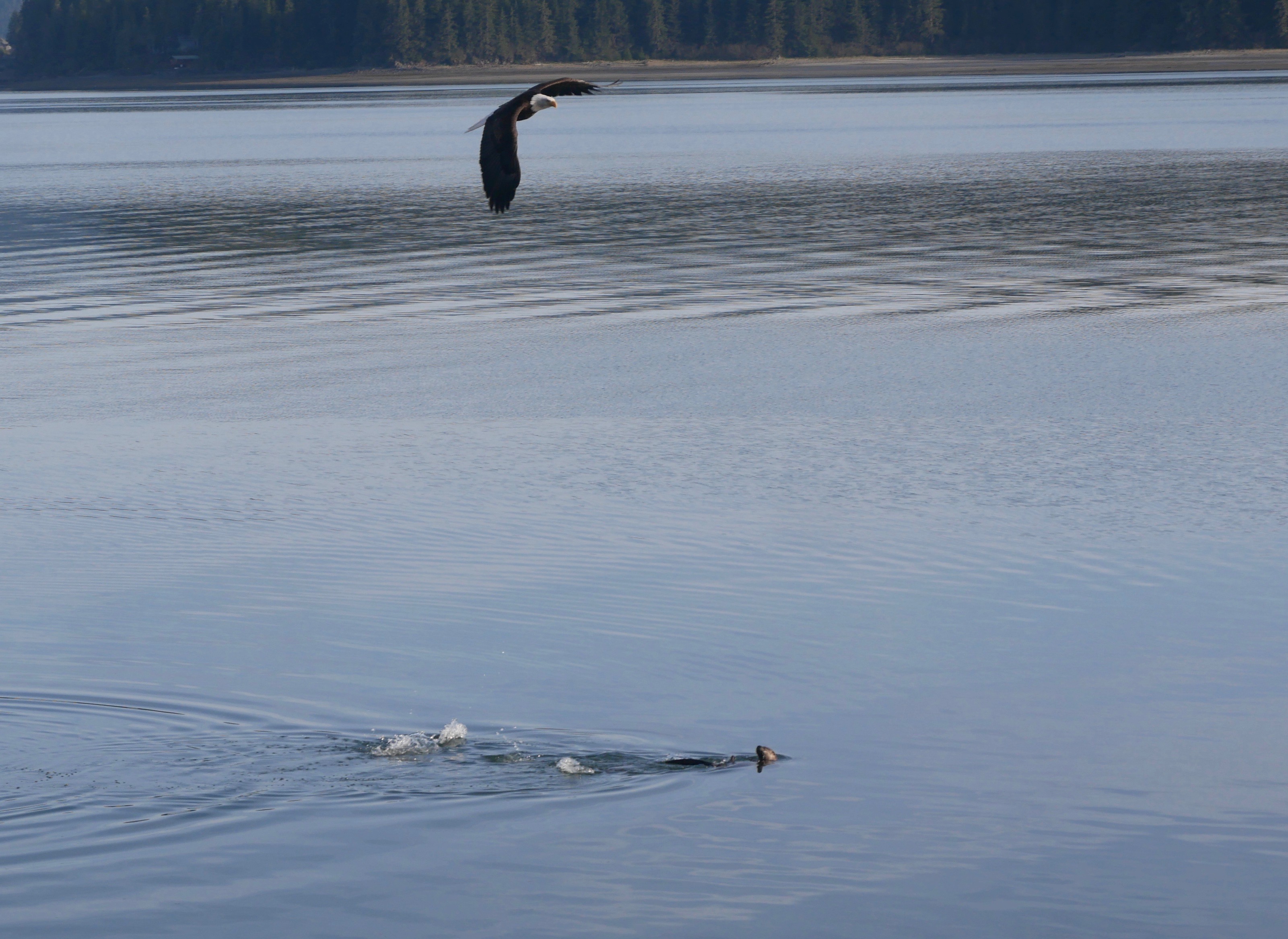 As the otters savored their quick meal, an adult bald eagle approached from the north. Rather than using the usual circling technique, this sneaky eagle cruised low over the water. The otters spotted me and dived into the water. When they looked up again, the eagle was right above them. Apparently startled, the otters panic dived as the eagle arcs toward them.