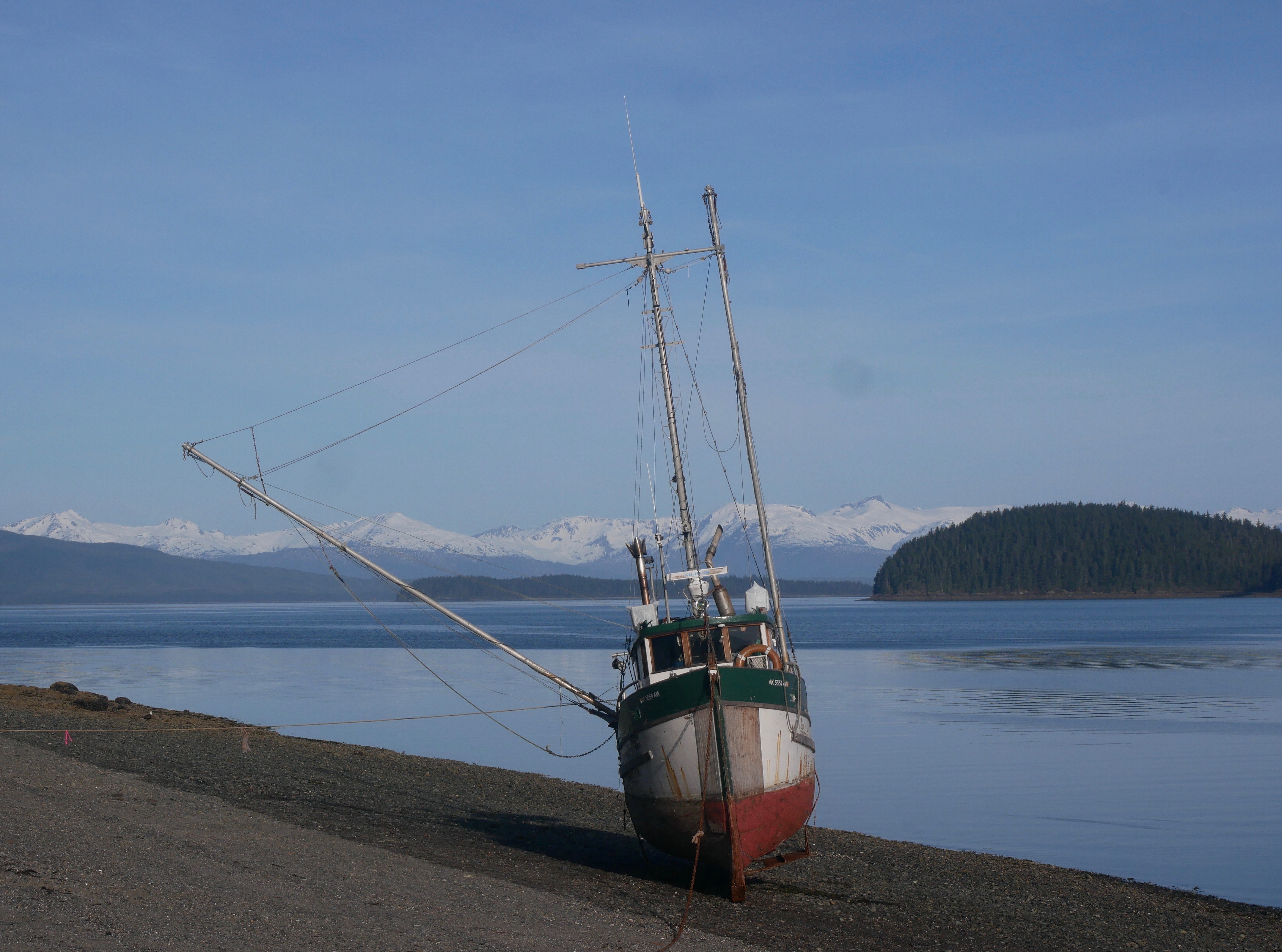 This morning, I stopped at the North Douglas Boat Ramp to take a picture of a commercial fishing boat. The boat was designed to catch salmon by trolling a collection of baited hooks through the water. Now it squats on beach usually used for launching kayaks, useless but looking as pretty as a picture.