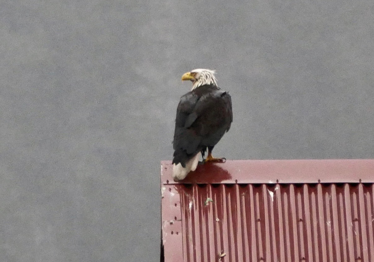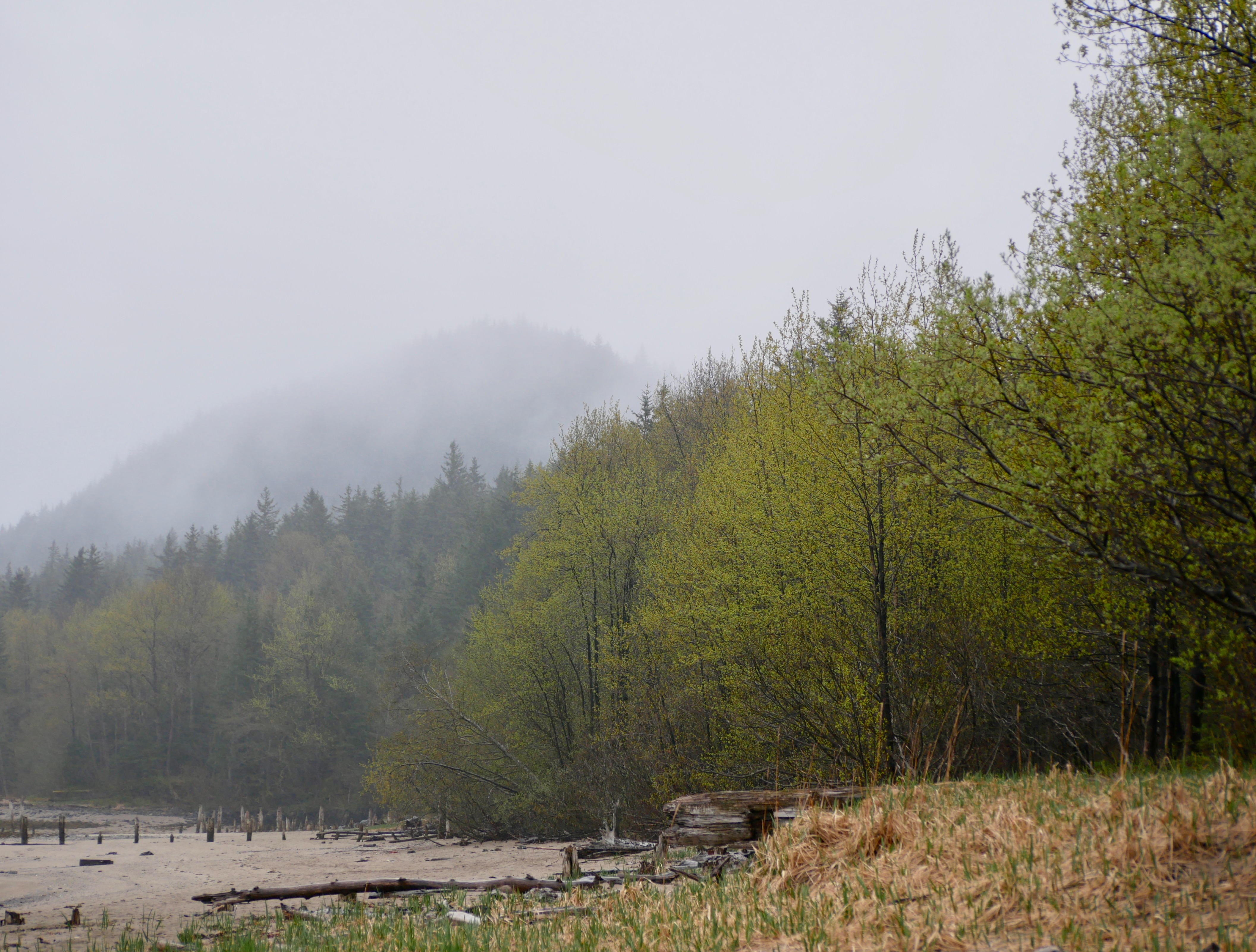 The little dog and I move through the woods and drop onto Sandy Beach. It is empty except for a bald eagle. The big bird perches on top of the old ventilator tower, its feathers soaked and askew. Wind driven rain sweeps down the beach, making me wince and Aki shiver. It feels more like early winter than summer. But salmon berry blossoms provide color along the beach’s edge. Summer can’t be denied.