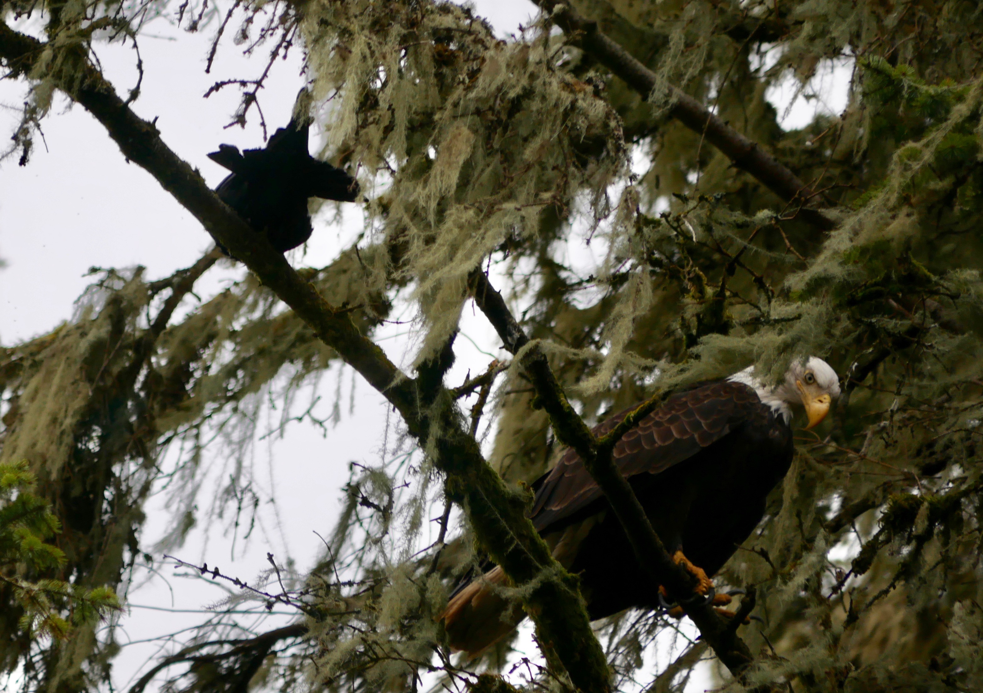 A brace of crows, each less than an eighth the mass of the eagles, landed just above the eagles. They cawed and invaded the eagle’s personal space. They weren’t going to let two eagles roost on the edge of the forest where their murder is raising this year’s brood. In seconds the eagles departed. We left too before the crows focused their attention on us. We have both been dive bombed by crows during their nesting season.