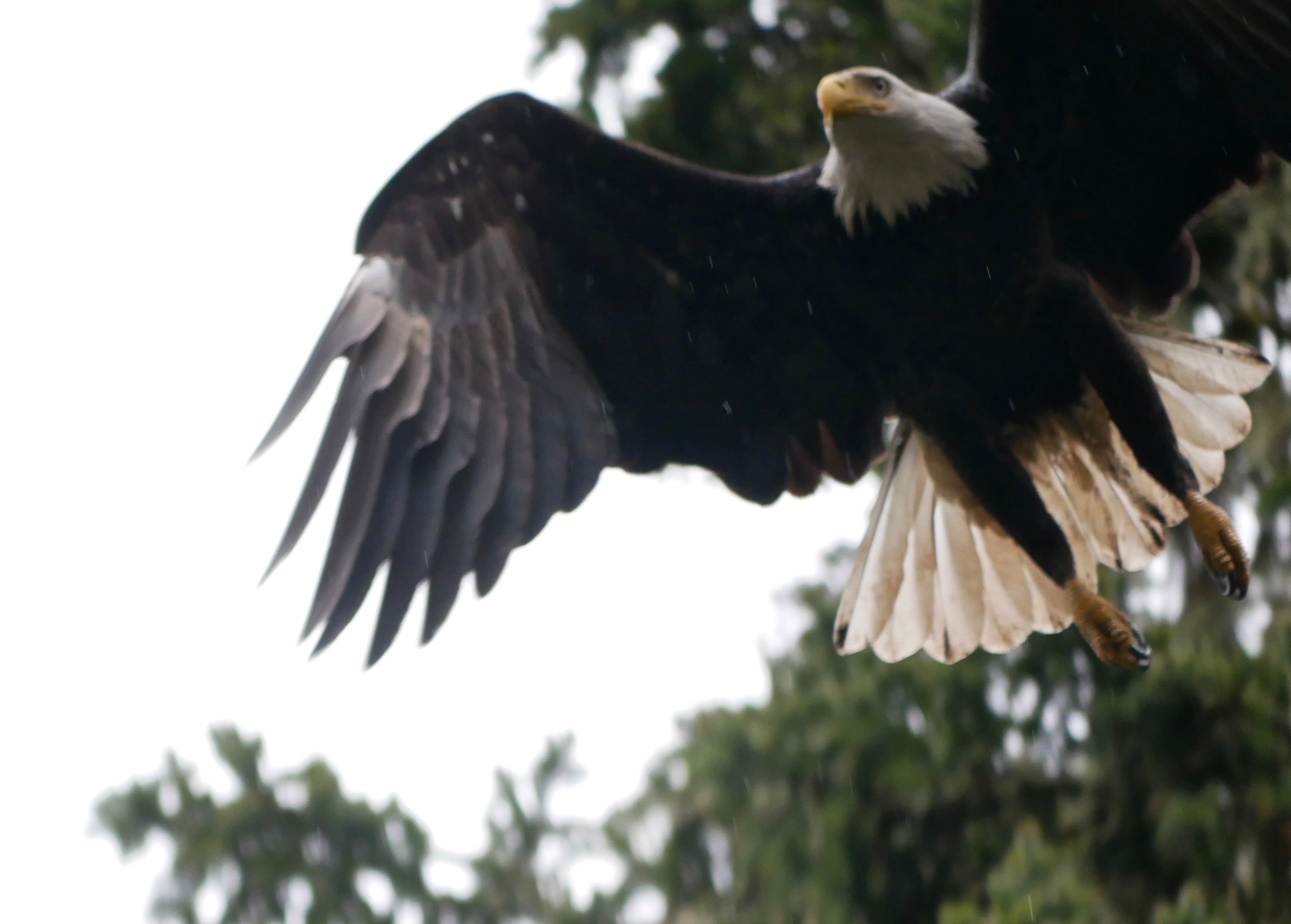 During the outbound portion of the walk, we had watched an adult bald eagle lift off from the wetlands and fly toward us. As it grew larger and larger I looked down to make sure Aki was safe. No fool, the poodle mix stood right next to my legs. Another eagle, roosted just above us in a spruce, screamed out a welcome just before the other eagle joined it.
