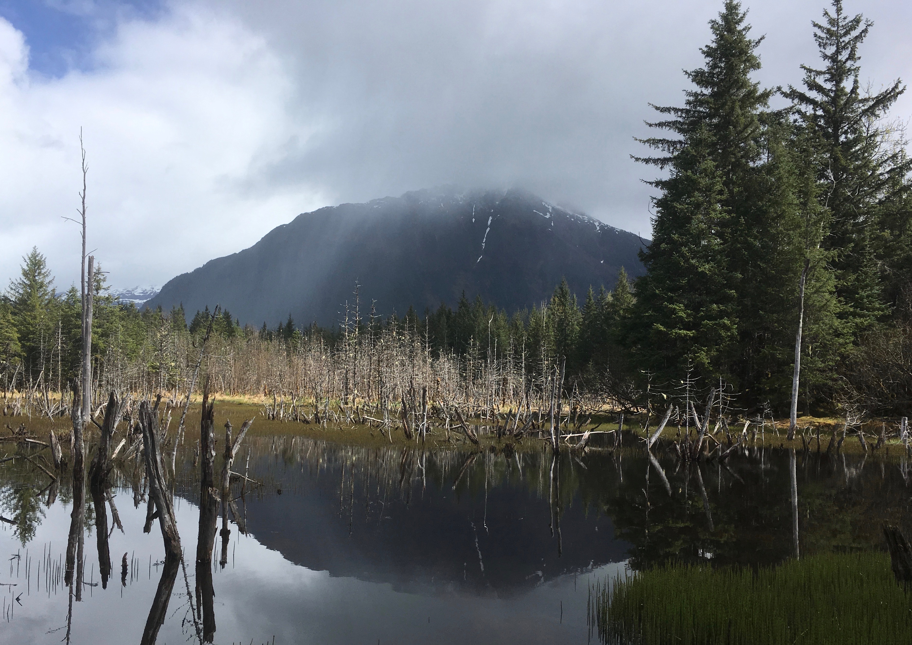 Beavers. Aki and I are on the lookout for the buck-toothed rodents on this walk across the moraine. We walk along the Mendenhall River, which is dropping after a recent run of high water. It was raining earlier, which might explain why we have the place to ourselves.
