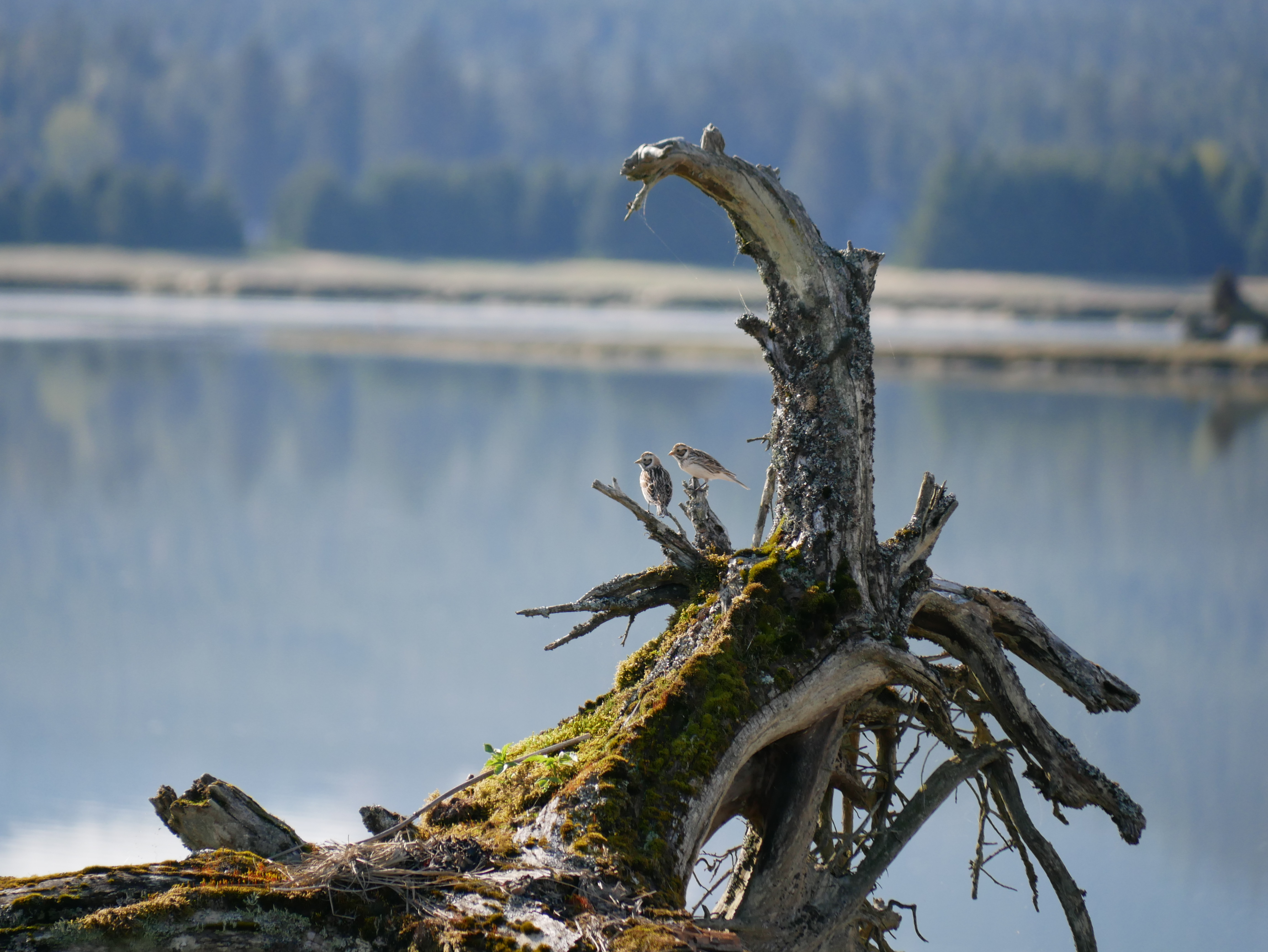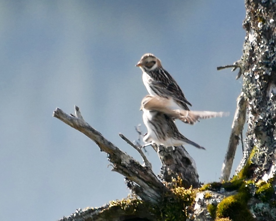 While Aki sulks with impatience at my feet, I watch the tern disappear over the river. Then I spot two sparrow-like birds perched near each other on the roots of a driftwood log. They look like female Lapland longspurs in breeding plumage. If they breed this year it will be on the northern tundra, not along this river. They must be resting up before resuming their flight north.