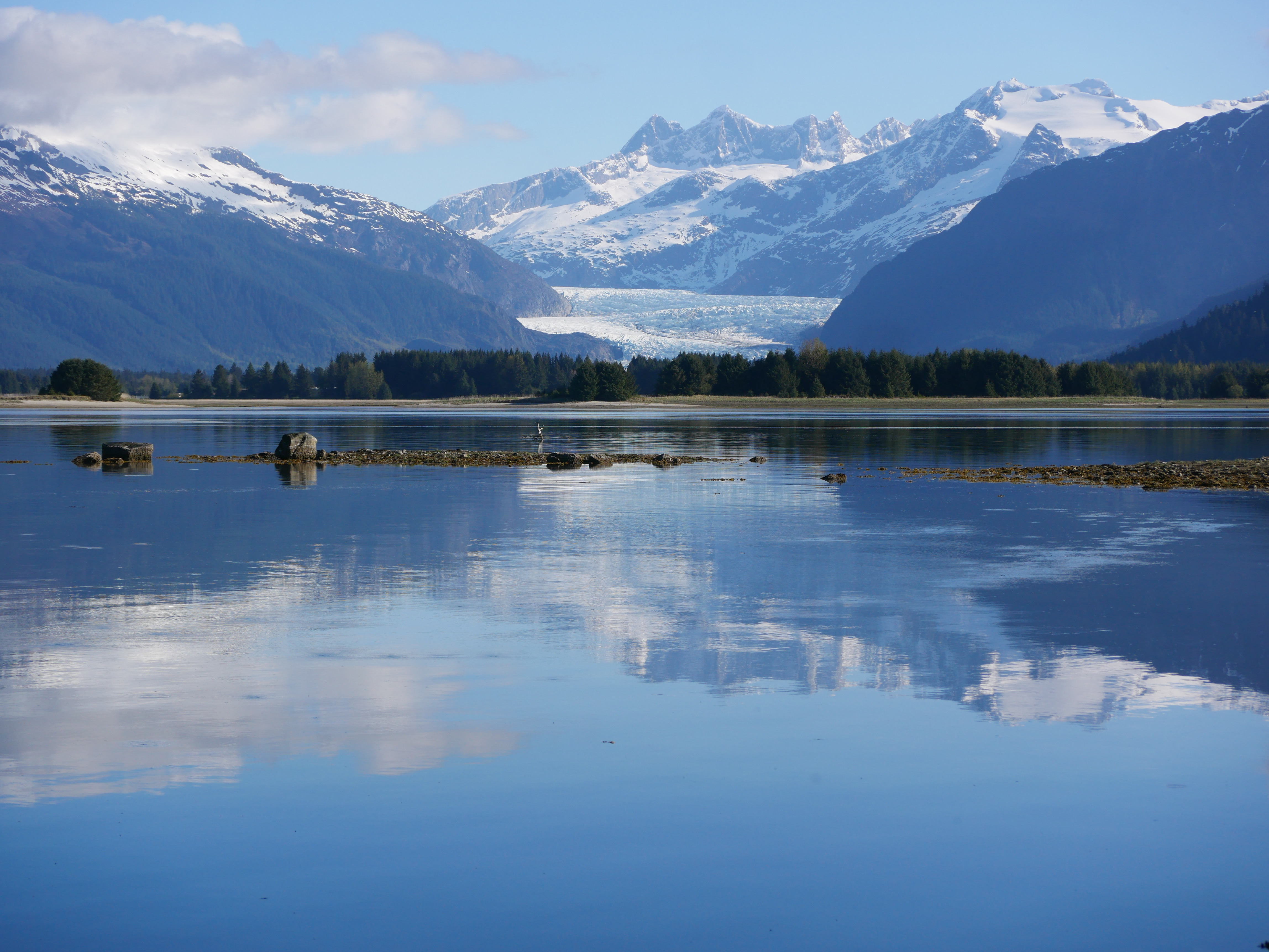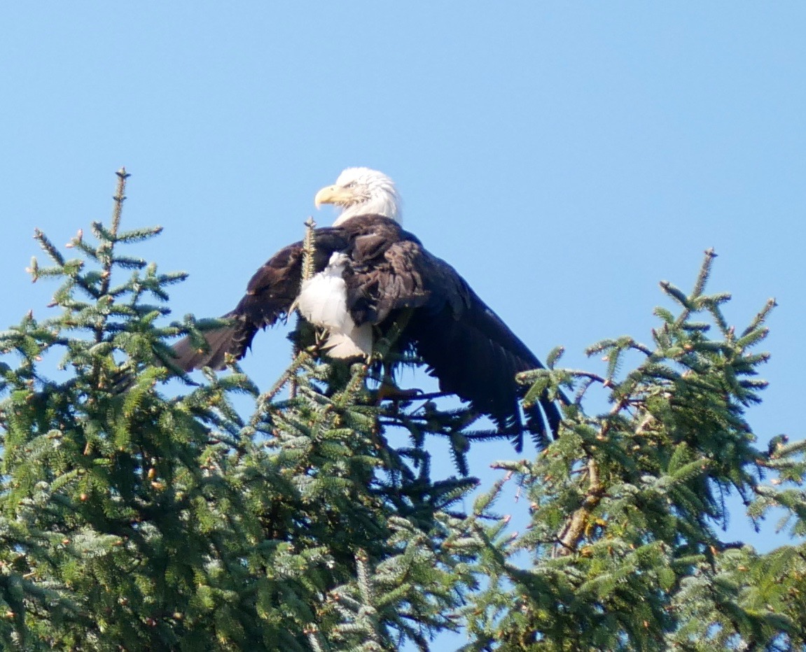 The marine layer that darkened our skies for weeks is breaking into clouds that reflect in the waters of Fritz Cove. An adult bald eagle flew out over the cove, dove on a fish and pulled up—wings wet and talons empty. Now it squats at the top of a spruce tree with its wings spread out to dry, a sour look on its face.